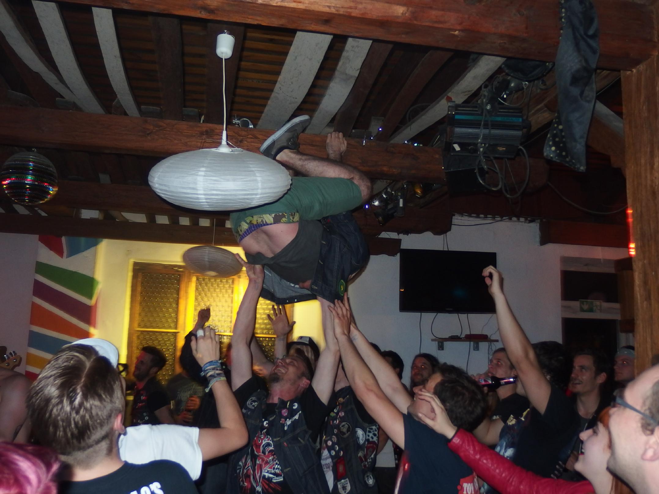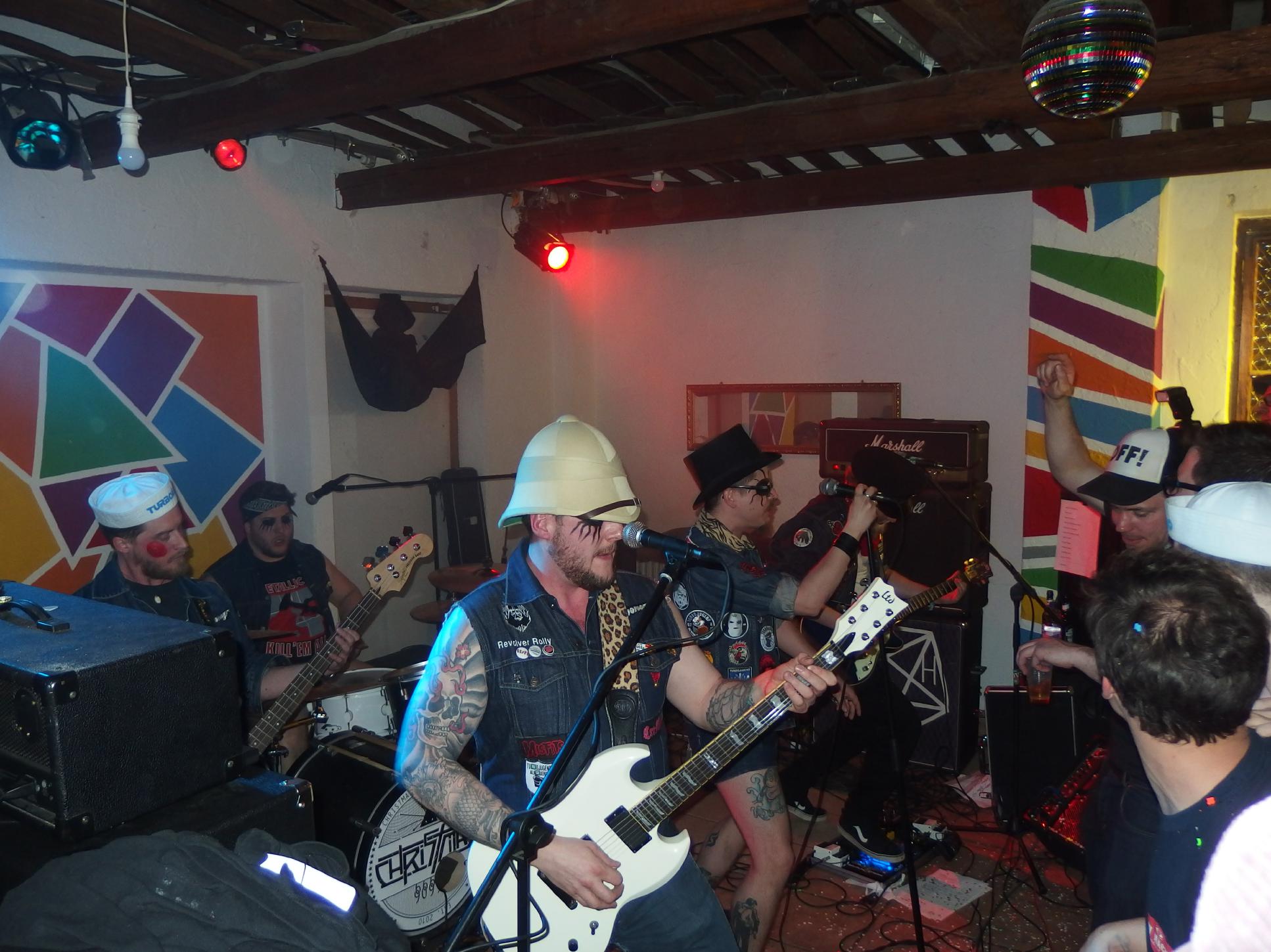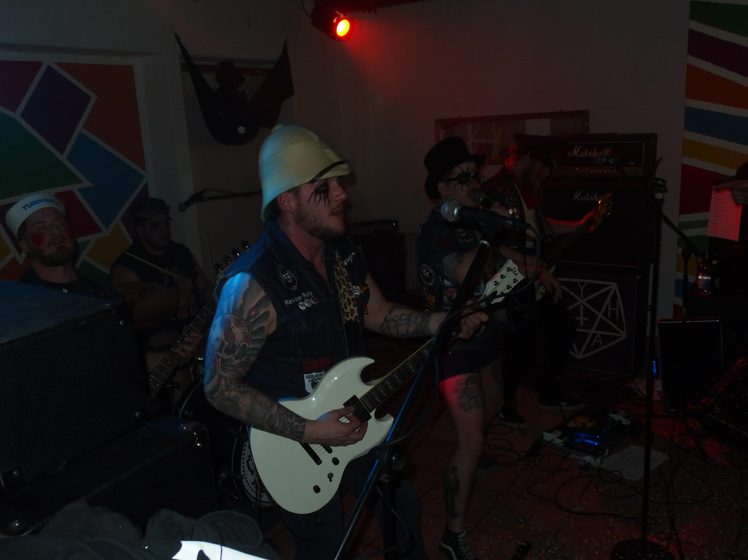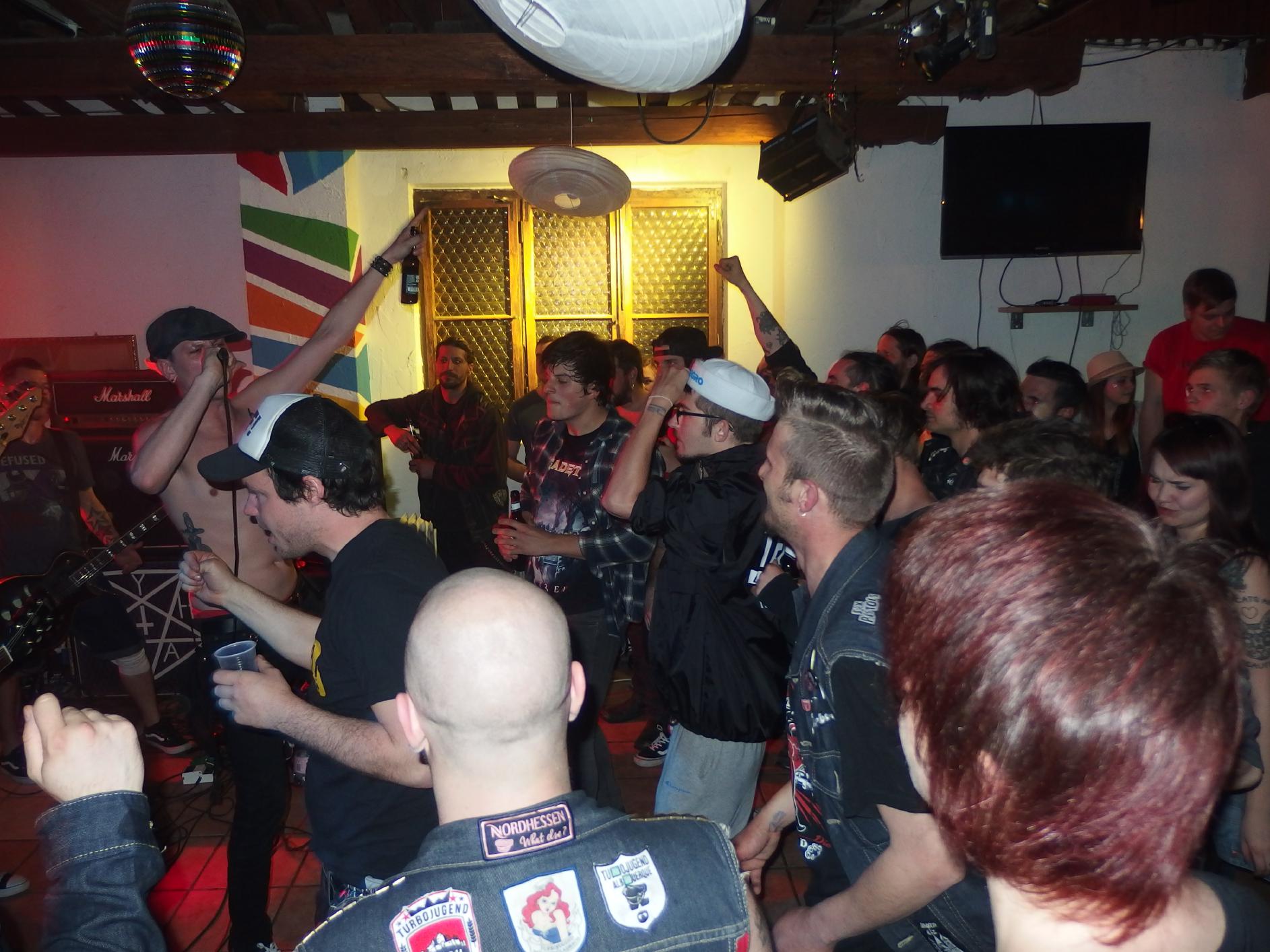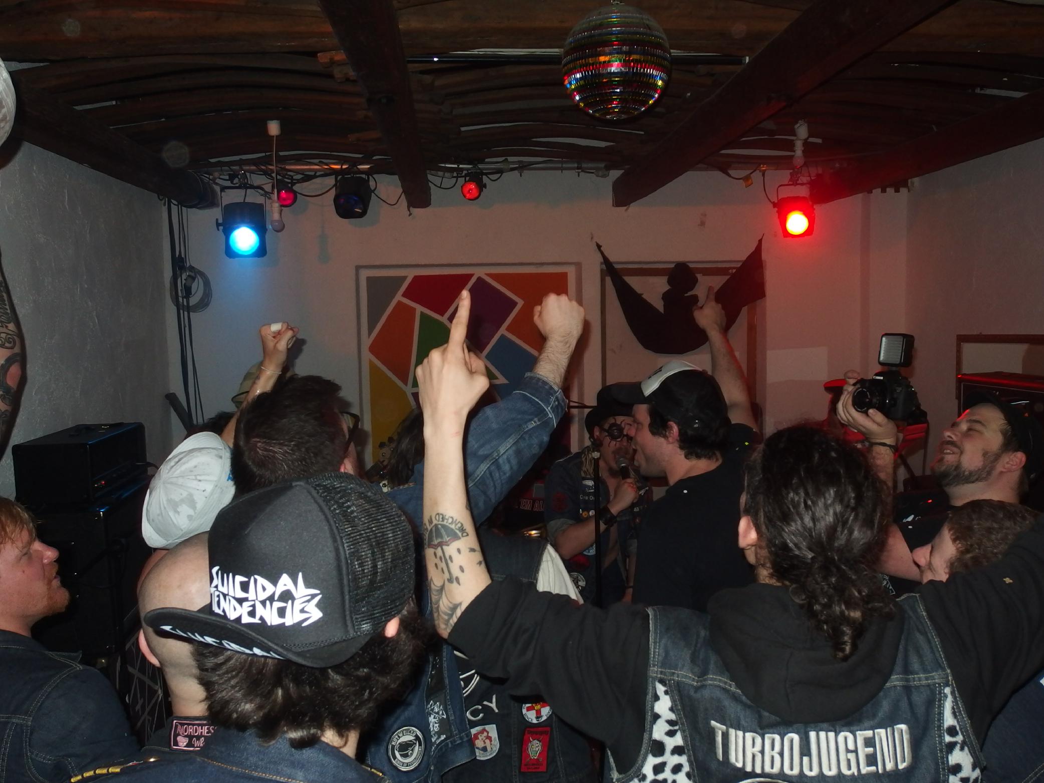 Alles, was recht ist, die Turbojugend weiß, wie man Parties veranstaltet. Die drei Turbojugenden Limbeach (Limbach), Hotweiler (Ottweiler) und Satanika (keine Ahnung) veranstalteten schon zum zweiten mal im Haus am See Wiebelskirchen eine ihrer legendären Turbojugend Parties. Ganze vier Bands standen auf dem Speiseplan, doch leider habe ich die lokale Band Urpils Jugend (auch bekannt als UpJ) verpasst. Brandneue Band, daher viele Cover, Punkrock mit Trompete… Vielleicht für den ein oder anderen was. Danach folgte die Schweizer band Marechal, die Augenzeugenberichten gemäß auch sehr gut gewesen sein soll. Motör Punk steht auf ihrer Facebook-Seite und einer von ihnen trat im Kleid auf. Naja, um 22 Uhr, als ich ankam, sah ich zuerst die örtliche Tuningmesse, die mein ankommendes Auto musterte, aber wohl nicht für gut genug befand. Billiger Technosound dröhnte mir entgegen. Gibts wohl in jeder Ortschaft… Auf dem Weg zum See wurde es dann schon freundlicher. Ganz schön viele Leute waren angereist. Die ersten bekannten Gesichter kamen mir dann auch entgegen und der Spaß konnte losgehen.