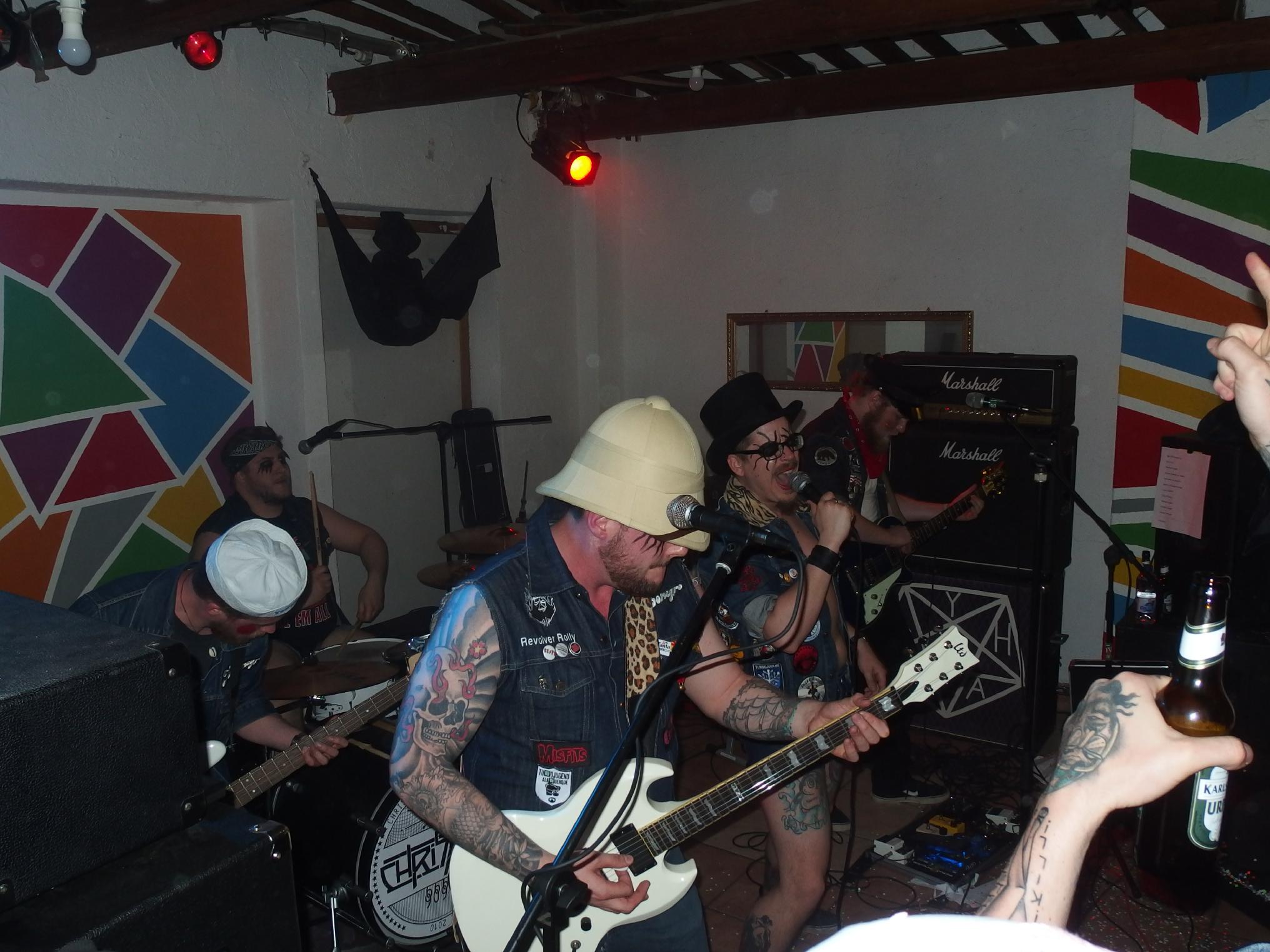 Als Turbonegro-Coverband kann man an solch einem Abend wohl nicht allzuviel falsch machen. Die Frage ist nur, was können die Cobra Dudes aus Worms liefern? Nun, einen furiosen Start konnte die Band schon mal hinlegen. Mit Age of Pamparius ging es dann auch ordentlich los und es folgte Hit auf Hit. Einem war das Gepoge aber zu viel, der arme musste blutend vor die Tür. Hoffe, es geht ihm wieder gut. Einige Bierduschen, Crowdsurfing und Pogo später machte die Technik der Band recht schnell den Garaus. Ein Amp war defekt und man versuchte es zunächst mit Kabel, dann mit Gitarre… In der Zwischenzeit wurde dann mal kurz Blitzkrieg Bop gecovert, halt nur mit einer GitarreGitarre. Hat auch geklappt. Allerdings zog sich das dann doch etwas hin, bis die Band wieder durchstarten konnte. Dennoch ein ganz toller Gig, der standesgemäß mit I Got Erection kurz nach Mitternacht sein Ende fand. Sailor Man, mein erklärtes Lieblingslied von TBNGR haben sie leider nicht gespielt.