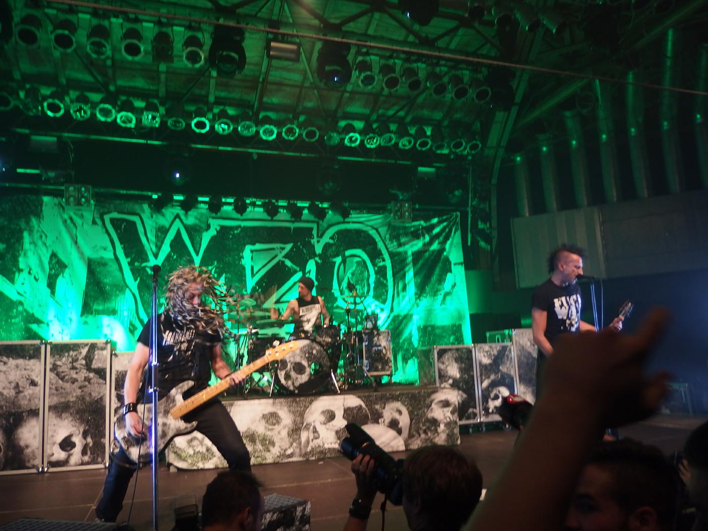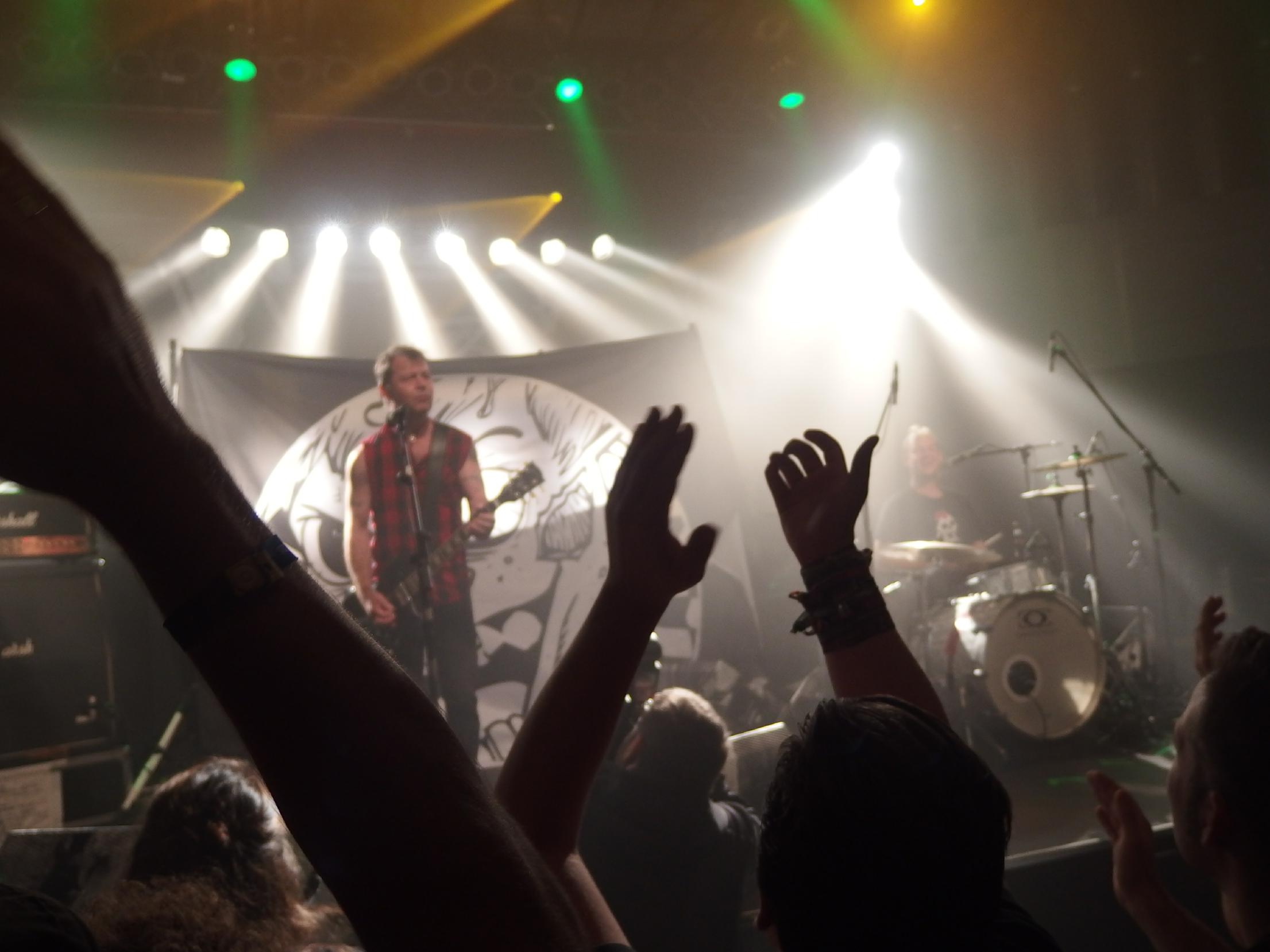 Aber dann doch nix im Vergleich zu Wizo. Verwunderlich eigentlich, denn deren beiden Comeback-Alben Punk gibt’s nicht umsonst! (Teil III) und das brandneue Der sind doch eher so naja. Klar, ein paar gute Lieder, aber auch viele Füller und zum Teil ziemlich dämliche Texte. Doch Wizo brannten an diesem Sonntag klar die Hütte ab. Bei dem Punkfest blieb glaube ich kein Auge trocken. Eröffnungssong das Highlight von Der: Adagio Danach begann eine Zeitreise, die immer wieder von Anfängen wie Klebstoff bis hin zu neuen Krachern wie Ganz klar gegen Nazis führte. leider auch dabei: das peinliche Seegurke und das textlich platte Wahlkrampf. Aber vor allem die alten Hits kamen an: Raum der Zeit, Das goldene Stück Scheiße, Kopfschuss… Und war das ein gedränge vor der Bühne. Wirklich angenehmer Pogo. man musste eigentlich nicht viel machen, kurz in die Meute und schon war man am anderen Ende der Halle. Ein bisschen Crowdsurfing wurde auch zelebriert. Wer fiel wurde hochgehoben. So muss das sein. Die band war sichtlich gerührt vom Publikum und war auch scharf auf den dritten Gig ihrer Tour.