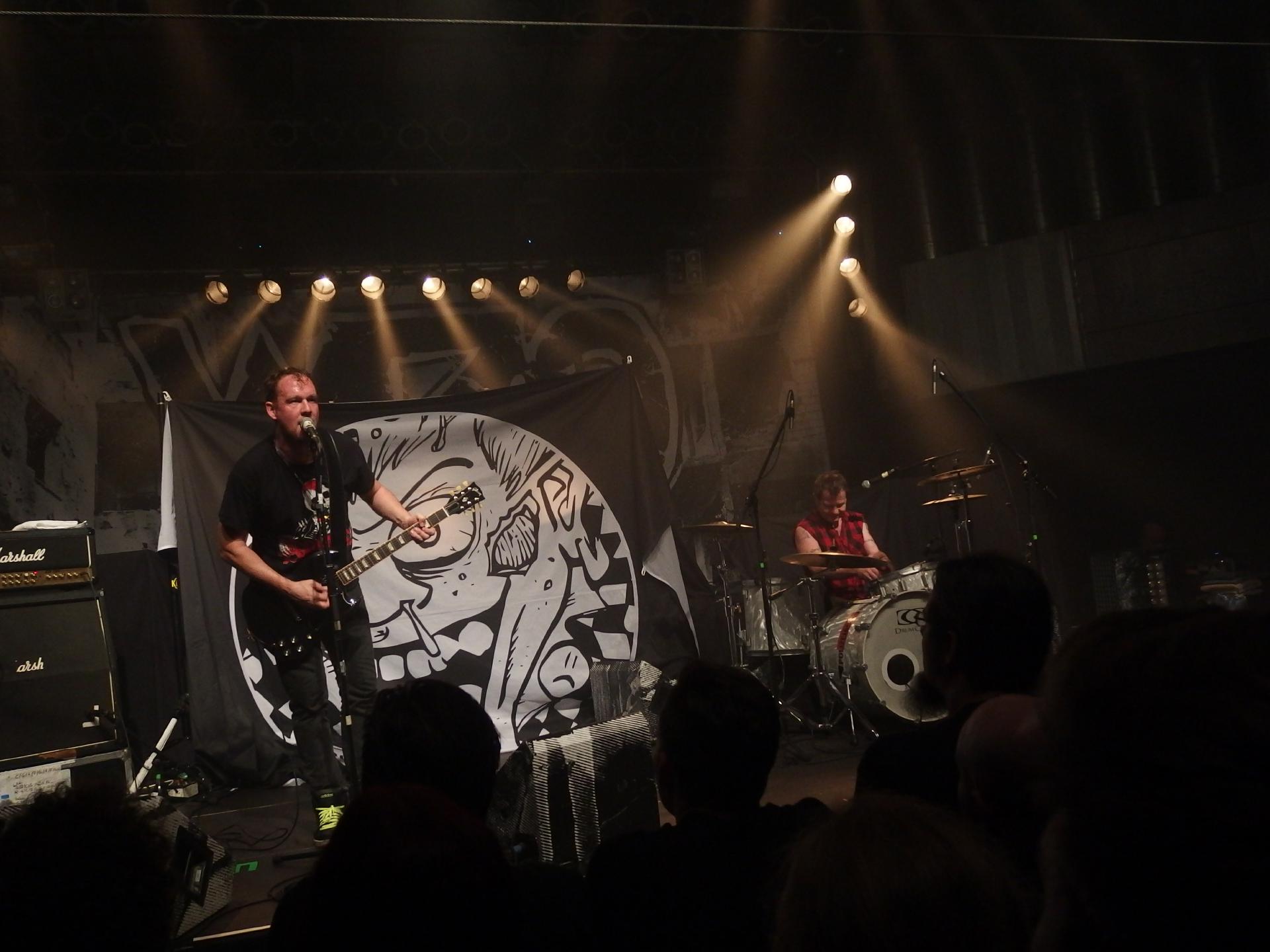 Die Abstürzenden Brieftauben haben vor kurzem erst ein famoses neues Album hingelegt. Unser Review zu Doofgesagte leben länger findet sich hier. Dem Kollegen kann ich bedenkenlos zustimmen, ein fantastisches Album einer lange tot geglaubten Band. Mit Olli Bockmist am Schlagzeug und dem alten Schlagzeuger Mirco „Micro“ Bogumil hält das Duo die Fahne des lange totgeglaubten Funpunk hoch, inklusive klarer antifaschistischer Bekenntnisse. Ich war gespannt, wie die Band mit dem neuen Material klar kommt und freute mich eigentlich mehr auf die Tauben als auf Wizo. Nun, enttäuscht wurde ich auch nicht. Los gings mit Das Grauen Teil 3. Die beiden harmonieren sehr gut zusammen und schaffen eine würdevolle Weiterführung des mit dem viel zu früh verstorbenen Konrad Kittner begonnen Projekts. Ein paar Dinge trübten jedoch die Show. Offensichtlich war niemand da, der der Band genau sagte, wie lange sie spielen durften, so dass es ab und an zu etwas irritierenden Momenten kam. Auch fand ich, dass der Fokus zu sehr auf den alten Stücken lag. Immerhin haben die zwei ein bärenstarkes Album veröffentlicht, das will nun mal auch promotet werden. Naja, es war auf jden Fall für alte und neue Fans genug dabei. Nie wieder Pegida ist ein super Ohrwurm (leider stößt mir dabei die Textzeile Geistig behinderte Neofaschisten übel auf!) und zur Überraschung aller kündigte die Band auch eine neue Single namens Frauke, Halt’s Maul an und spielten das Titellied. Zwischendurch wurden auch mal die Instrumente gewechselt. Auf der Tanzfläche war auch ein bisschen was los. Was fehlte: Ganz klar Die Blumen sind für die, Herr Polizist, im Original von Heidi Franke udn ein Highlight des an Highlight reichen neuen Albums. Stattdessen gabs Ich will Spaßvon Markus, klar ein Standard der Band. Den alten Fans dürfte Im Strandbad gefehlt haben, das wohl zu proben vergessen wurde. Dieses wurde vehement gefordert, dann wurde stattdessen ein Medley gespielt. Naja, auch ok. Highlights neben den vorgenannten Songs: Steht ein Mädchen…, das gerne mitgesungen wurde, Keine Termine, das auf einem Harald-Juhnke-Zitat basiert, und die neue Taubenhymne Pieke Punk Guter Gig, sicherlich…