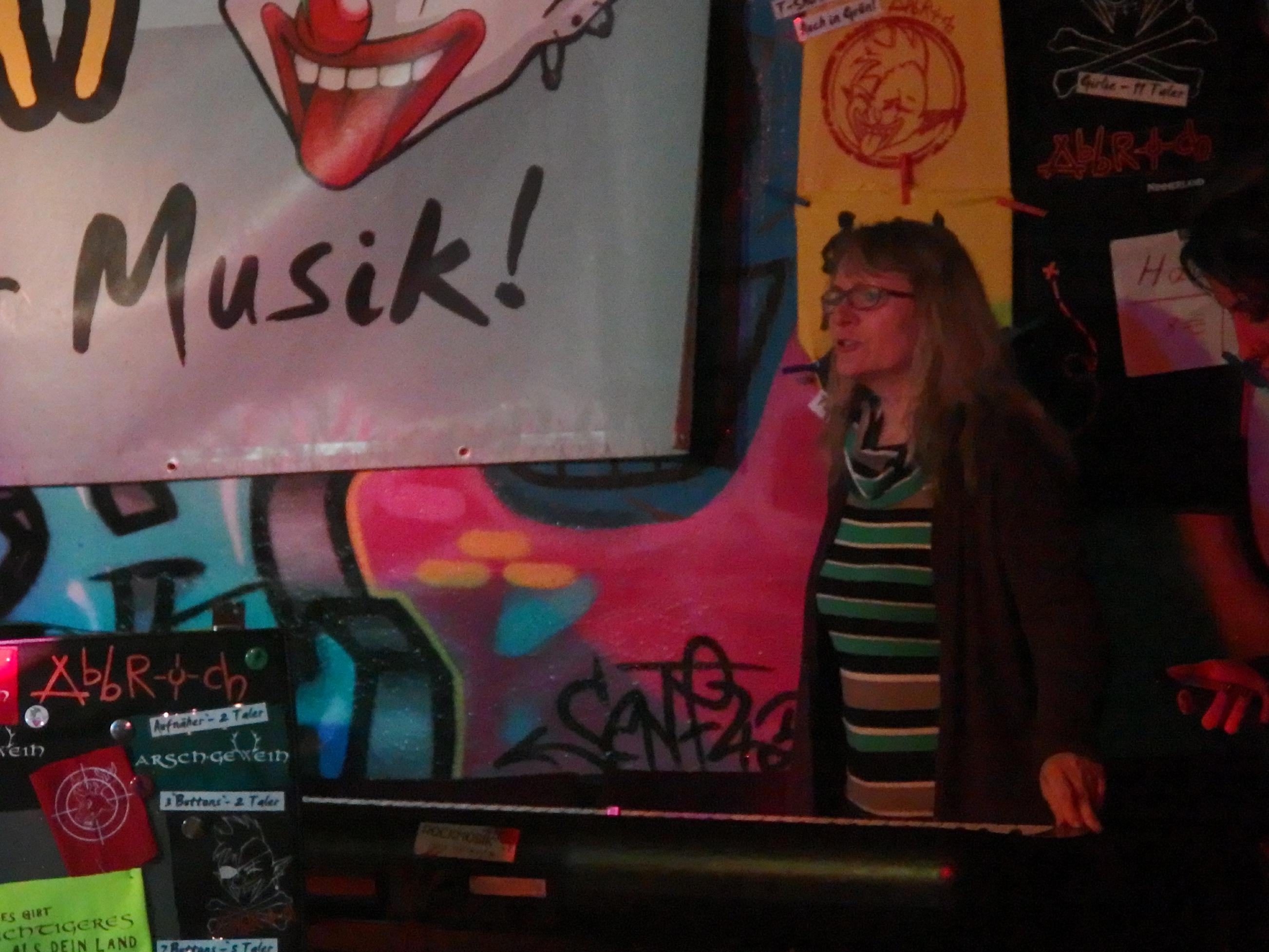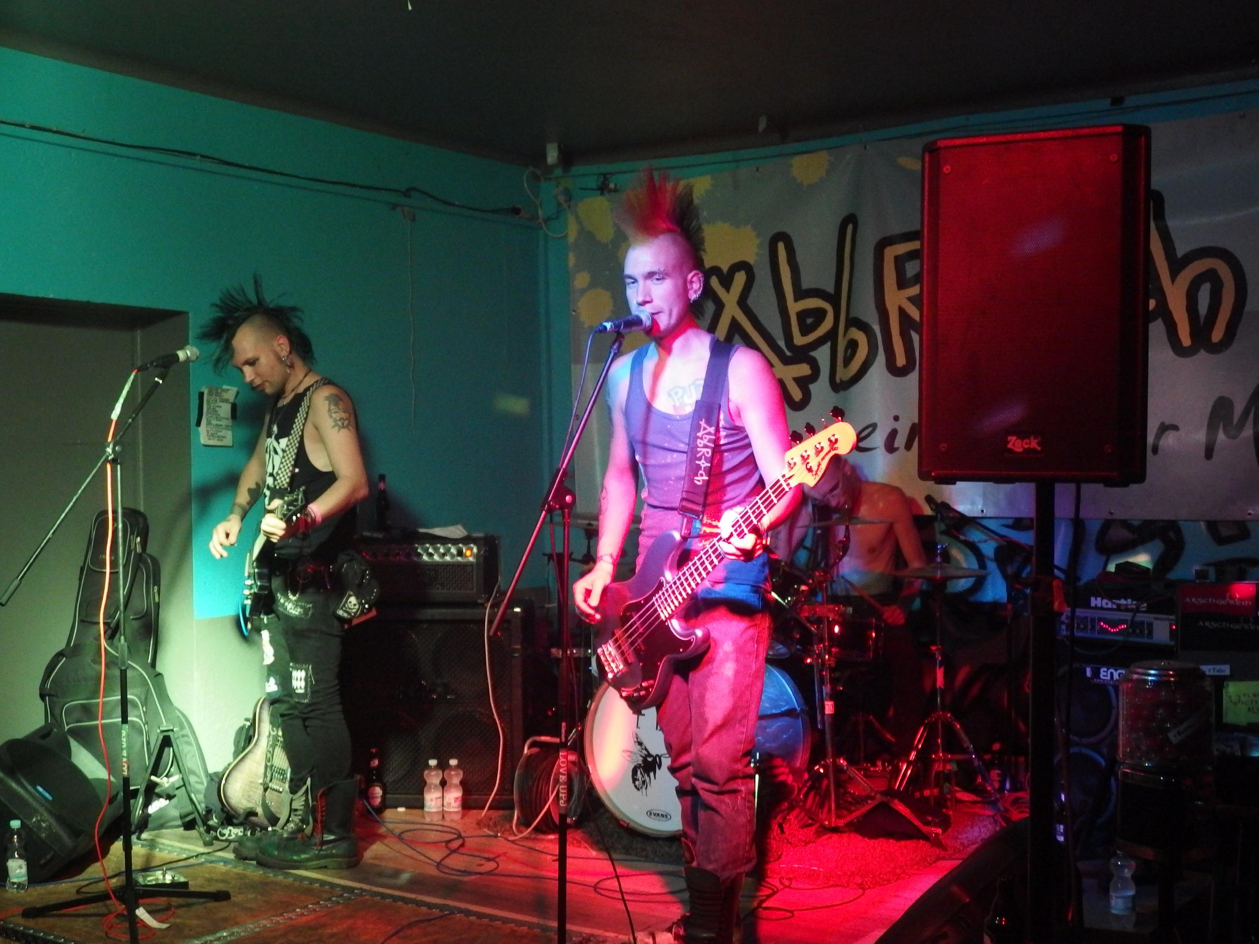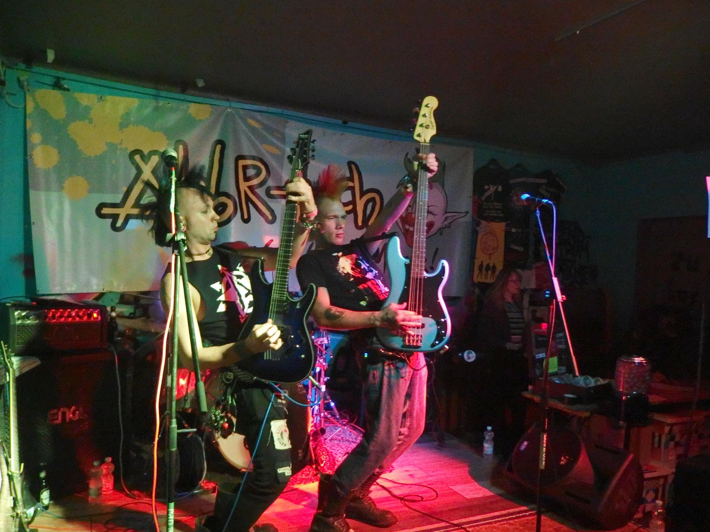 Abbruch aus Berlin hatten es dann schwer. Klar, kurz nach 12 fahren hier langsam die letzten Züge und den Lokalheldenbonus gibts auch nicht. Dafür haben sie Muddi mitgebracht. Kein Scherz, zur festen Besetzung gehört Muddi, die Keyboarderin des Haufens, die alle Texte mitsingen kann und permanent gute Laune verbreitet. Vorgestellt als „Meine Muddi, seine Muddi und auch ihm seine Muddi, eigentlich unser aller Muddi“ weiß ich nicht genau, wessen Muddi sie jetzt wirklich ist, aber da zwei aus der (an diesem Abend) vierköpfigen Band Brüder sind, kanns ja auch stimmen. Die Stimmung scheint zunächst etwas gedrückt, insbesondere der Schlagzeuger scheint nicht so gut drauf zu sein, doch die beiden Frontschweine (schaut euch den Helm, den sie von Scherbenschädel stibizt haben auf den Fotos unten an und ihr wisst was ich meine) wissen den Laden umzuhauen. immerhin waren ja doch noch so ca. 20-30 Hanseln da. Gut gelaunt und witzig führte insbesondere Bassist Daniel durch den Abend. Der Drei-Akkorde-Punk der Band macht auch durchaus Spaß. Dennoch werden auch ernste Themen auf lustige Weise aufgegriffen und so Gesellschaftskritik geübt. Dazwischen passiert ein bisserl Pogo, dumme Sprüche und es finden sich sogar fünf Walzerpärchen. Bester Song: Amoklauf vom 2011er Album Aus dem Keller. Nett auch das Er gehört zu mir-Cover. Bis weit nach 1 Uhr zockt die Band ihr Programm. Langweilig wurde es nicht und so kann die Band den Auftritt wohl als Erfolg verbuchen. Wikipedia-Artikel folgt in den nächsten Tagen 😉
