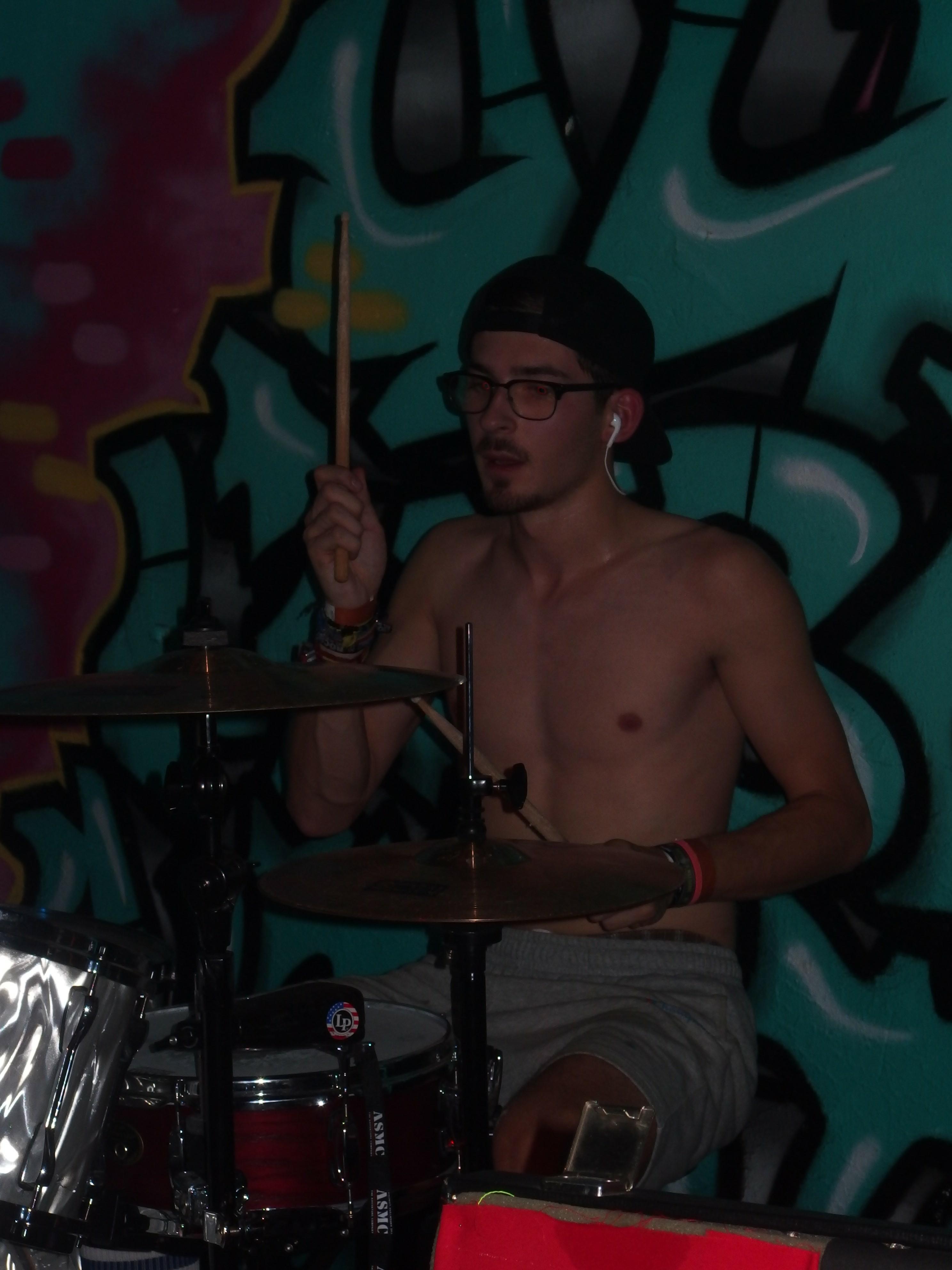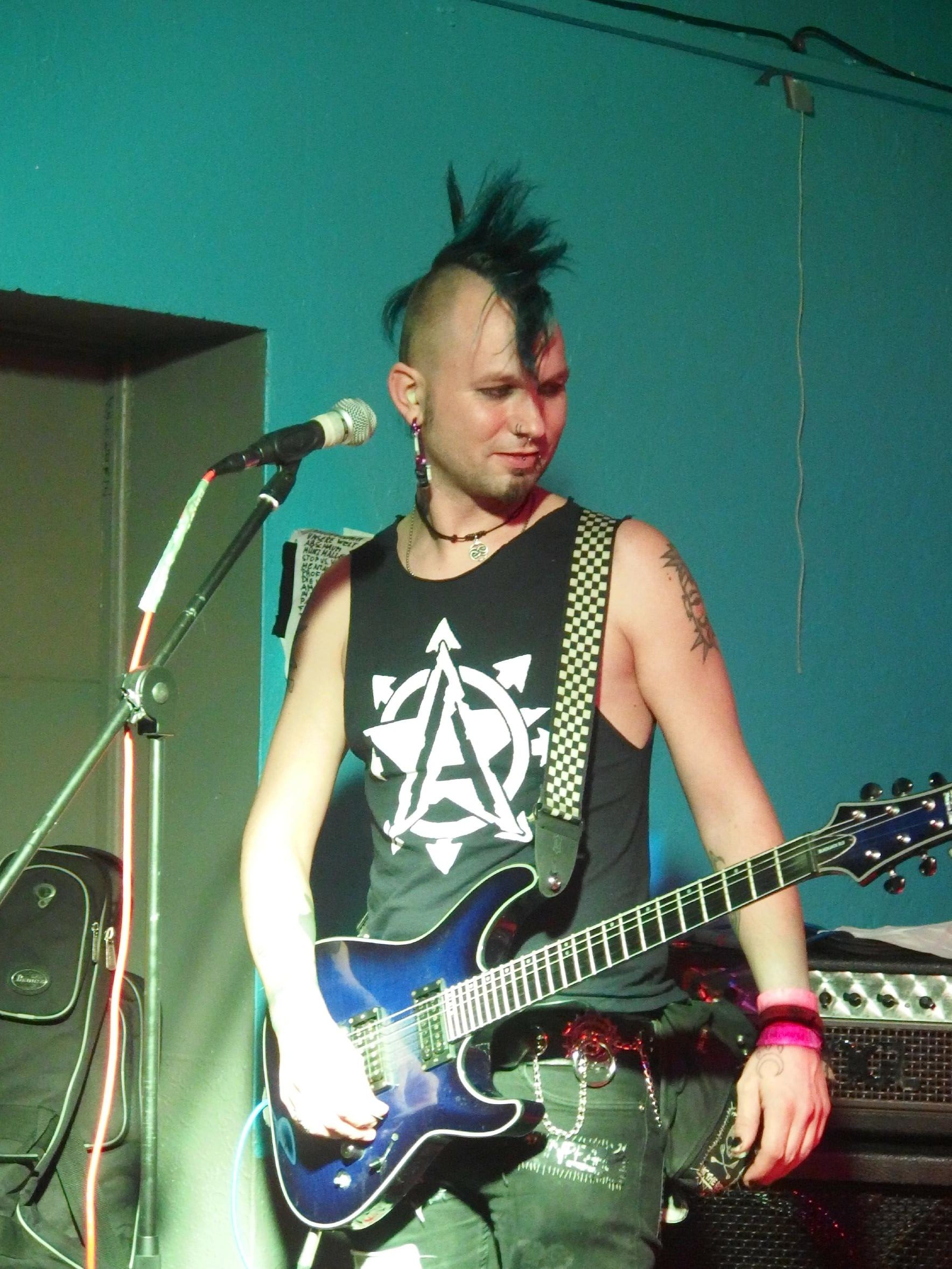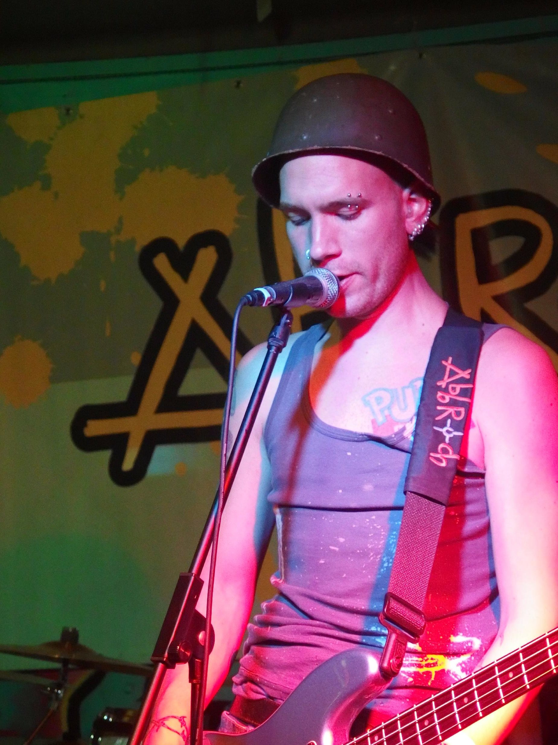 Abbruch aus Berlin hatten es dann schwer. Klar, kurz nach 12 fahren hier langsam die letzten Züge und den Lokalheldenbonus gibts auch nicht. Dafür haben sie Muddi mitgebracht. Kein Scherz, zur festen Besetzung gehört Muddi, die Keyboarderin des Haufens, die alle Texte mitsingen kann und permanent gute Laune verbreitet. Vorgestellt als „Meine Muddi, seine Muddi und auch ihm seine Muddi, eigentlich unser aller Muddi“ weiß ich nicht genau, wessen Muddi sie jetzt wirklich ist, aber da zwei aus der (an diesem Abend) vierköpfigen Band Brüder sind, kanns ja auch stimmen. Die Stimmung scheint zunächst etwas gedrückt, insbesondere der Schlagzeuger scheint nicht so gut drauf zu sein, doch die beiden Frontschweine (schaut euch den Helm, den sie von Scherbenschädel stibizt haben auf den Fotos unten an und ihr wisst was ich meine) wissen den Laden umzuhauen. immerhin waren ja doch noch so ca. 20-30 Hanseln da. Gut gelaunt und witzig führte insbesondere Bassist Daniel durch den Abend. Der Drei-Akkorde-Punk der Band macht auch durchaus Spaß. Dennoch werden auch ernste Themen auf lustige Weise aufgegriffen und so Gesellschaftskritik geübt. Dazwischen passiert ein bisserl Pogo, dumme Sprüche und es finden sich sogar fünf Walzerpärchen. Bester Song: Amoklauf vom 2011er Album Aus dem Keller. Nett auch das Er gehört zu mir-Cover. Bis weit nach 1 Uhr zockt die Band ihr Programm. Langweilig wurde es nicht und so kann die Band den Auftritt wohl als Erfolg verbuchen. Wikipedia-Artikel folgt in den nächsten Tagen 😉
