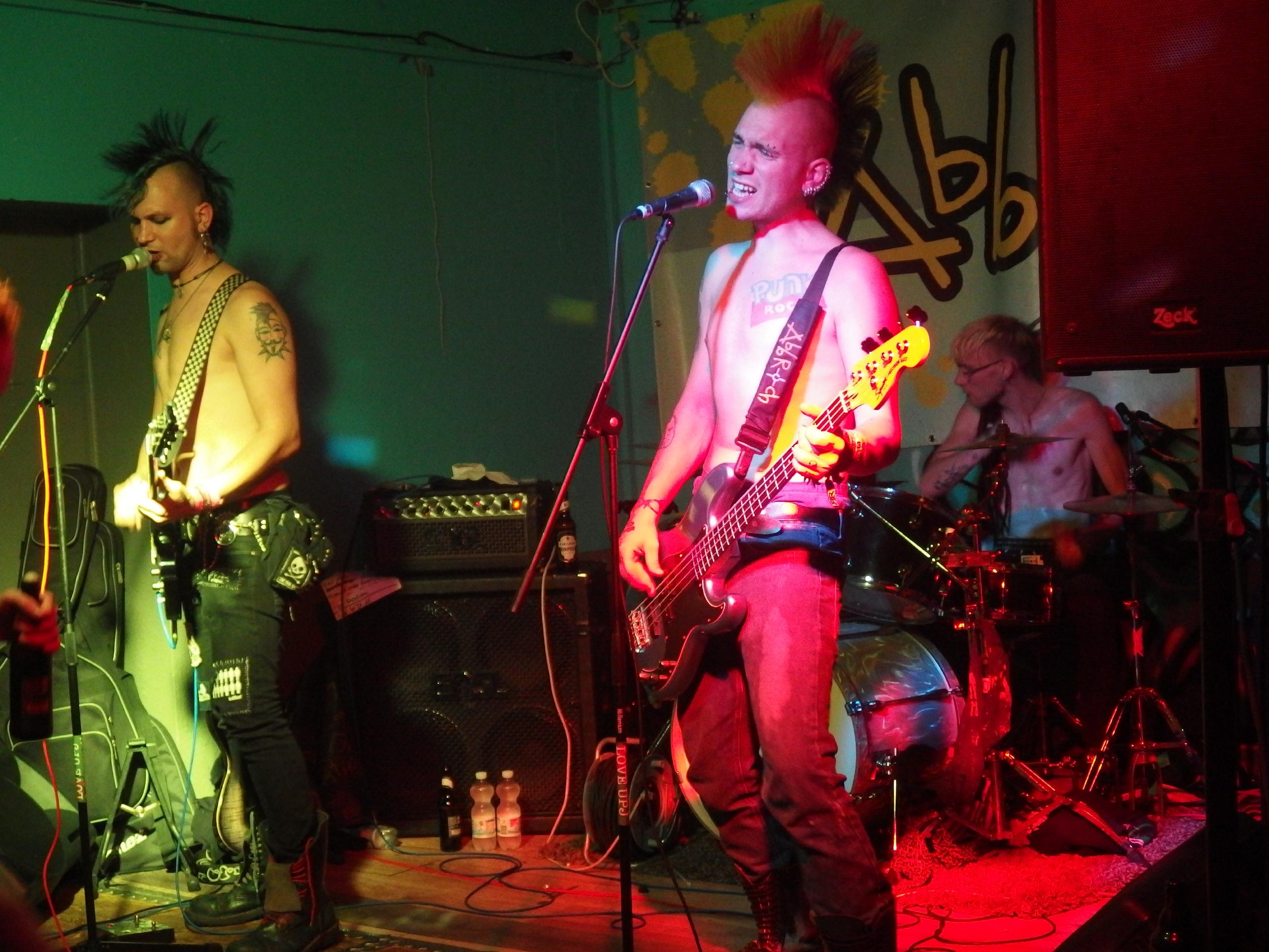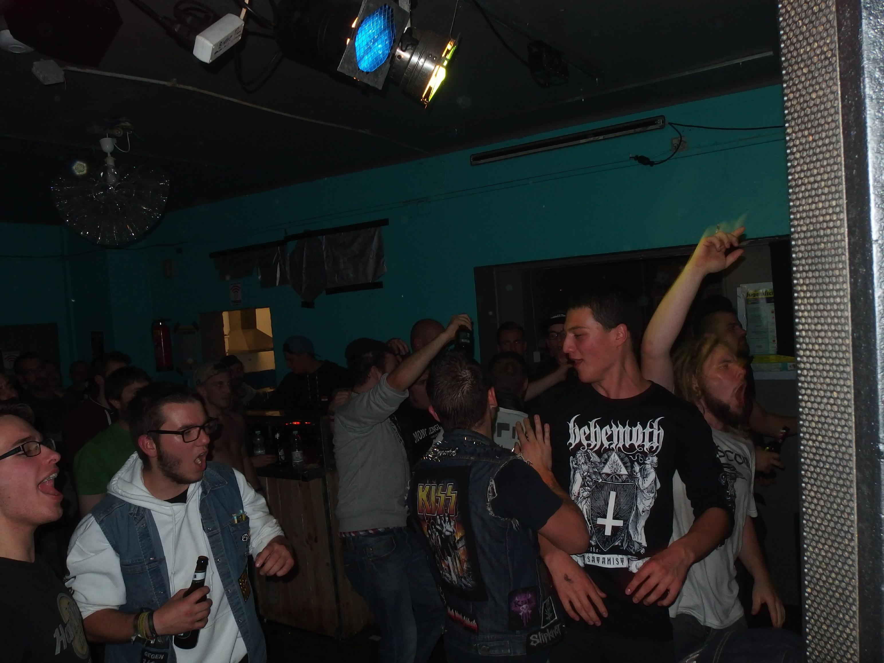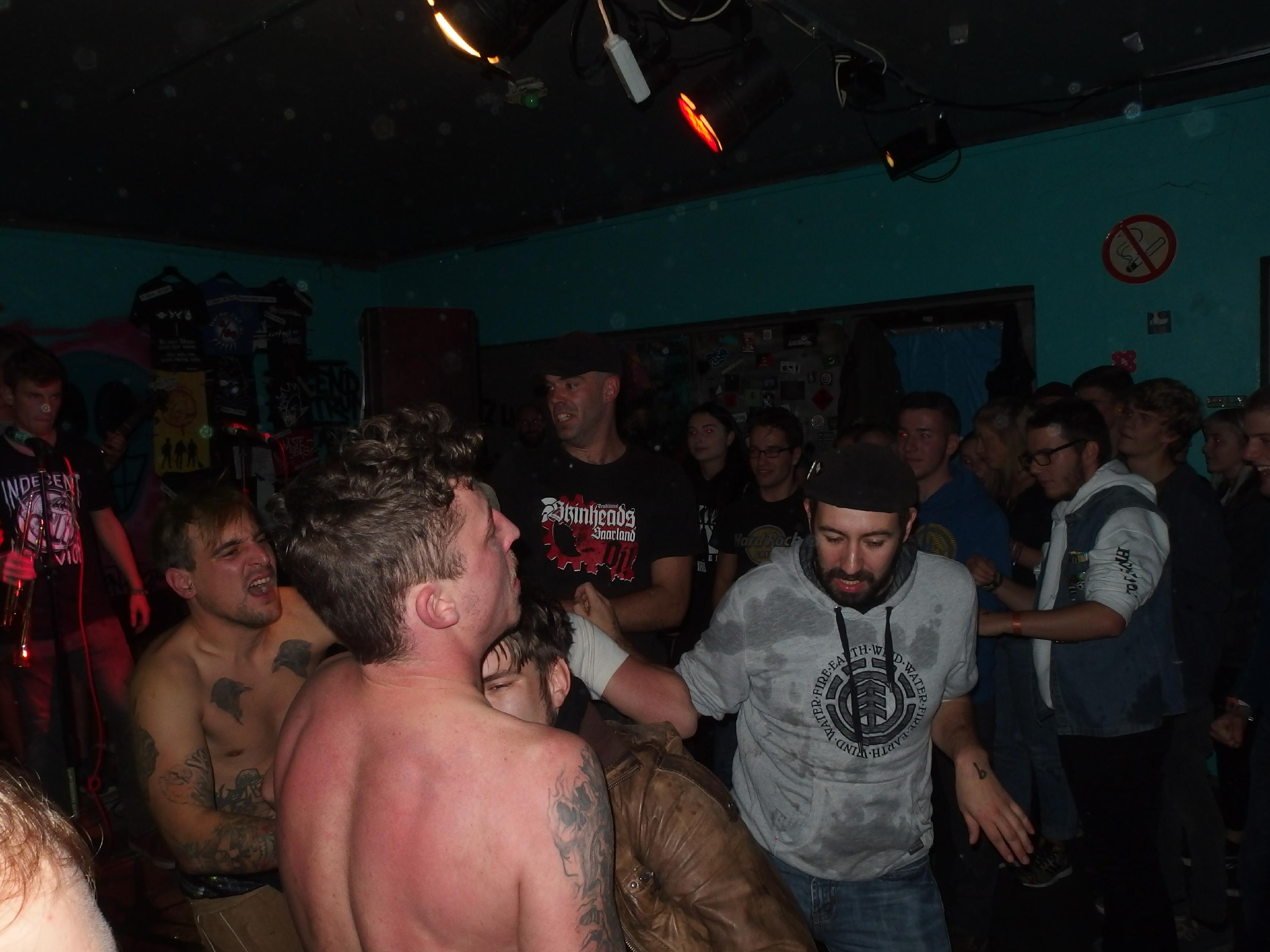 Als ich das Etablissement betrat, war ich doch etwas verwundert, wie viele Menschen angereist waren. Sowohl davor, obwohls schon kalt war, als auch im JUZ selbst war einiges los. Oi!Port waren gerade am Zocken und hatten eine wilde Meute vor der Bühne stehen. Wer die Band nicht kennt: es handelt sich um eine saarländische Oi!-Band, aber wer glaubt, dass es sich um eine typische Band handelt, liegt falsch. Hier werden neben den typischen Oi!- und Ska-Einflüssen auch gerne Blues oder gar Krautrock-Riffs verwendet, dazu nachdenkliche und melancholische Texte, aber auch einige Funtexte wie das lustige Zombielied. Heute eher am Midtempo orientiert begeisterte die Band das Publikum und ließ sie ausgiebig Pogo tanzen. Ein Cover des wunderbaren Slime-Titels Wind vom fantastischen Viva La Muerte-Album runden den guten Gesamteindruck ab. Für Iamhavoc hatte ich mich schon mal etwas länger mit der Band auseinandergesetzt, wer Lust hat, kann dort nachlesen. Nach der letzten Zugabe gabs sogar noch ein Schleimkeim-Cover, nämlich In der Kneipe zur trockenen Kehle.