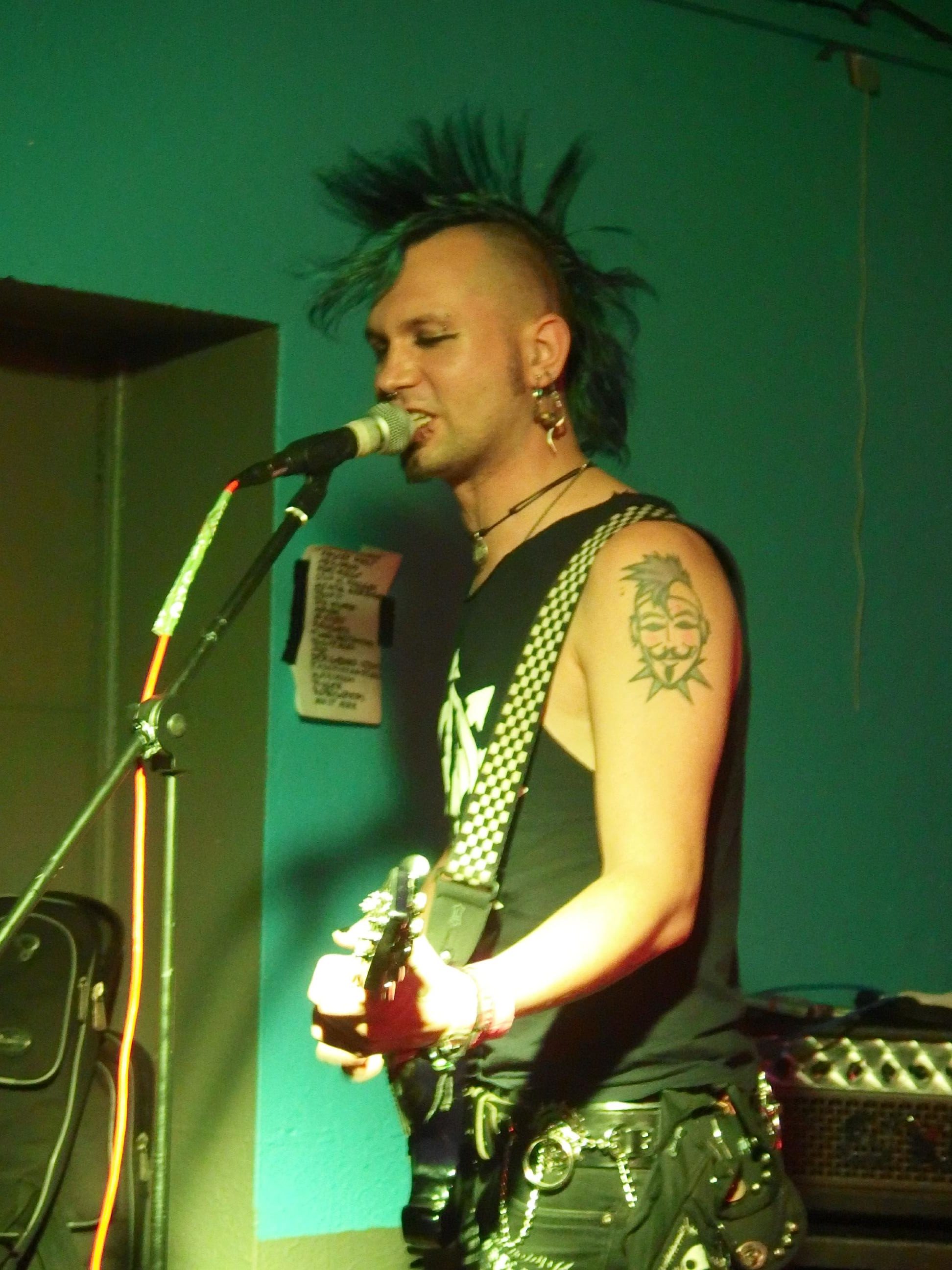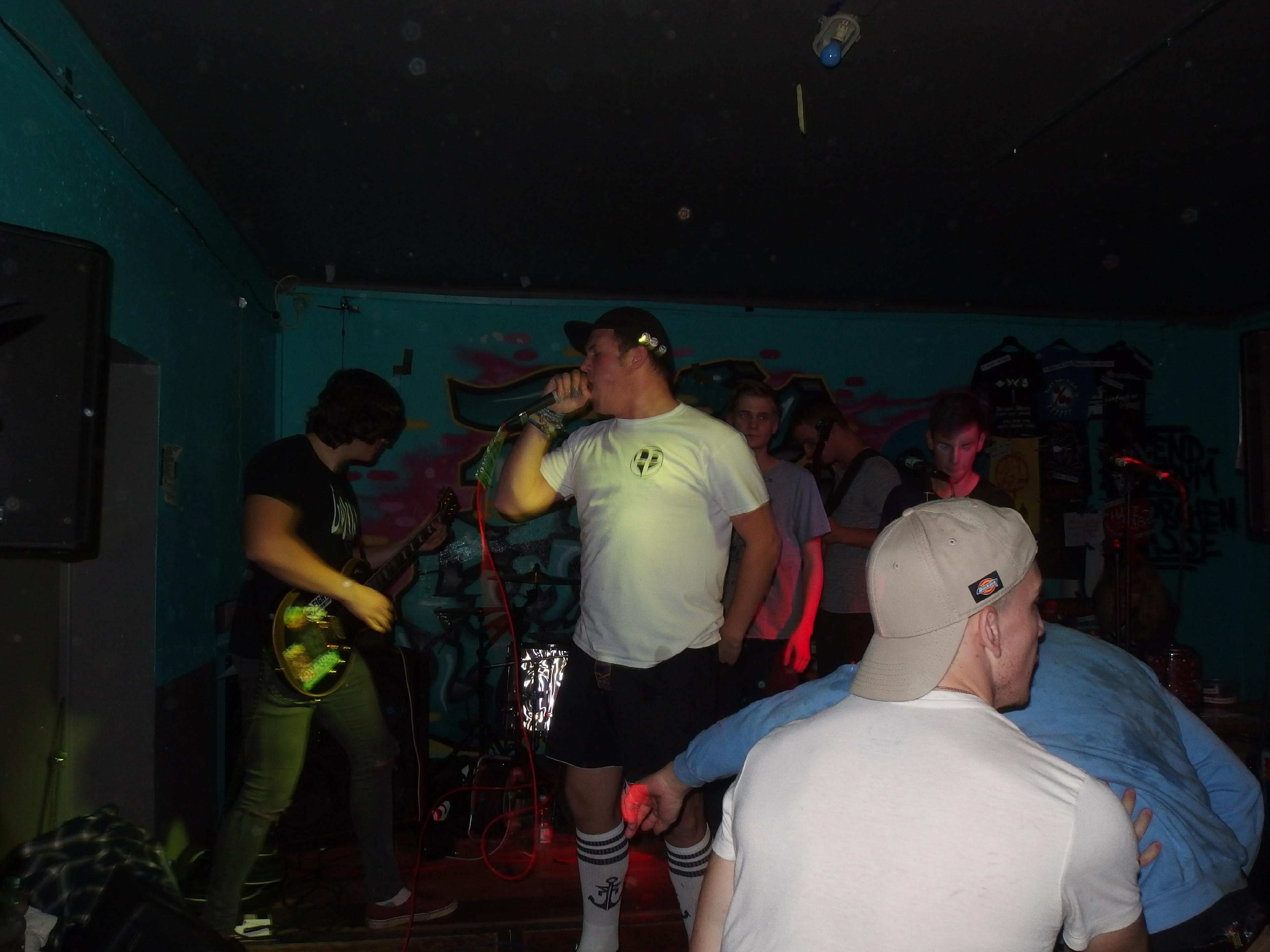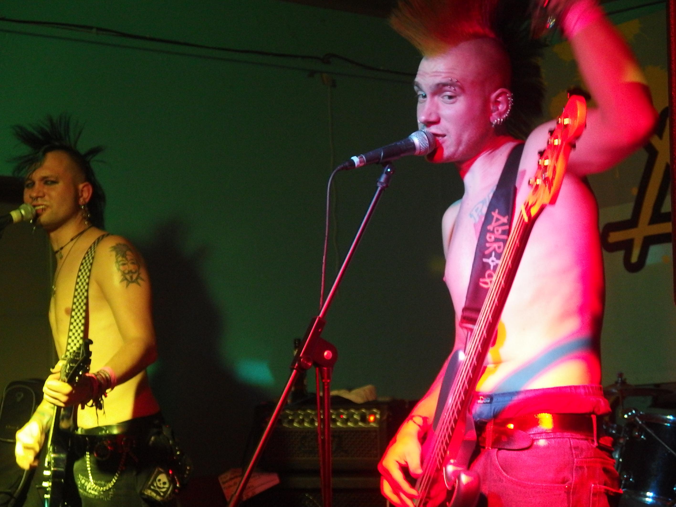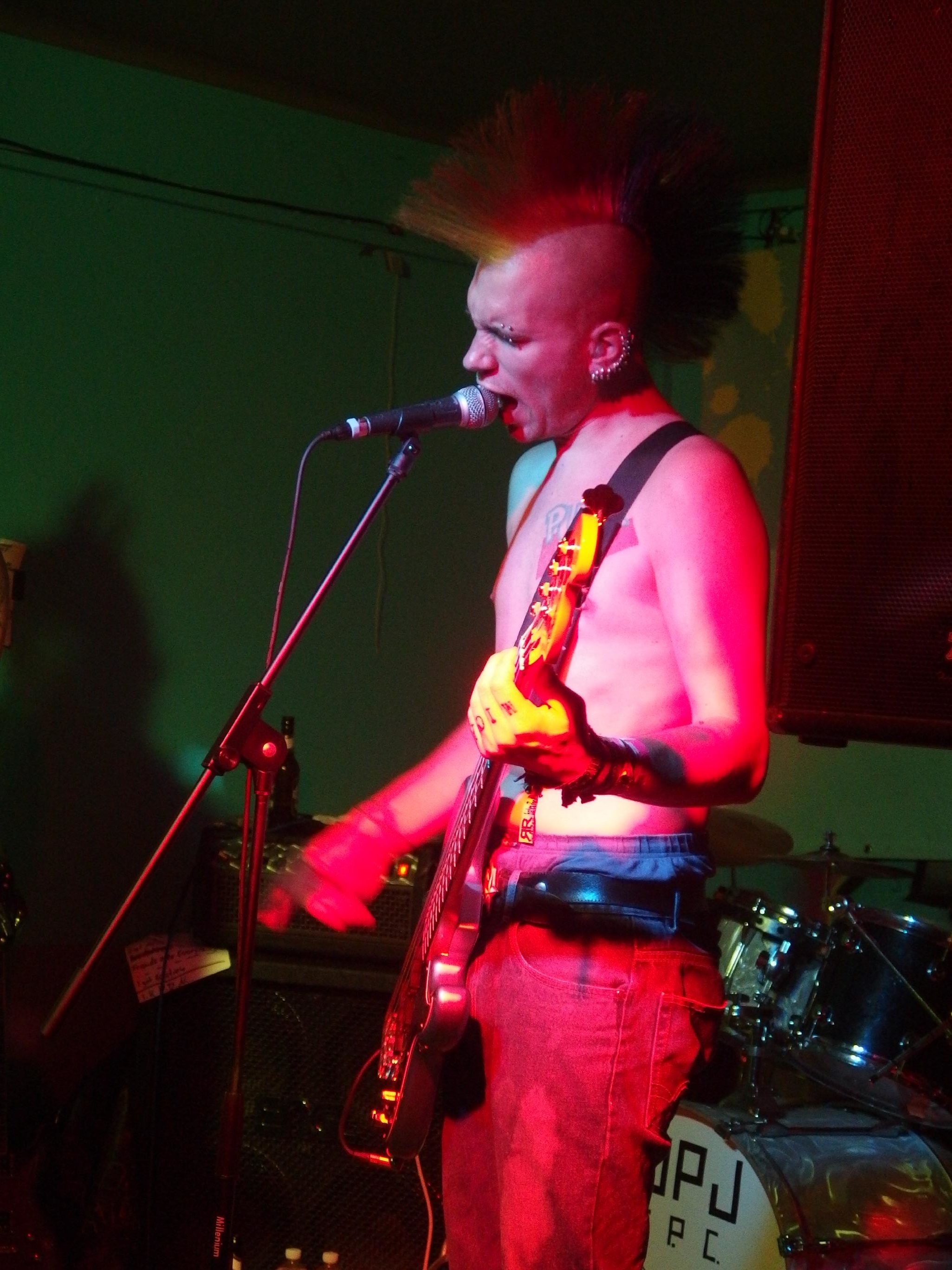 Als ich das Etablissement betrat, war ich doch etwas verwundert, wie viele Menschen angereist waren. Sowohl davor, obwohls schon kalt war, als auch im JUZ selbst war einiges los. Oi!Port waren gerade am Zocken und hatten eine wilde Meute vor der Bühne stehen. Wer die Band nicht kennt: es handelt sich um eine saarländische Oi!-Band, aber wer glaubt, dass es sich um eine typische Band handelt, liegt falsch. Hier werden neben den typischen Oi!- und Ska-Einflüssen auch gerne Blues oder gar Krautrock-Riffs verwendet, dazu nachdenkliche und melancholische Texte, aber auch einige Funtexte wie das lustige Zombielied. Heute eher am Midtempo orientiert begeisterte die Band das Publikum und ließ sie ausgiebig Pogo tanzen. Ein Cover des wunderbaren Slime-Titels Wind vom fantastischen Viva La Muerte-Album runden den guten Gesamteindruck ab. Für Iamhavoc hatte ich mich schon mal etwas länger mit der Band auseinandergesetzt, wer Lust hat, kann dort nachlesen. Nach der letzten Zugabe gabs sogar noch ein Schleimkeim-Cover, nämlich In der Kneipe zur trockenen Kehle.