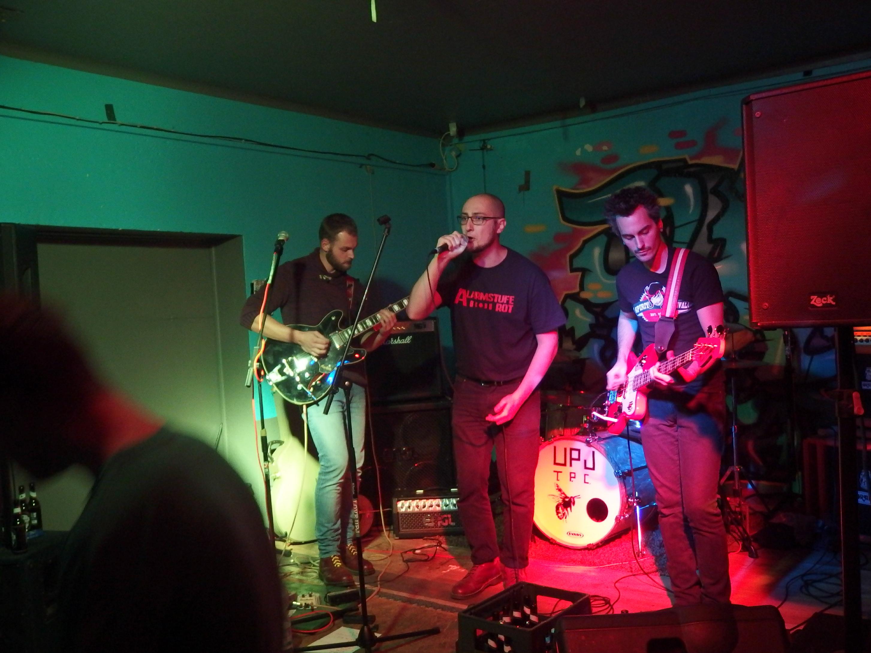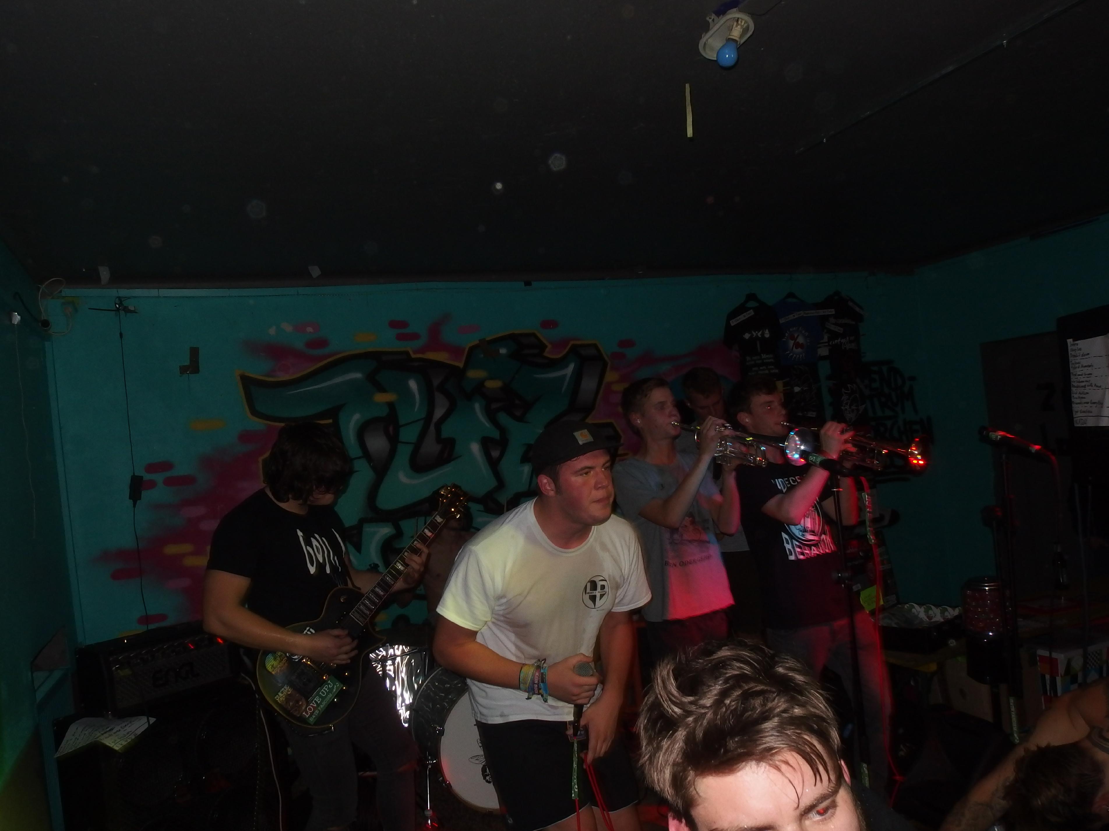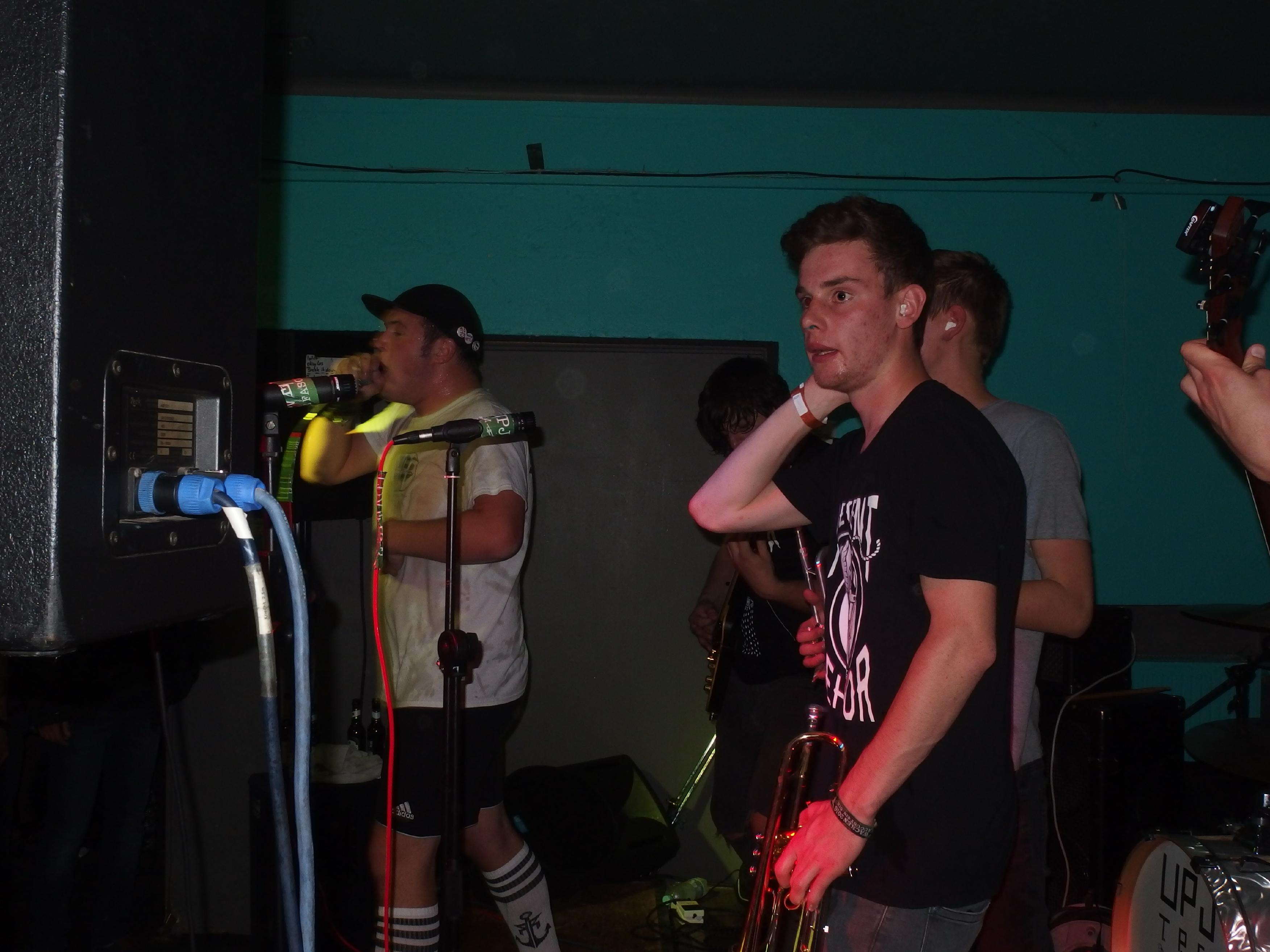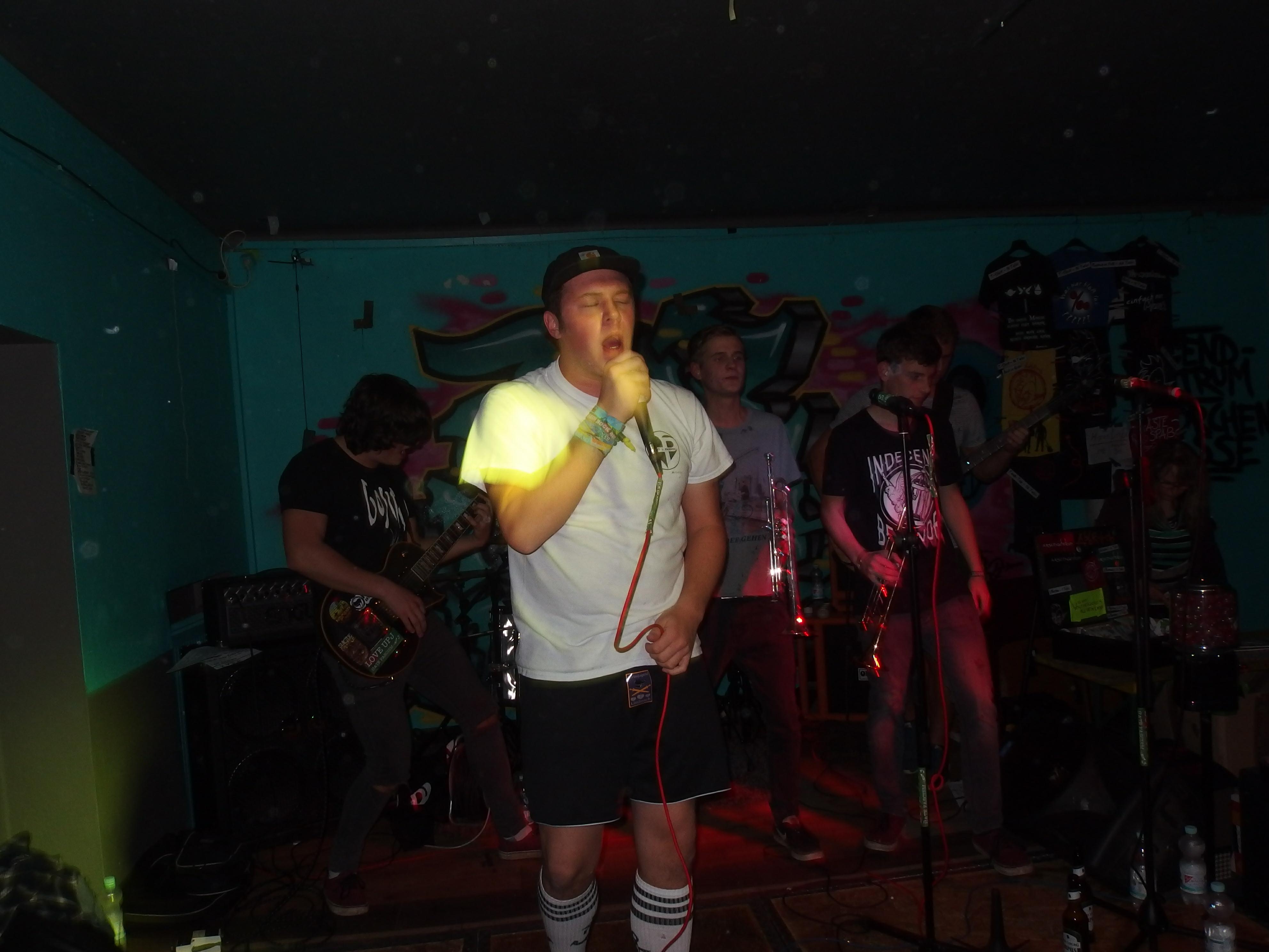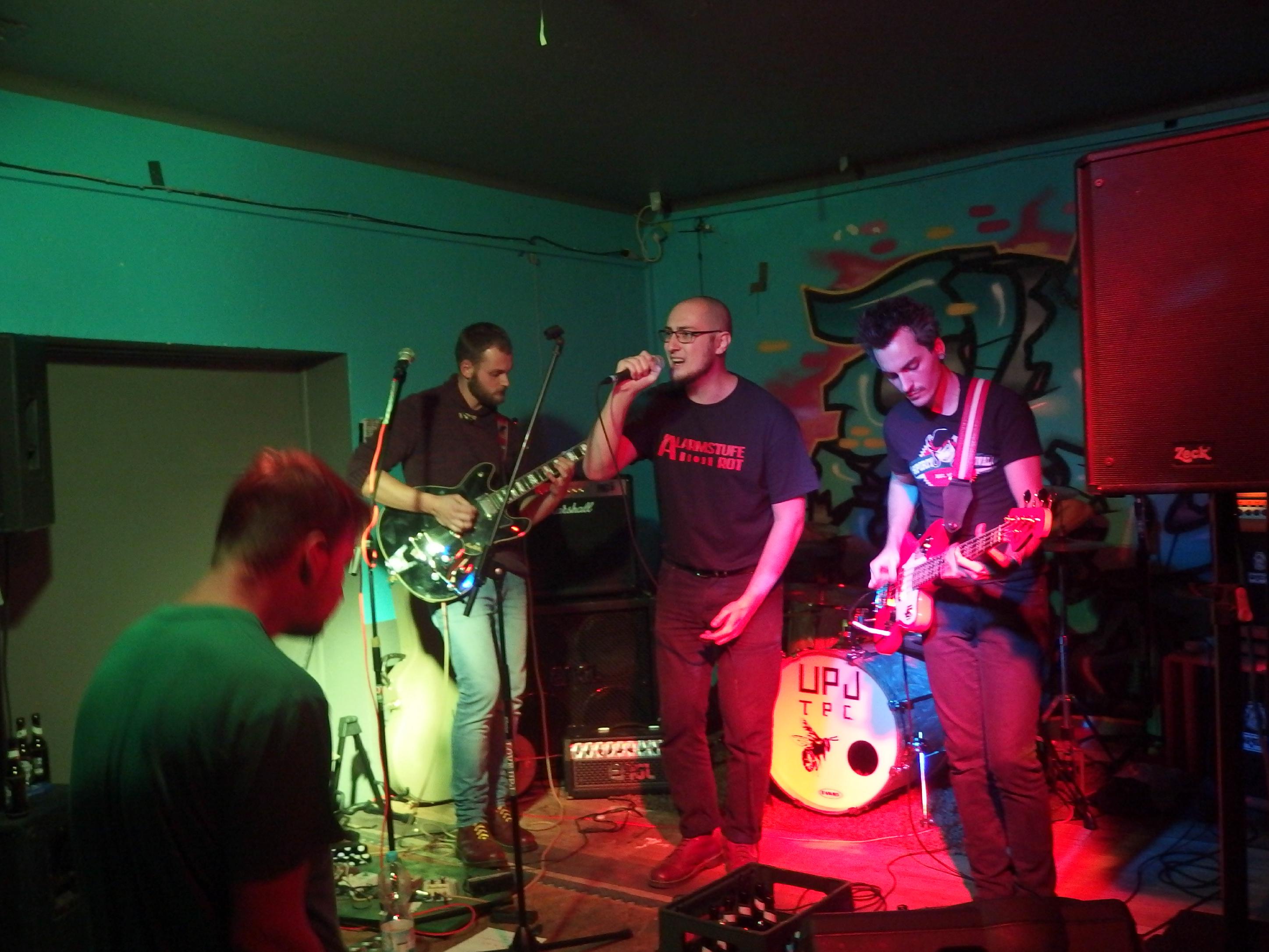 UpJ, auch bekannt als UrpilsJugend, spielen „Trumpet Punkcore“, also Punk mit Trompeten, aber eben keinen Ska. Kennt man ja von Feine Sahne Fischfilet. Die Lokalmatadoren aus Limbach hatten es natürlich leicht, das Publikum zu überzeugen, setzte es sich doch vornehmlich aus ihren Freunden und Verwandten zusammen. Wie aber ist es mit radikaler und absolut subjektiver Kritik, für die ich ja offensichtlich bekannt bin? Halten die das aus? Naja, zum Glück müssen die das ja nicht. Sicher, ab und an rumpelts gewaltig und der Sänger hatte erkältungsbedingt ein paar Probleme an diesem Abend. Dennoch: die Band macht Spaß. Nicht alles, was sie machen, ist meine Musik. Aber bei dem Cover von Hybrid Moments (zweimal gespielt: einmal beim Soundcheck und dann im offiziellen Set) geht einem natürlich das Herz auf. Auch ihre eigenen Lieder sind durchaus empfehlenswert. Was mir wirklich gut gefällt ist der Einsatz der beiden Trompeten, insbesondere bei den Covern. Wird nie zum Selbstzweck, sondern bereichert auch die fremden Songs. Der Auftritt war natürlich gigantisch: Pogo bis zum Umfallen, Stagediving und Crowdsurfing und ganz viel strahlende Gesichter. Höhepunkt war sicherlich das I Got Erection-Cover und die Bro Hymne (wobei ich nie ganz verstanden habe, was an Pennywise toll sein soll –> Ups, jetzt krieg ich bestimmt wieder einen auf den Deckel). Als Abschluss präsentierte die Band ein eigenes Lied: ihren Szenehit Ich kotz auf deine Nikes. Großartig. Jetzt muss die Band eines tun: an ihren Songs feilen und beginnen aus dem Freundeskorsett auszubrechen. Das heißt ihre Sporen bei einem weniger der Band zugeneigten Publikum verdienen. Ich bin mir sicher, das wird ihnen gelingen.