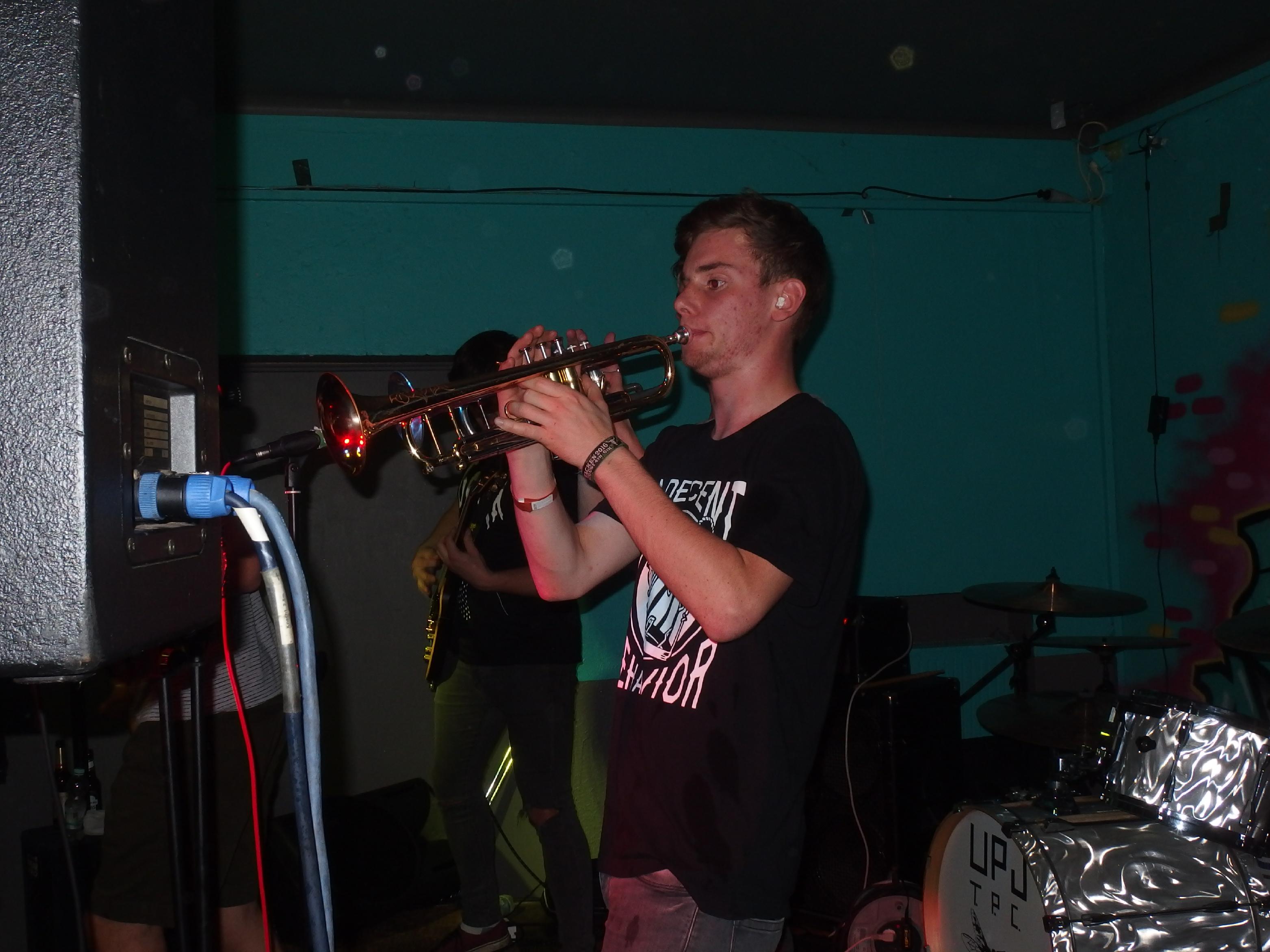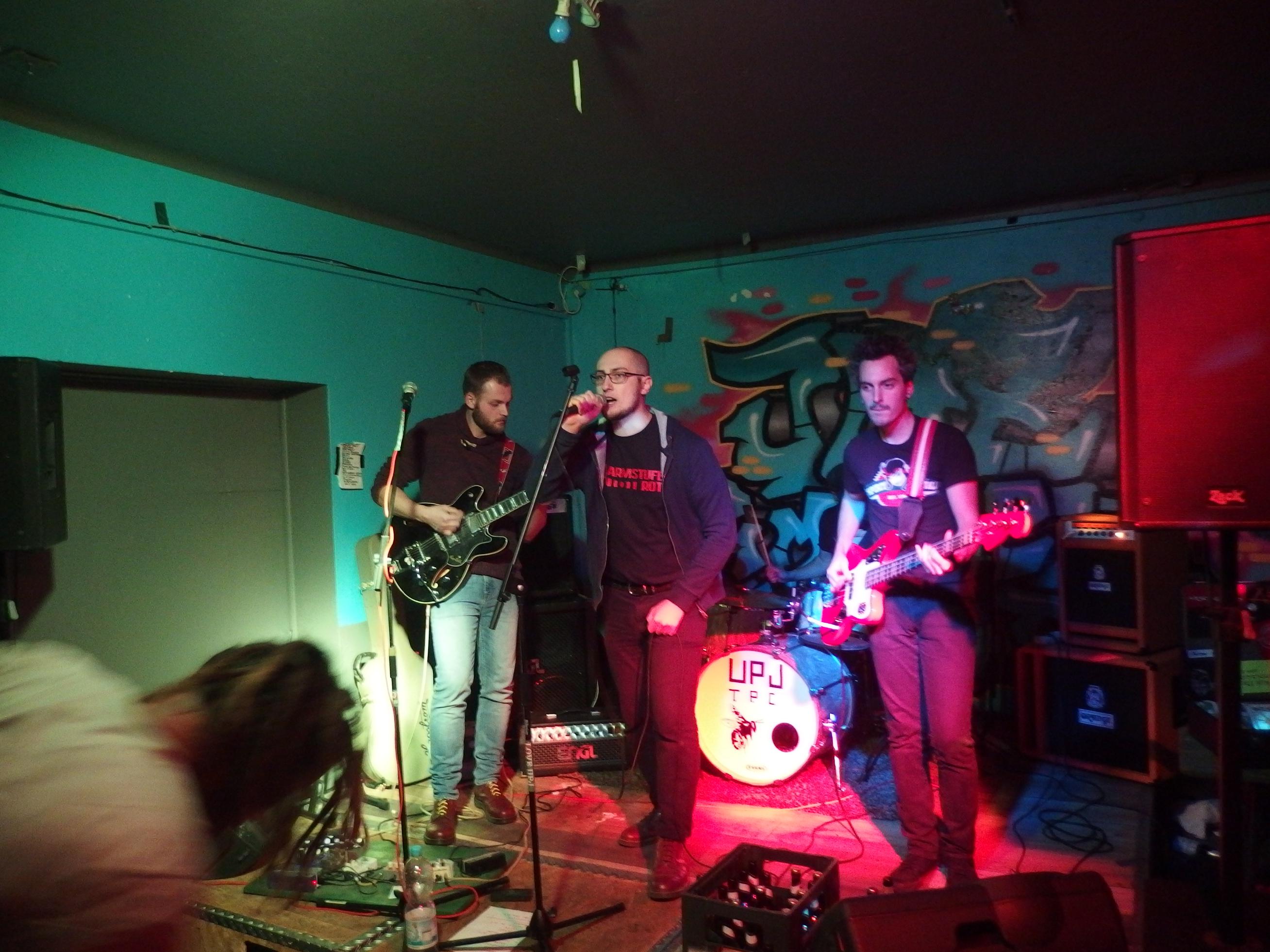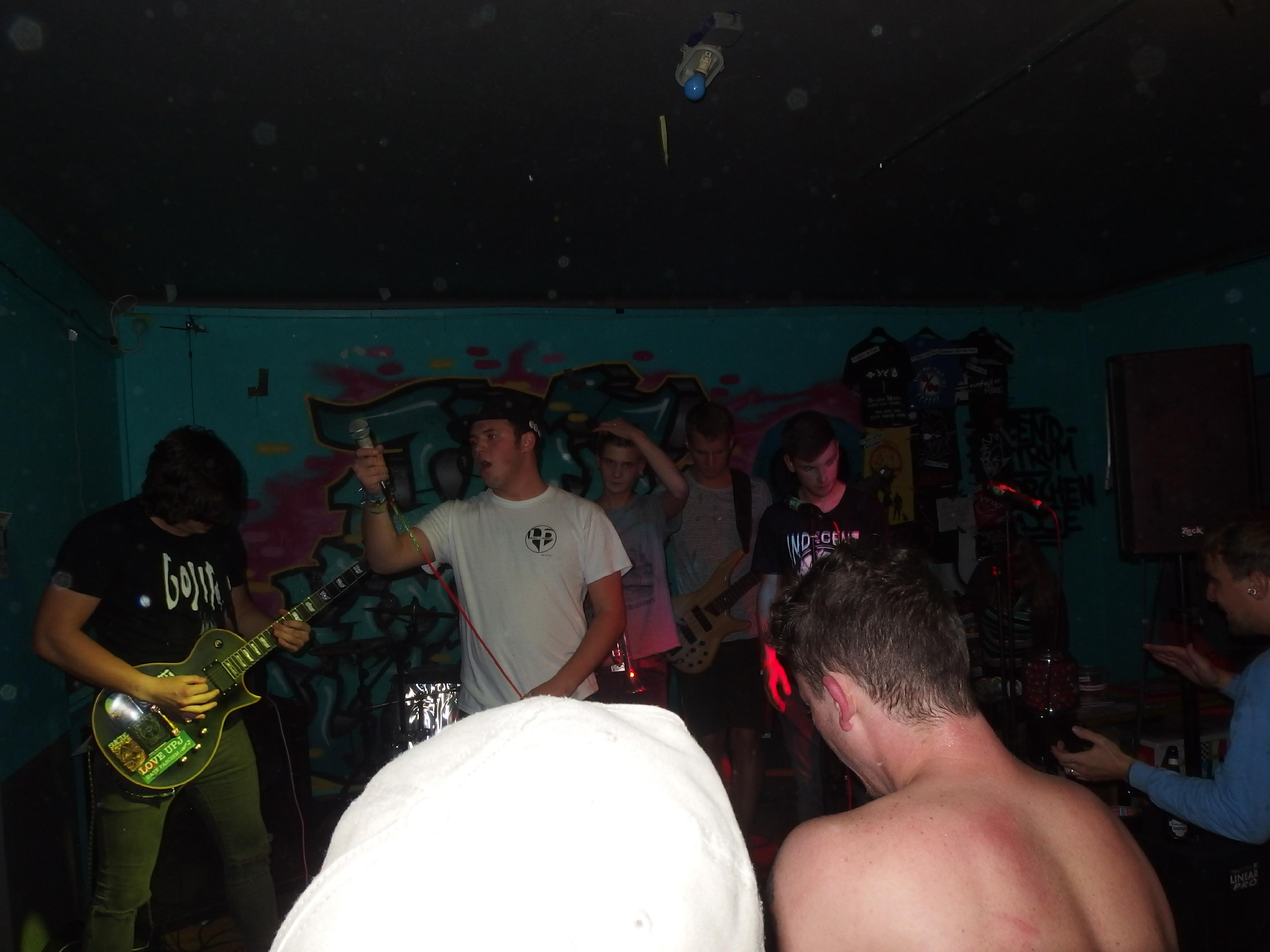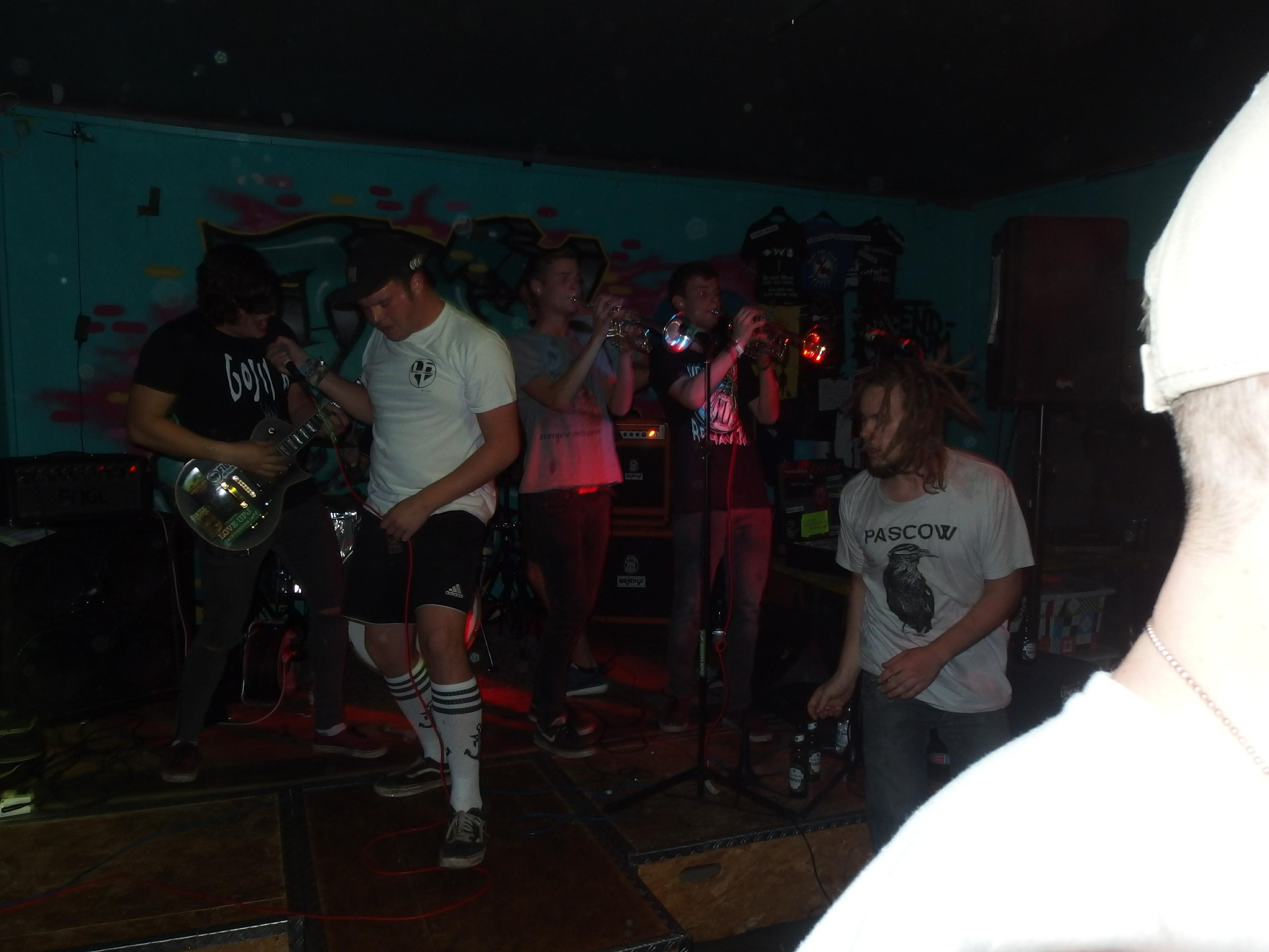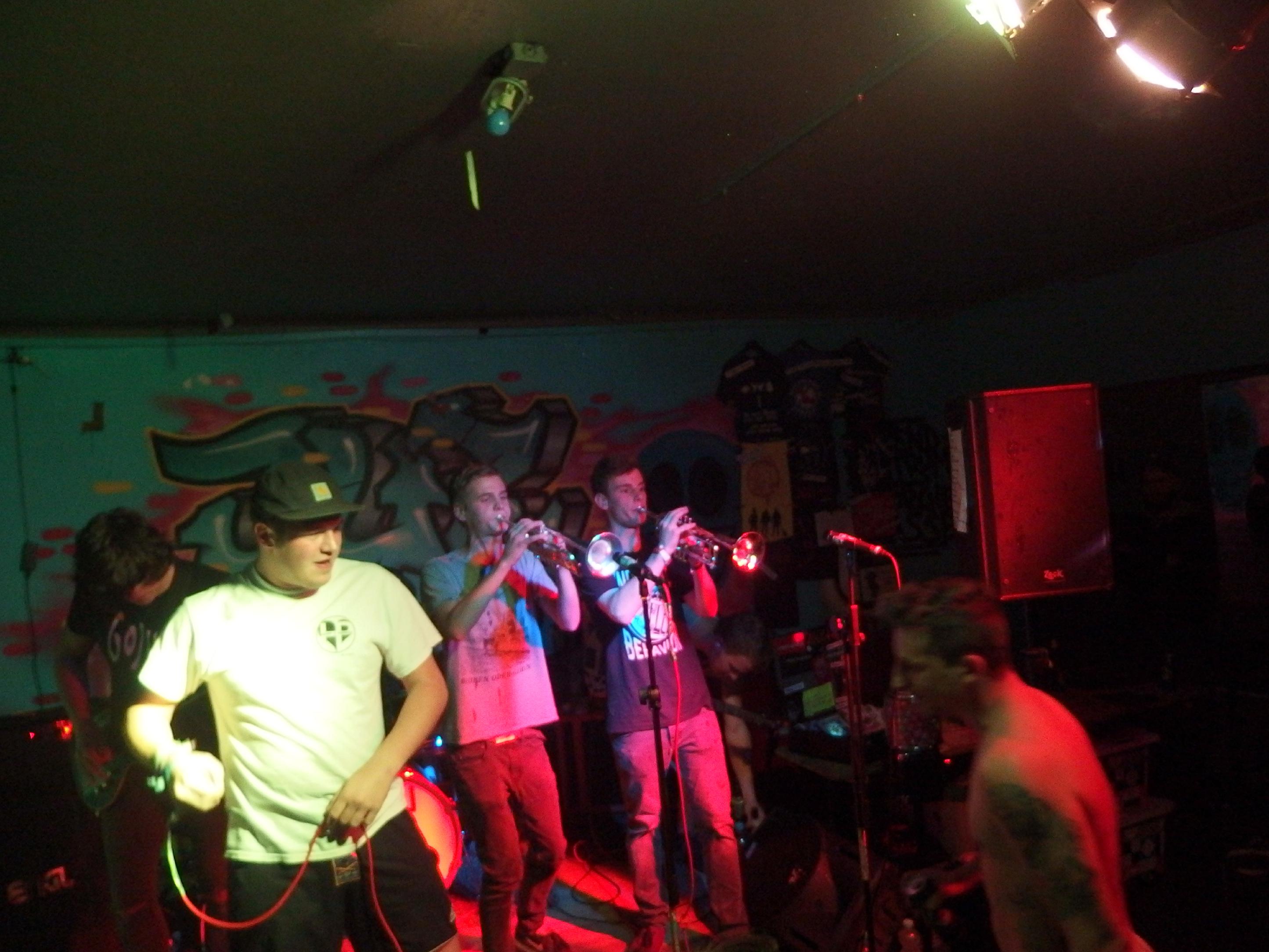 UpJ, auch bekannt als UrpilsJugend, spielen „Trumpet Punkcore“, also Punk mit Trompeten, aber eben keinen Ska. Kennt man ja von Feine Sahne Fischfilet. Die Lokalmatadoren aus Limbach hatten es natürlich leicht, das Publikum zu überzeugen, setzte es sich doch vornehmlich aus ihren Freunden und Verwandten zusammen. Wie aber ist es mit radikaler und absolut subjektiver Kritik, für die ich ja offensichtlich bekannt bin? Halten die das aus? Naja, zum Glück müssen die das ja nicht. Sicher, ab und an rumpelts gewaltig und der Sänger hatte erkältungsbedingt ein paar Probleme an diesem Abend. Dennoch: die Band macht Spaß. Nicht alles, was sie machen, ist meine Musik. Aber bei dem Cover von Hybrid Moments (zweimal gespielt: einmal beim Soundcheck und dann im offiziellen Set) geht einem natürlich das Herz auf. Auch ihre eigenen Lieder sind durchaus empfehlenswert. Was mir wirklich gut gefällt ist der Einsatz der beiden Trompeten, insbesondere bei den Covern. Wird nie zum Selbstzweck, sondern bereichert auch die fremden Songs. Der Auftritt war natürlich gigantisch: Pogo bis zum Umfallen, Stagediving und Crowdsurfing und ganz viel strahlende Gesichter. Höhepunkt war sicherlich das I Got Erection-Cover und die Bro Hymne (wobei ich nie ganz verstanden habe, was an Pennywise toll sein soll –> Ups, jetzt krieg ich bestimmt wieder einen auf den Deckel). Als Abschluss präsentierte die Band ein eigenes Lied: ihren Szenehit Ich kotz auf deine Nikes. Großartig. Jetzt muss die Band eines tun: an ihren Songs feilen und beginnen aus dem Freundeskorsett auszubrechen. Das heißt ihre Sporen bei einem weniger der Band zugeneigten Publikum verdienen. Ich bin mir sicher, das wird ihnen gelingen.