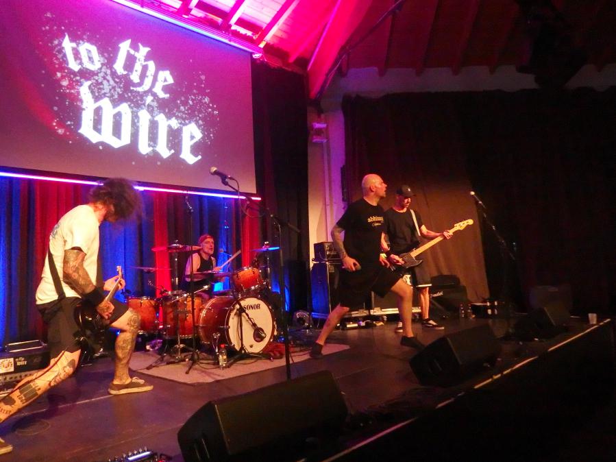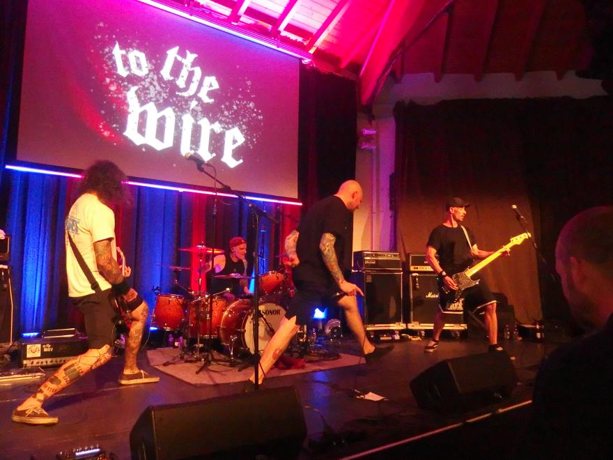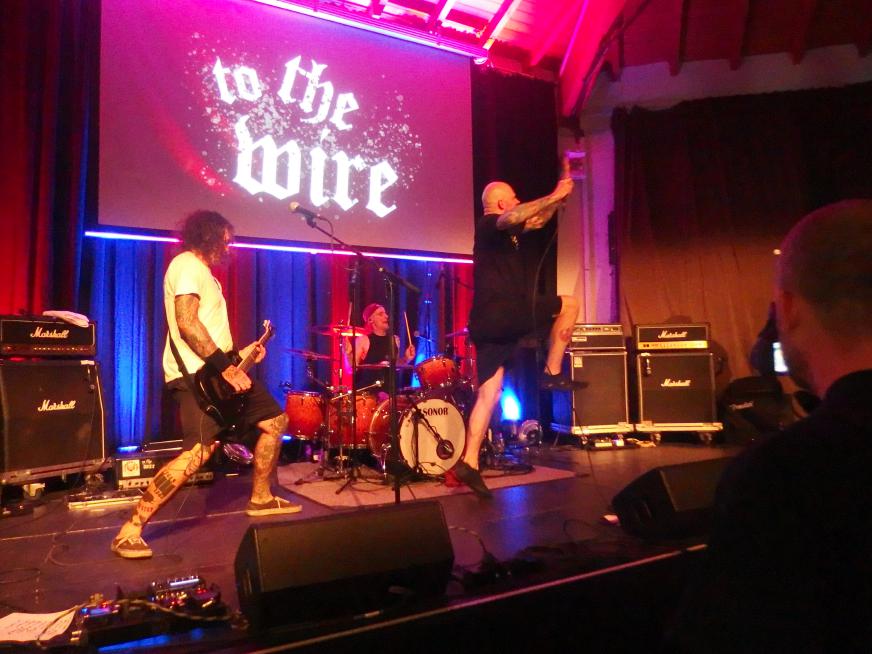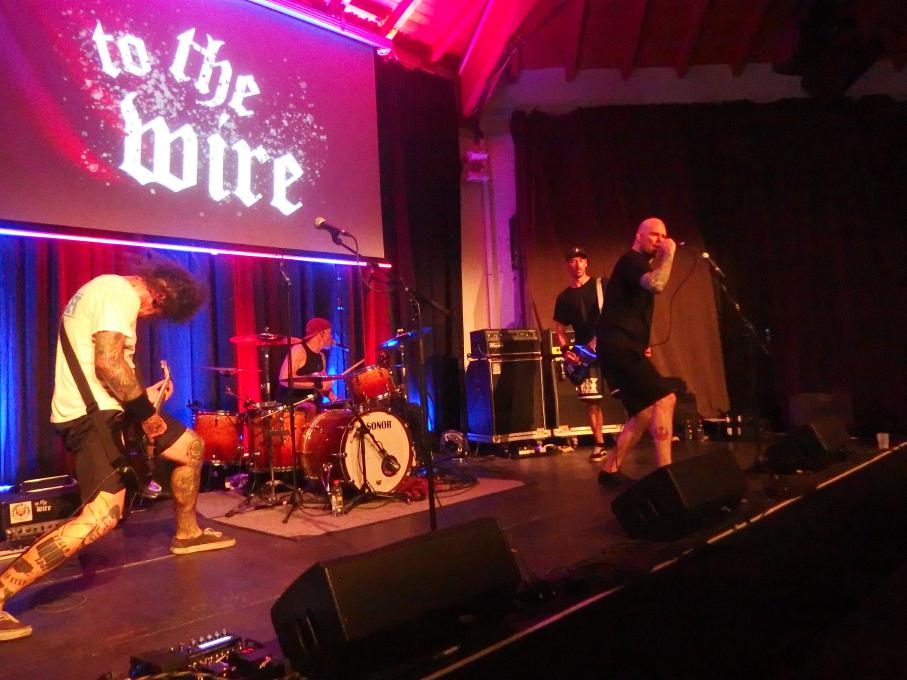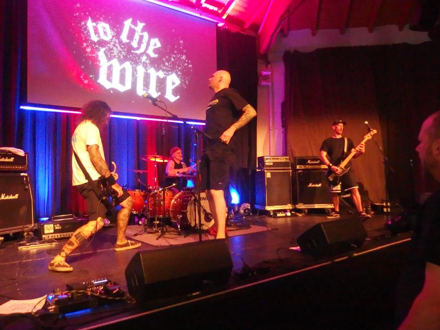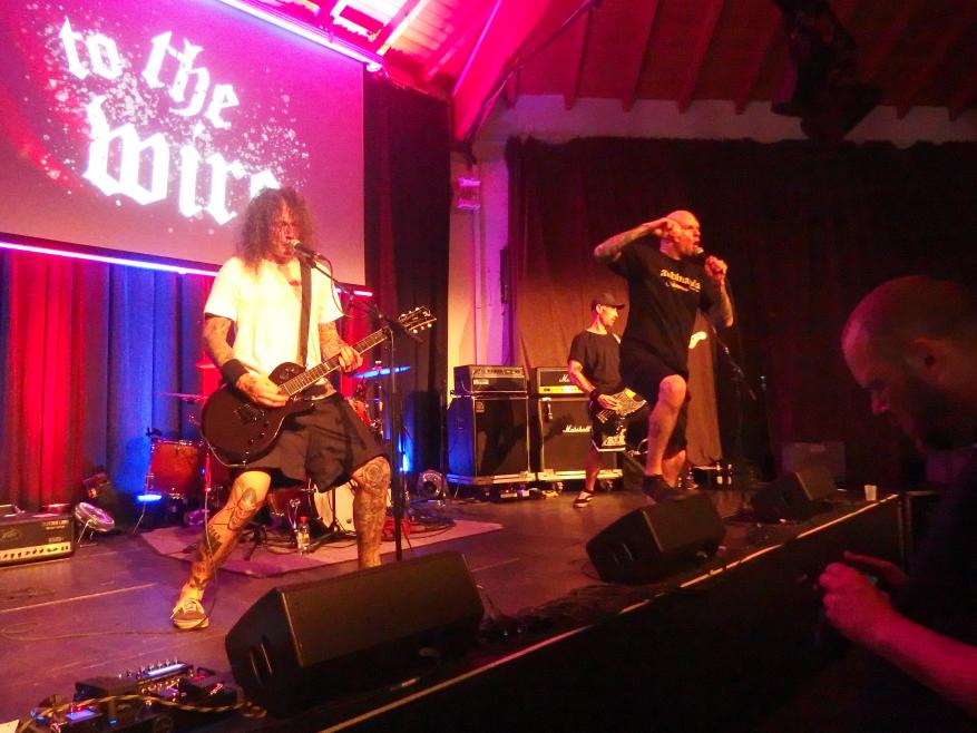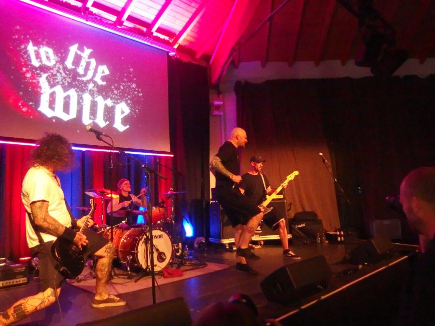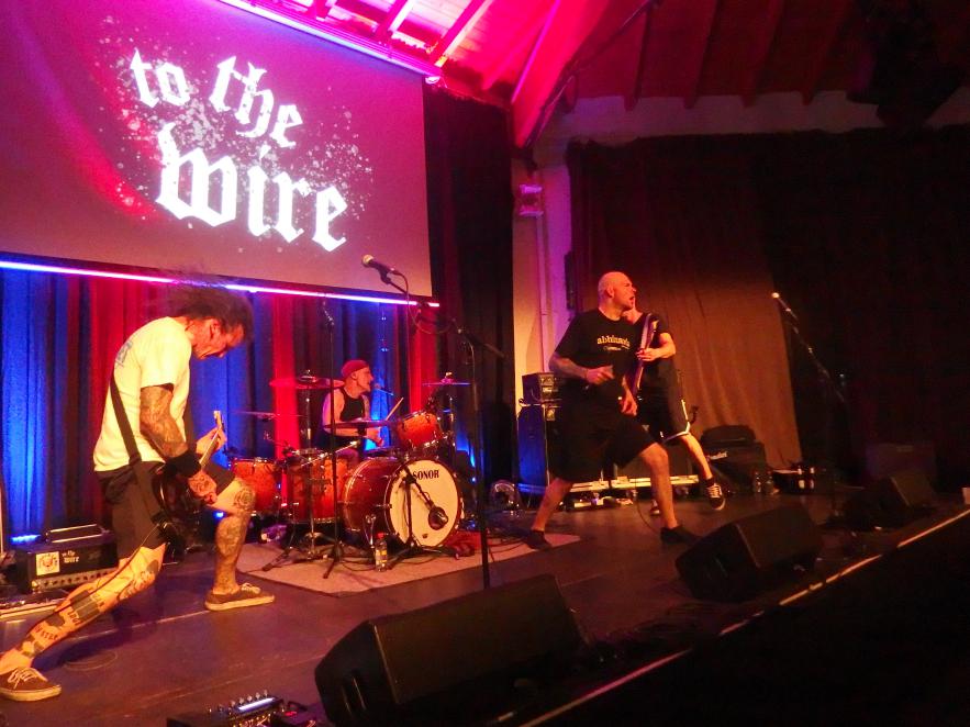 To the Wire waren dann doch eine kleine Überraschung für mich. So verblüfften doch letztens Tony Gorilla mit der Ankündigung einer Reunion, allerdings mit neuem Sänger. Deren alter Sänger Chris hat dafür als neues Projekt To the Wire ins Leben gerufen (wir berichteten). Zu den Klängen von Country Roads betrat die Band dann die Bühne und es gab keine Kompromisse mehr. Sehr schöner Old-School-Hardcore mit dezenter Metalkante. Mit Songtiteln kann ich euch leider nicht dienen, die Setlist verschwand während des Gigs, was für ein paar kleinere Schwierigkeiten sorgte. Aber iohre erste Single Desperate Times haben sie sicherlich gespielt. Ansonsten war die Band sichtlich bewegungsfreundlich und Chris besuchte auch zweimal das Publikum. Er war auch sichtlich angetan für Abhinanda veröffentlichen zu dürfen und trug ein T-Shirt der Band. Auch den Unity-Gedanken hob die Band hervor und erwähnte auch seine Freunde von Stay Free, von denen einige im Publikum waren. Klare Ansagen gegen AFD und Konsorten gabs auch.