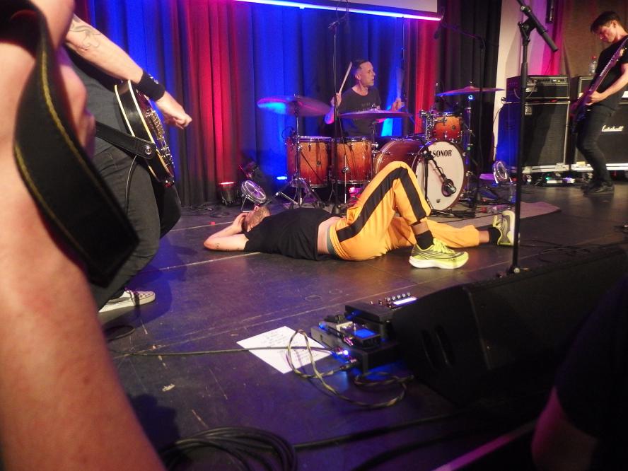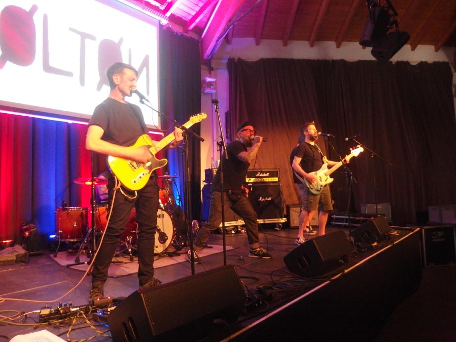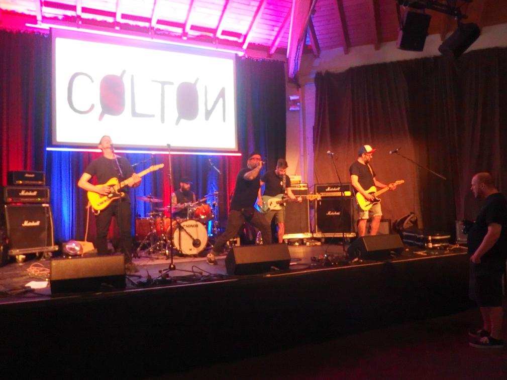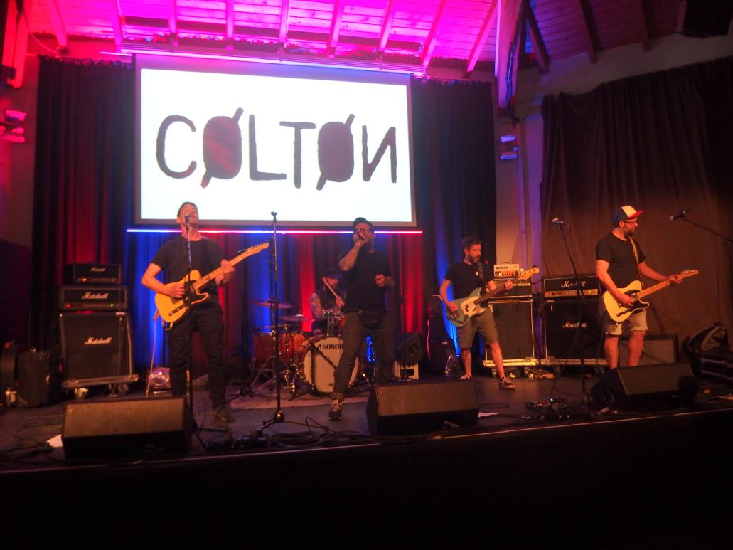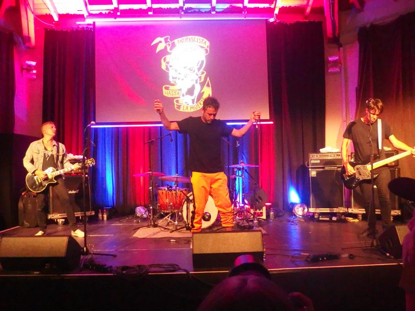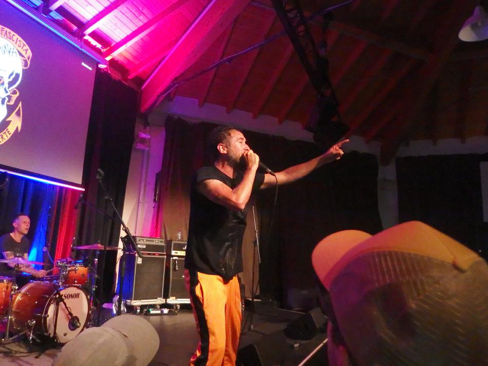 Colton, oder Cøltøn wie das Banner suggeriert (was aber irgendwie nicht so gut auszusprechen wäre), ist das neueste Projekt von Tausendsassa Measy nach Die rote Suzuki, Prinzessin halts Maul und Giulio Galaxis. Mit einem Coverstück von letzterer Band begann der Abend, da war ich leider nur noch nicht da. Insgesamt war es ein schöner Auftritt, obwohl Measy etwas nervös erschien. Dabei ist er ja jetzt schon mehrere Jahre in Bands aktiv. Aber ok, für Colton war es der erste Auftritt überhaupt. Insgesamt eine typische Measy-Band mit guten Texten, die man an dem Abend leider nicht ganz verstehen konnte. Aber es gab, was man aus den Versatzstücken erkennen konnte, viel Selbstrefernzielles über die Punkszene und eine klare politische Haltung. Was will man mehr?