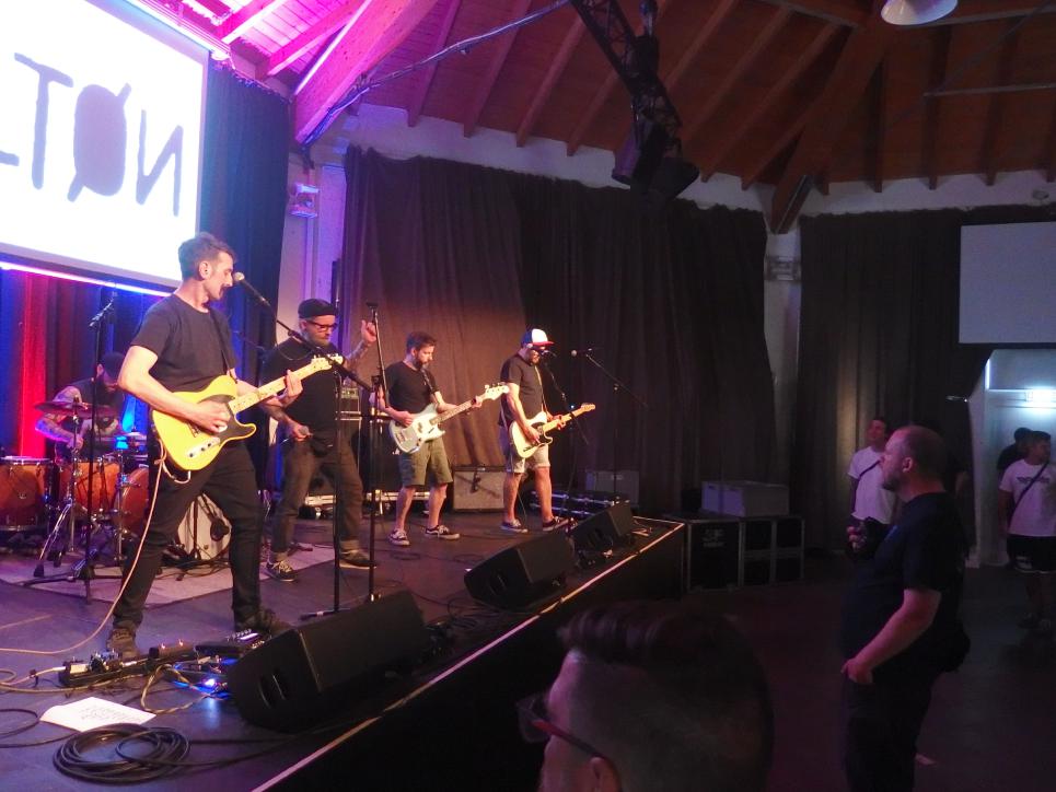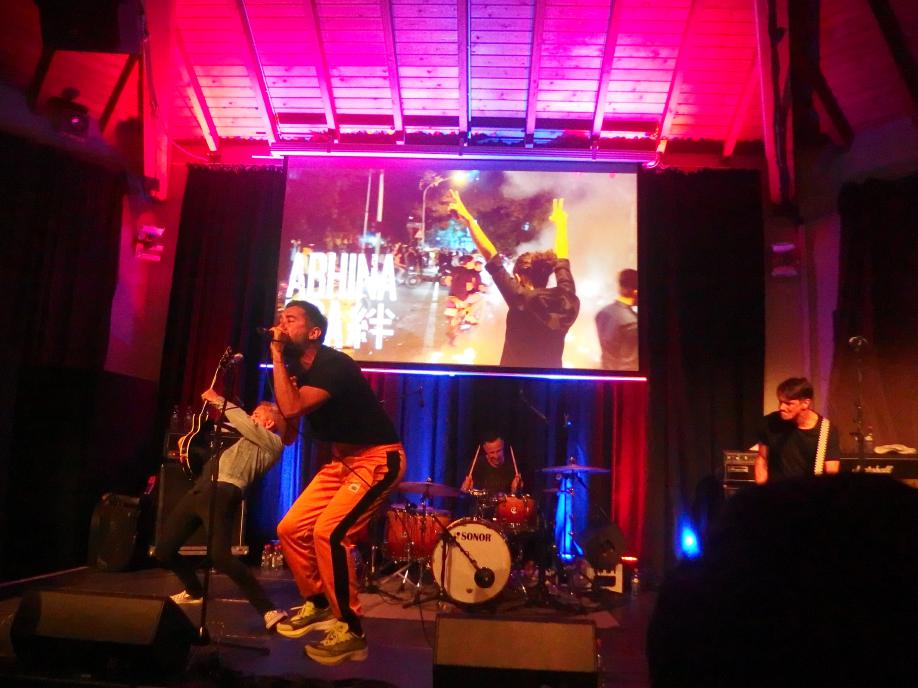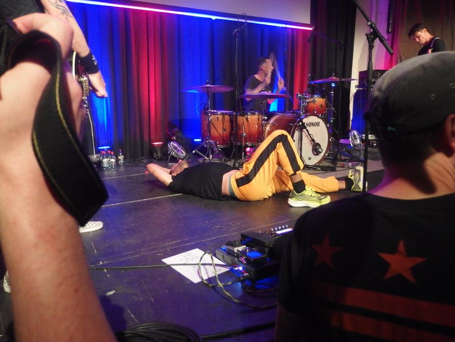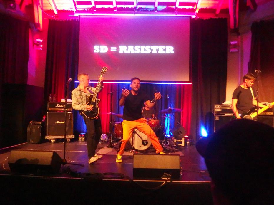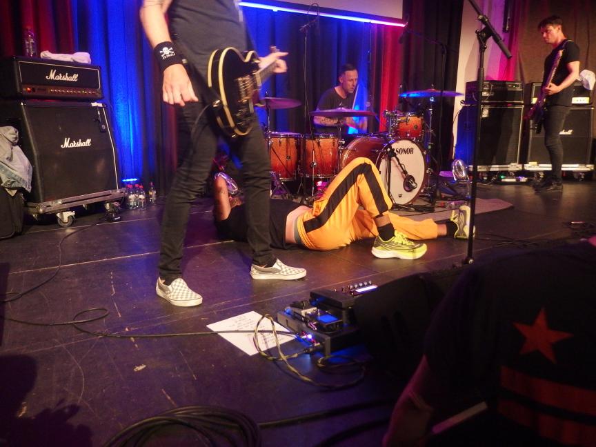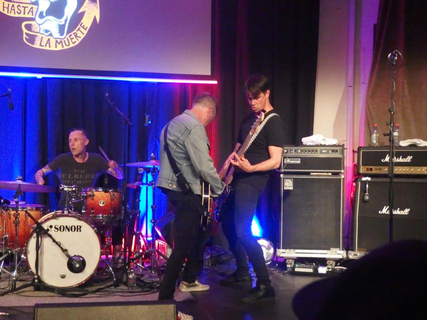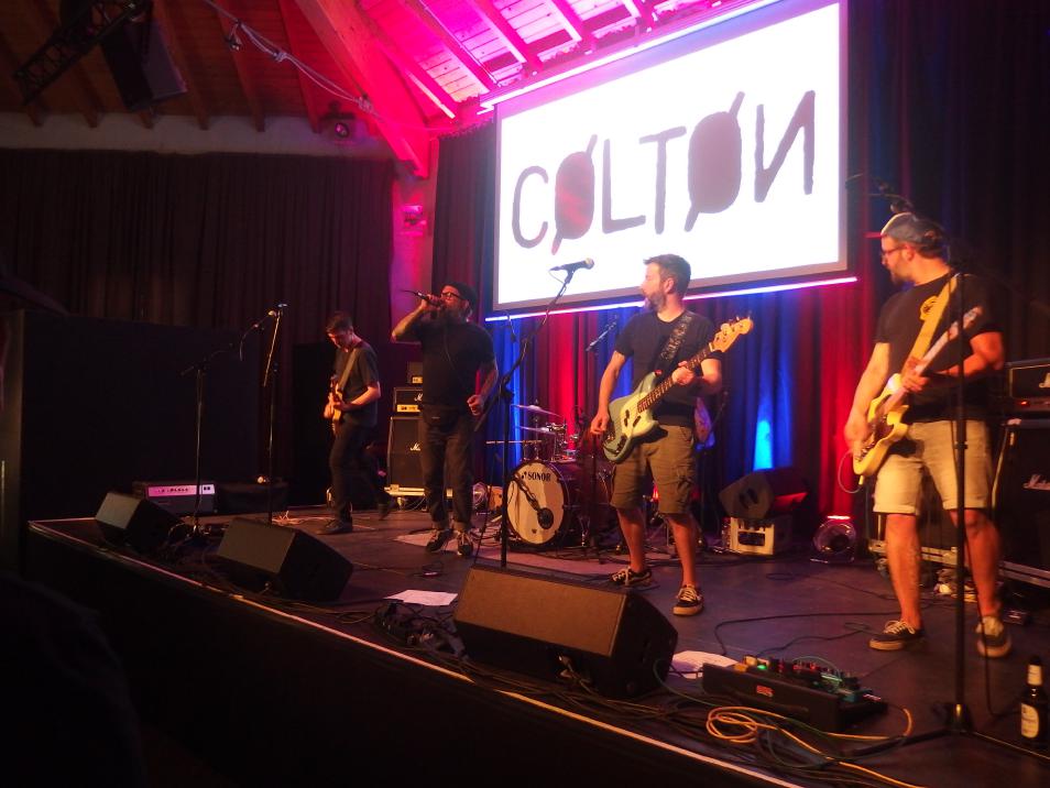 Colton, oder Cøltøn wie das Banner suggeriert (was aber irgendwie nicht so gut auszusprechen wäre), ist das neueste Projekt von Tausendsassa Measy nach Die rote Suzuki, Prinzessin halts Maul und Giulio Galaxis. Mit einem Coverstück von letzterer Band begann der Abend, da war ich leider nur noch nicht da. Insgesamt war es ein schöner Auftritt, obwohl Measy etwas nervös erschien. Dabei ist er ja jetzt schon mehrere Jahre in Bands aktiv. Aber ok, für Colton war es der erste Auftritt überhaupt. Insgesamt eine typische Measy-Band mit guten Texten, die man an dem Abend leider nicht ganz verstehen konnte. Aber es gab, was man aus den Versatzstücken erkennen konnte, viel Selbstrefernzielles über die Punkszene und eine klare politische Haltung. Was will man mehr?