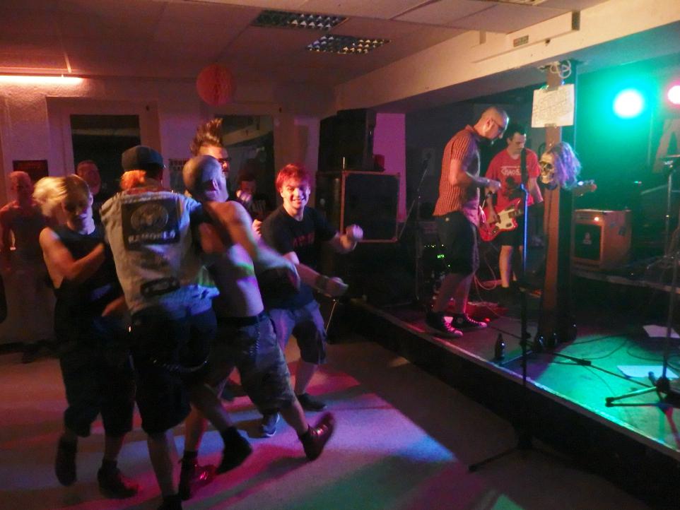 Geladen waren natürlich auch Steinbeißer. Ehemals als Oi!Port bekannt, woran nicht nur der Rückenaufdruck eines älteren Gastes (also auf dem nackten Rücken) erinnerte, sondern auch ihr Hit Ekelhaft und faul, eine ihrer großen Hymnen. Doch die neuere Ausrichtung ist wesentlich weniger Oi!-lastig. Auch etwas flotter habe ich den Eindruck. Auch lokale Helden wurde die Band doch sehr abgefeiert. Bin mal gespannt, wie ihr zweiter Longplayer wird. Das Album steht nämlich schon in den Startlöchern und wurde im gleichen Studio aufgenommen, wie das Machwerk des Headliners. Ein Schleim-keim-Cover als Abschluss durfte nicht fehlen. Es gab das unvergleichliche In der Kneipe zur trockenen Kehle. Sollte auch nicht das einzige SK-Cover an diesem Abend bleiben.