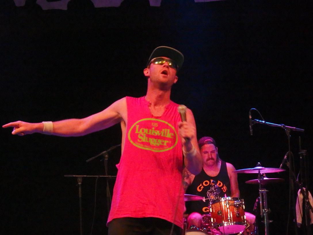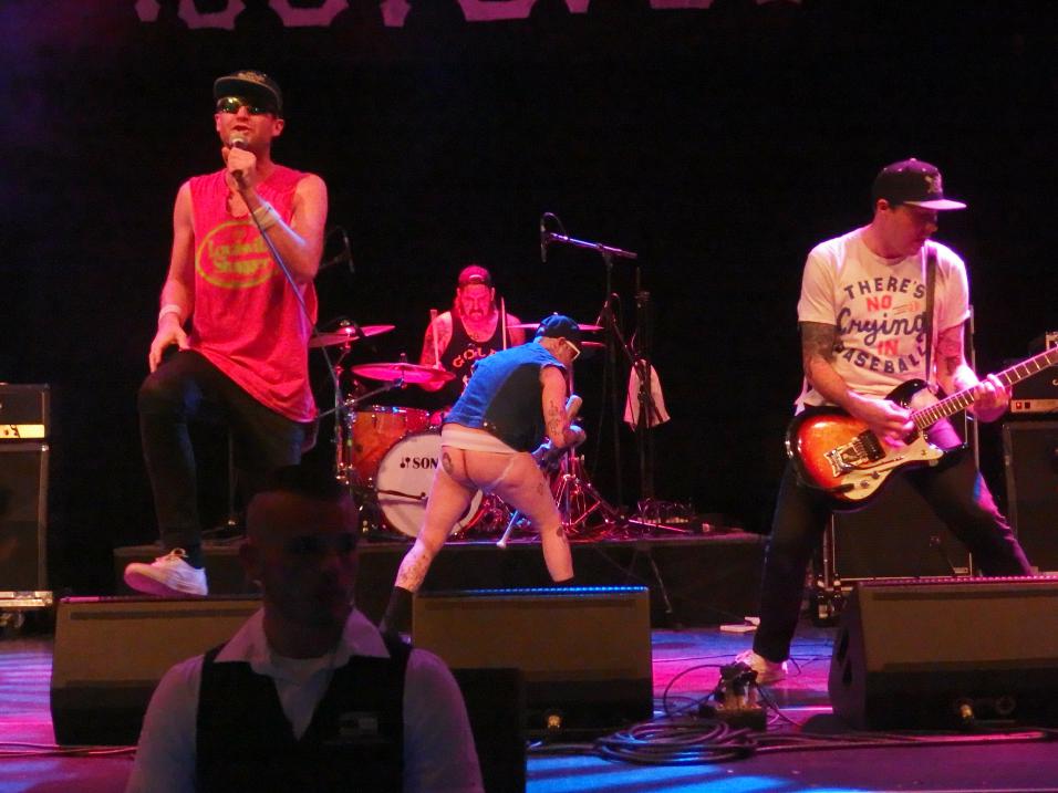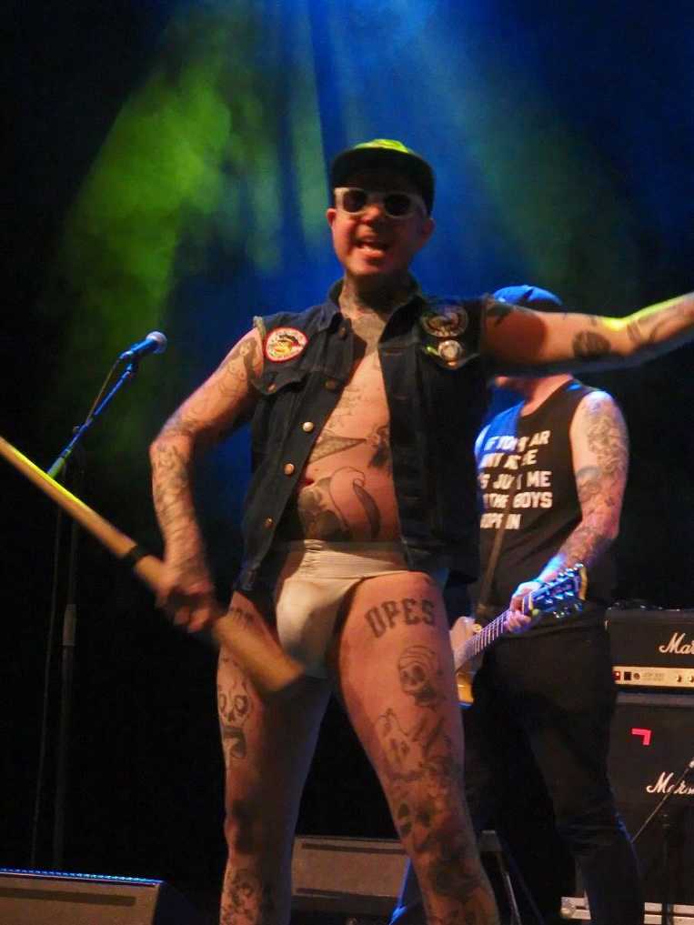 Die Isotopes waren auf diesen Seiten schon zweimal vertreten. Mir selbst waren sie komplett unbekannt. Als Anheizer waren sie auf jeden Fall die richtige Wahl. Baseball-Punk, was es alles gibt und so handeln die Songs ausschließlich von diesem Thema. Eine Konzeptband, interessant. Musikalisch waren ziemlich nah an den Ramones, auch mit altbekannten „1-2-3-4“-Einzählern. Das Sujet fiel hier natürlich weniger auf. Aber sie hatten noch jemanden dabei, der kein Instrument spielte. Rad Jockstrap, der Anheizer vom Anheizer sozusagen, bewaffnet mit einem Baseballbat (wer denkt jetzt an Beat on the Brat?). Ansonsten trug er eine Kutte und ein Suspensorium. Sonst nix. Er hampelte auf der Bühne herum, schlug sich den Baseballschläger gegen sein Suspensorium, drehte sich recht häufig um, damit das Publikum seinen nackten Hintern sehen konnte und zog Grimassen. Ansonsten ging er halt voll ab. Auch der Rest der band war blendend drauf, wie es sich um 16:00 Uhr am Samstag auch gehört. Natürlich war die Halle noch relativ leer, aber die Band machte Appetit auf mehr.