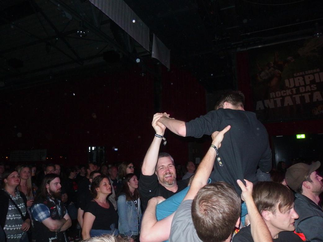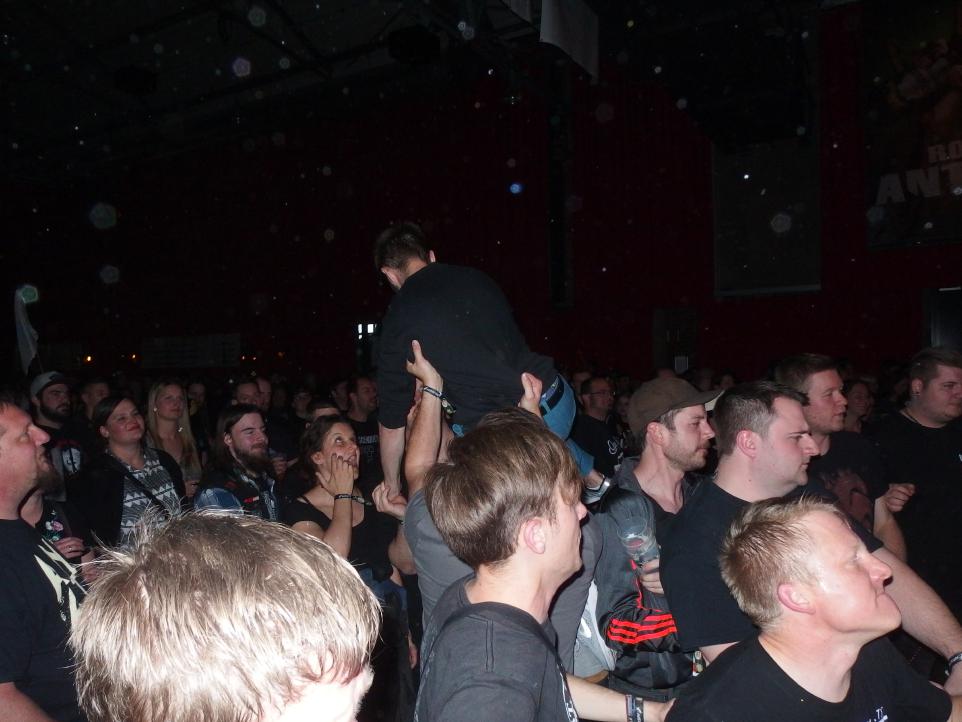 Was danach kam leider gar nicht. Kuchenclub waren der Local-Act des Abends. Trotz des leckeren Namens war es leider so, dass man sich als Saarländer relativ viel schämen musste. Die meiste Zeit stand ich mit facepalm bedeckt in der Ecke des Raums und konnte nicht fassen, was sich da abspielte. Zunächst gings ja ganz gemütlich los, doch die Texte drifteten irgendwie ständig in Richtung Schlager. Der versuch, den Pathos von den Broilers und vergleichbaren Bands zu imitieren endete irgendwo zwischen Helene Fischer und Deutschrock. Am schlimmsten war dann die Saarland-Hymne. Als Kuchenclub das Lied ankündigen, kamen erwartungsgemäß die „Saarland Asozial“-Rufe, doch was danach kam, uff, das war nur schwer auszuhaltender Lokalpatriotismus: „Schöne Wälder, bunte Täler/Bei uns im kleinsten Bundesland/Menschen von kernigem Schlage/Meine Heimat, du mein Saarland“ (…) „Mein Bündnis steht, für alle Zeit, immer und ewig bleib ich hier“ (…) Eine Reise durch den Wahnsinn/den Sternen manchmal nah“. Ay, caramaba. Da fehlen einem eigentlich die Worte. Punkrock und Heimatverbundenheit schließen sich zwar nicht zwangsläufig aus, man denke nur an die Ruhrpottler, aber in dieser geballten Schmonzette… Sogar Cock Sparrer haben es geschafft, wenigstens „the dirty water on the rivers“ zu besingen, und was bei den Toten Hosen nach „Hohe Berge, weite Täler, klare Flüsse, blaue Seen“ kommt, brauch ich wohl niemandem zu erzählen. Und die weiteren Lieder machten es leider auch nicht besser.