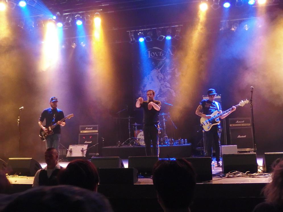 Love A sind dann die Band, auf die ich mich am meisten gefreut habe. Und wer Jubelreviews nicht mag, sollte zum nächsten Absatz springen, denn mehr wird es hier sicherlich nicht geben. Und doch, das Reinkommen in den Gig war für die Band ziemlich schwer. Denn obwohl oder eventuell auch weil sie gerade erst eine neue neue Platte (Review folgt) aufgenommen haben, hatten sie wenig zeit zum Proben und mussten vom gemeinsamen Zusammenspiel zehren. Jörkk Mechenbier, seines Zeichens Sänger der Band hatte an diesem Tag zudem bereits einen weiteren Auftritt mit seinem Projekt Schreng Schreng & La La. und zwar trat er nicht in seiner Heimatstadt Trier auf, sondern ausgerechnet in Köln. Hätten ihn Fahnenflucht auch mitnehmen können. Demenstrpechend startete die Band etwas unvorbereitet in den Gig. Dazu kamen schrecklich viele neue Lieder, die das Publikum natürlich noch nicht kannte (außer ich halt, höre das Album momentan im Dauerlauf). Wobei, Nichts ist leicht und Entweder gibts beide auf Youtube Aber wie sagte Jörkk während des Gigs: „Das schöne am Saarland, man spielt ein Pascow-Cover und alles ist wieder gut.“ Und so wars dann auch: Too doof too fuck und alle singen mit. Natürlich gabs auch die eigenen Hits, Trümmer natürlich, 100.000 Stühle leer und mein absolutes Lieblingslied Toter Winkel. Dazu ein bisschen Pogo, das macht Spaß. Gewürzt mit vielen saudummen Sprüchen. Auch das Stageacting hat der Jörkk drauf, erinnerte ein bisschen an Karl nagel beim singen (wer Kein hass da gesehen hat, weiß was ich meine). Leider wars noch früh am Tag und deshalb war nach Windmühlen leider Schluss.