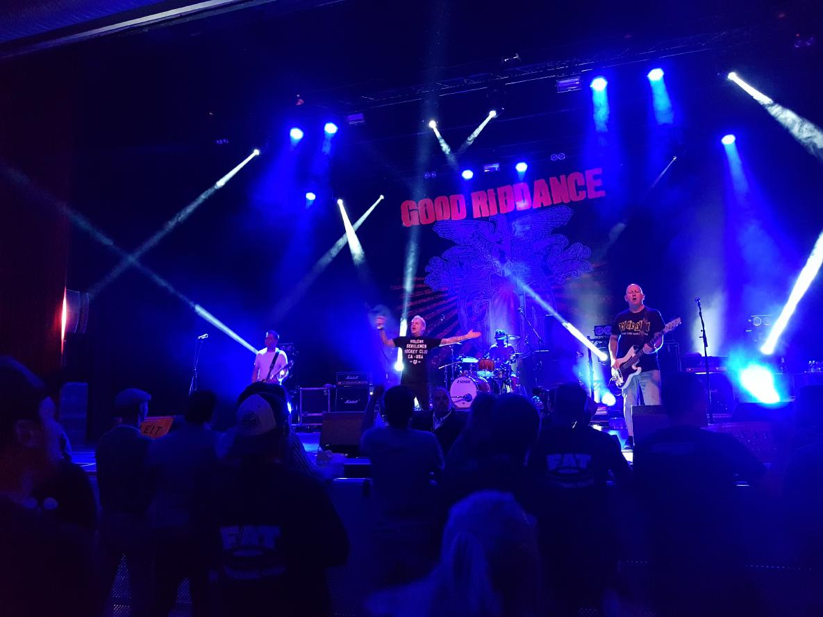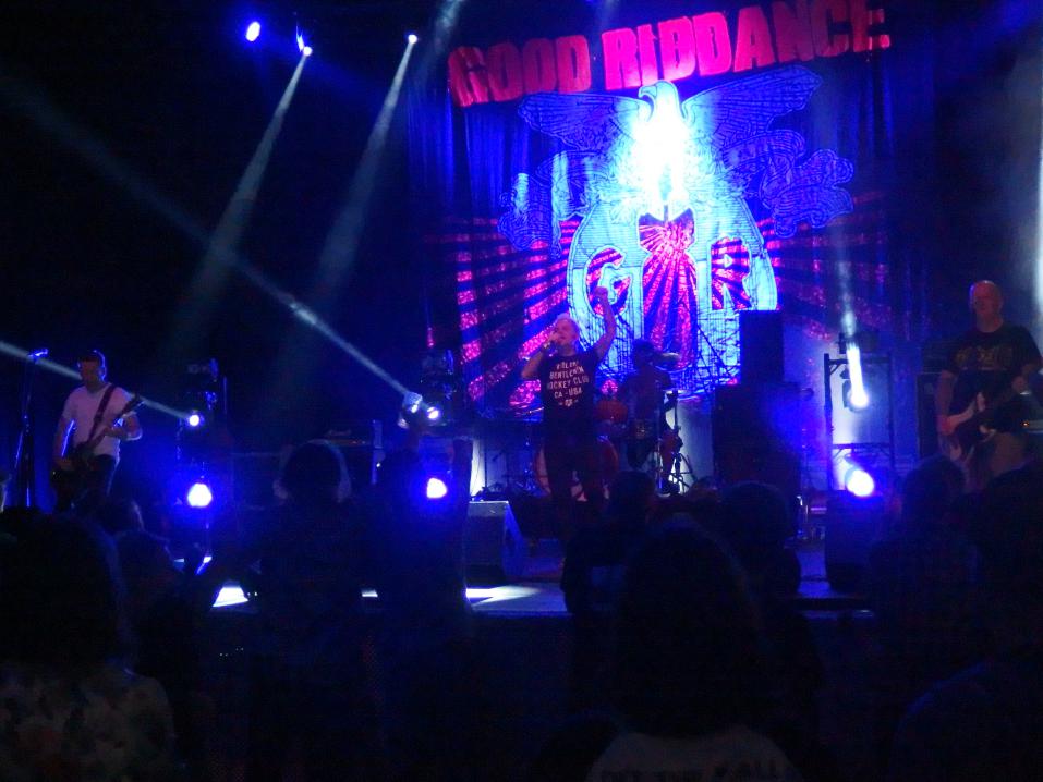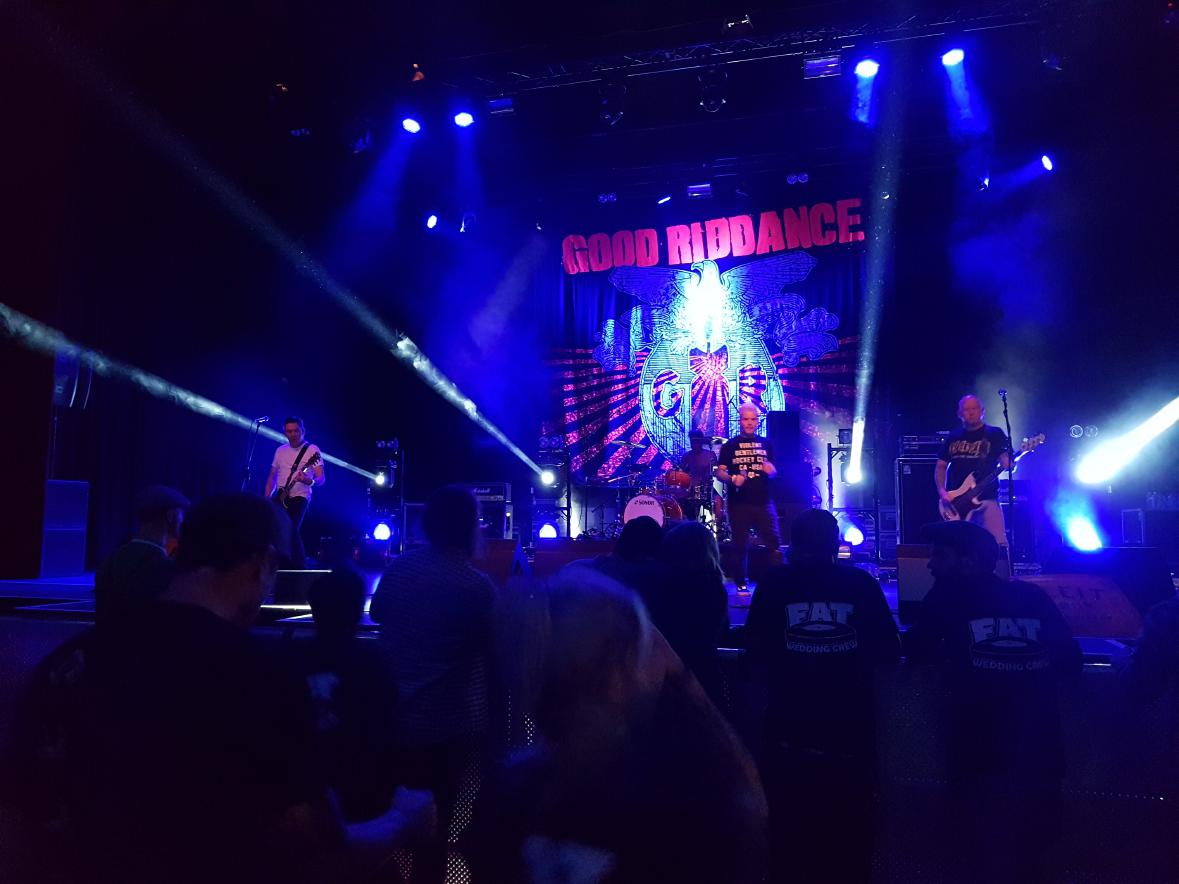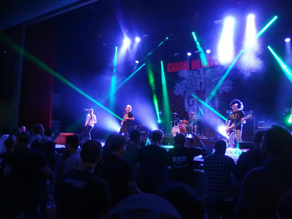 Good Riddance, den eigentlichen Headliner, fand ich eigentlich nie so toll. Das bestätigte sich dann auch recht schnell während des Sets. Zu wenig Abwechslung und zu eintönige Songs für mich. Ich will aber nicht verhehlen, das sie nach den Spermbirds die meisten Zuschauerreaktionen hervorriefen. Auch gab es zwei ganz nette Szenen: so schwenkten sie zum einen die Viva con agua-Fahne (ohne wohl so wirklich zu wissen, was das ist), zum anderen holten sie die männliche Hauptattraktion des Abends auf die Bühne, der mit seiner Perücke für Aufruhr sorgte. Ja, tatsächlich: ein Junggesellenabschied auf einem Punkkonzert. Die Entourage mit NOFX-Shirts war ebenfalls schon aufgefallen. Naja, kann man stehen dazu, wie man will. Der junge Mann musste dann tatsächlich auch Stagediven, wobei die Band ihn schon warnte, dass es ein weiter Weg von der Bühne über den Graben ins Publikum ist. Ich glaube er ist dann von der Absperrung aus gestartet. Ging jedenfalls ohne Verletzungen. Also eigentlich ein ganz netter Auftritt der Fat-Wreck-Band aus Santa Cruz, aber in diesem Leben werden wir keine Freunde mehr.