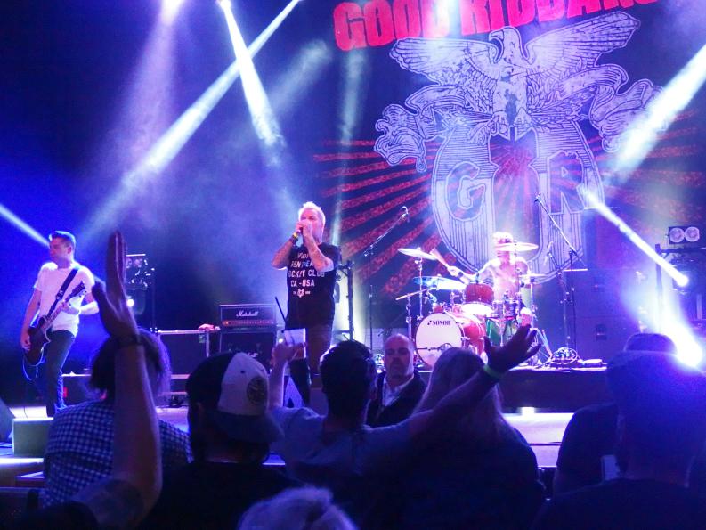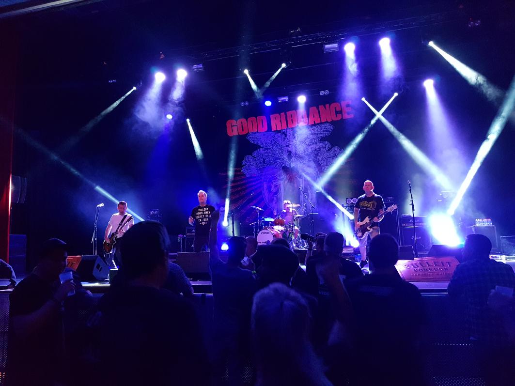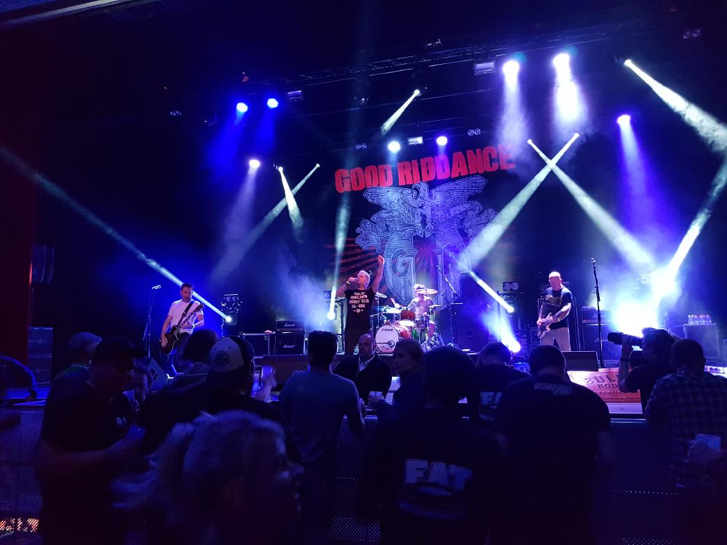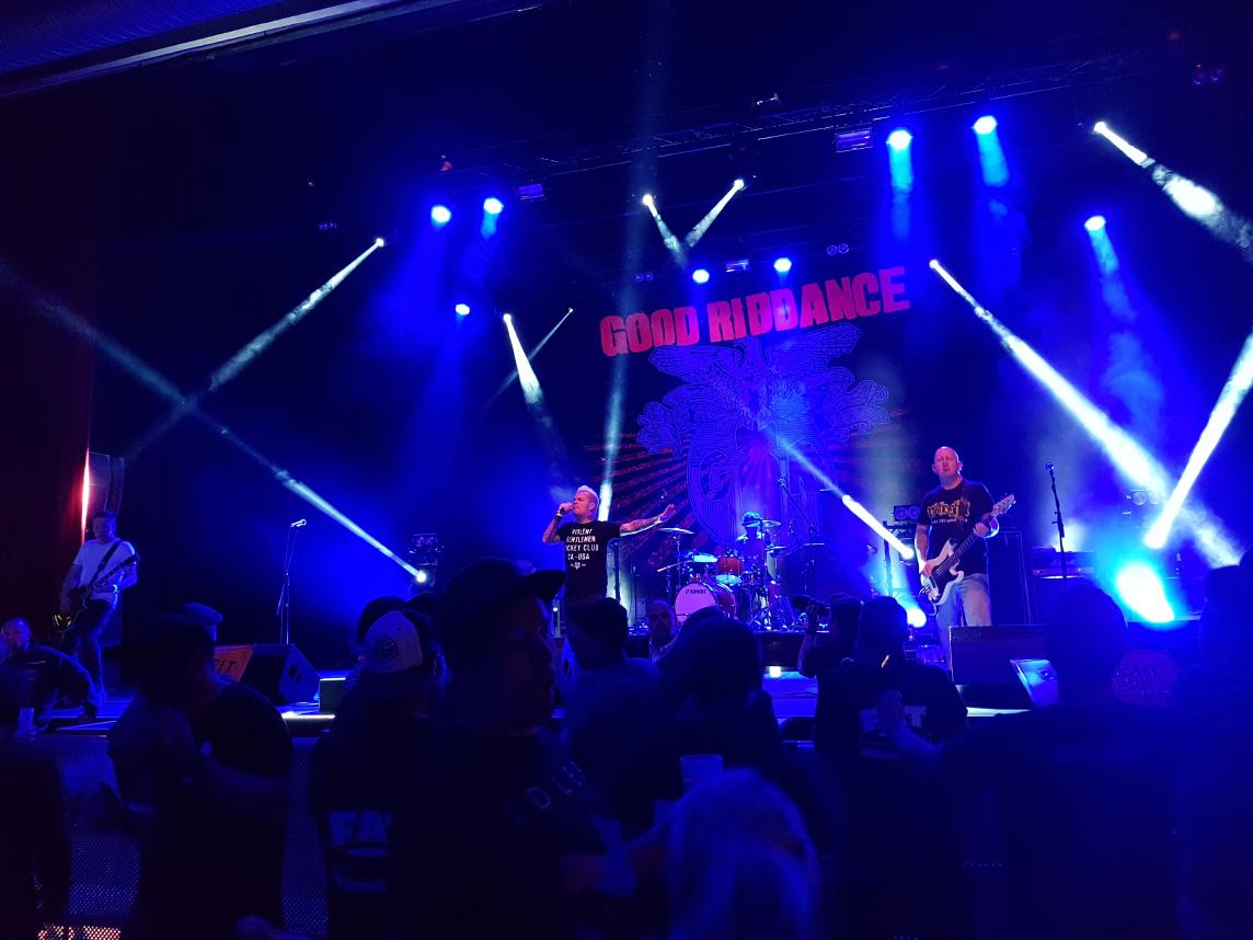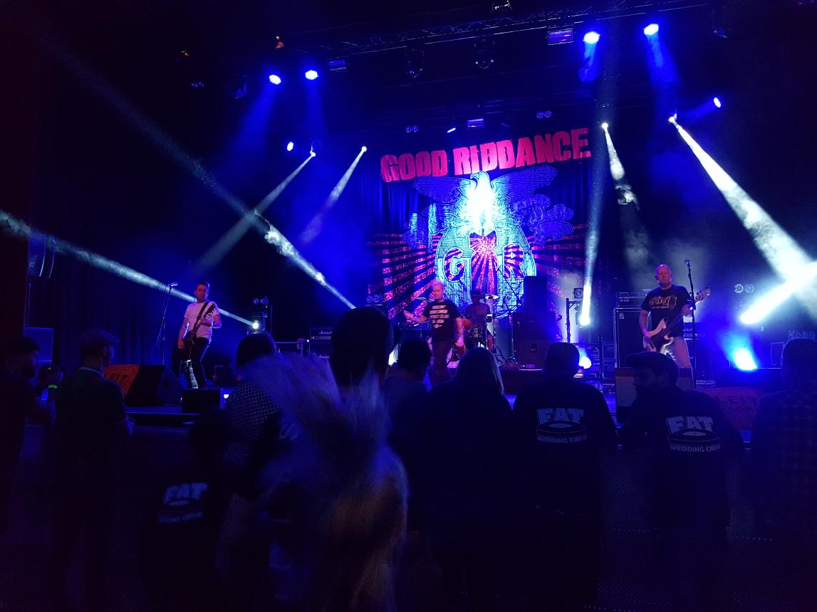 Good Riddance, den eigentlichen Headliner, fand ich eigentlich nie so toll. Das bestätigte sich dann auch recht schnell während des Sets. Zu wenig Abwechslung und zu eintönige Songs für mich. Ich will aber nicht verhehlen, das sie nach den Spermbirds die meisten Zuschauerreaktionen hervorriefen. Auch gab es zwei ganz nette Szenen: so schwenkten sie zum einen die Viva con agua-Fahne (ohne wohl so wirklich zu wissen, was das ist), zum anderen holten sie die männliche Hauptattraktion des Abends auf die Bühne, der mit seiner Perücke für Aufruhr sorgte. Ja, tatsächlich: ein Junggesellenabschied auf einem Punkkonzert. Die Entourage mit NOFX-Shirts war ebenfalls schon aufgefallen. Naja, kann man stehen dazu, wie man will. Der junge Mann musste dann tatsächlich auch Stagediven, wobei die Band ihn schon warnte, dass es ein weiter Weg von der Bühne über den Graben ins Publikum ist. Ich glaube er ist dann von der Absperrung aus gestartet. Ging jedenfalls ohne Verletzungen. Also eigentlich ein ganz netter Auftritt der Fat-Wreck-Band aus Santa Cruz, aber in diesem Leben werden wir keine Freunde mehr.