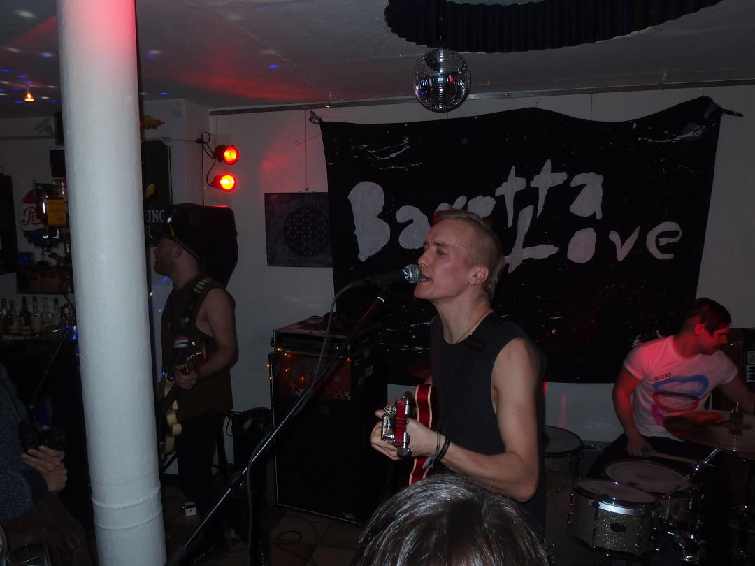 Baretta Love waren da schon ein ganz anderes Kaliber. Toller Punkrock aus Berlin, der in so enger Umgebung auch gut reinknallt. Seit kurzem gehört die Band zur Kidnap- und Rookie-Records-Familie, wo auch dieses Jahr ihr neues Album erscheinen soll. Konnten sich aber wohl kein Laminiergerät leisten. Artig bedankten sie sich auch bei den Smoke Kings, aber einen Seitenhieb konnten sie dann doch nicht lassen: „Manchmal braucht ein Mann nach dem ganzen Schrauben und Fleisch auch eine Schulter zum Anlehnen und Liebe auf Augenhöhe“ und schon gings weiter im Set. Ich bin mit dem Material des Trios leider nicht so vertraut, hole ich gerade mit der Minimal Play (von 2011) nach. Der Gesang kommt live etwas verzerrter rüber. Musikalisch schnell gespielter Punk mit viel Freude und Dankbarkeit vorgetragen.