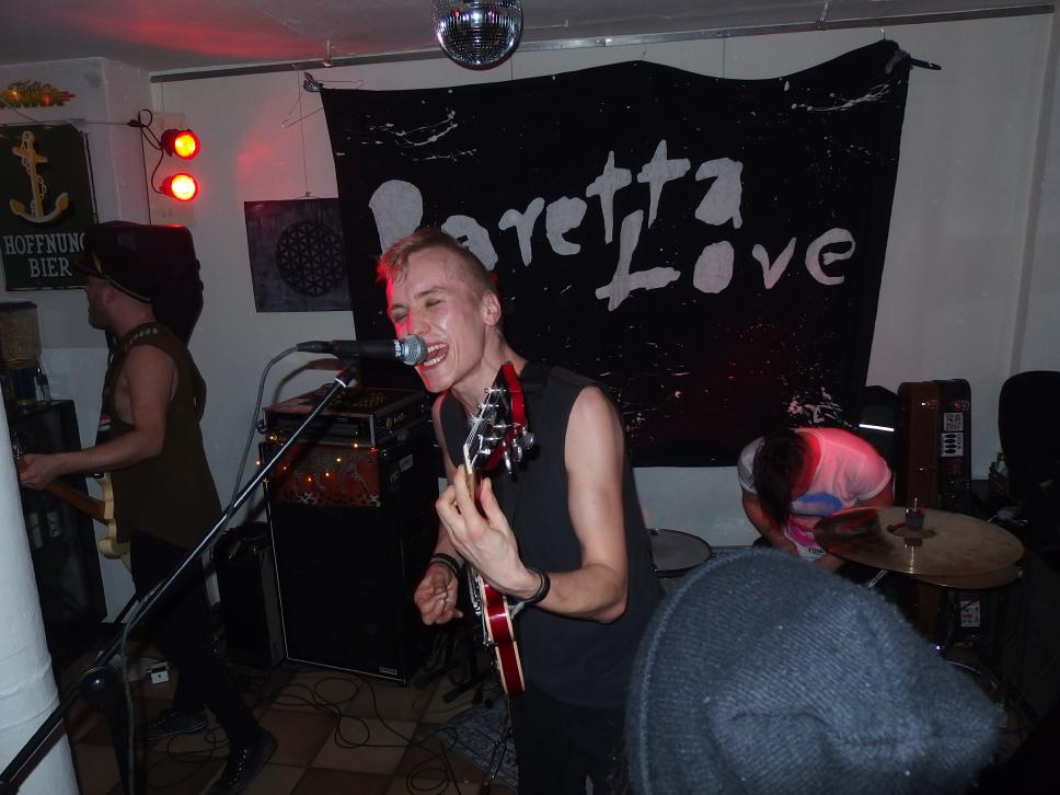 Achso, beinahe hätte ich es vergessen: Das Konzert war kostenlos. Gegen Ende des Gigs wurde ein Hut (beziehungsweise ein Eimer) herumgereicht, so dass beide Bands etwas Gage erhielten. Meiner Erfahrung nach gibt man dann auch eher mehr, so dass sich das für Bands und Veranstalter durchaus rechnet. Zumal so die Ausrede nicht zählt, man habe das Konzert nicht besucht, weil es zu teuer war. So füllt sich ein Gasthaus auch schneller. Die Bands kriegen ja auch noch etwas Kohle über den Merchverkauf, obwohl nur Baretta Love was da hatten (und leider keine LPs, die waren aus).