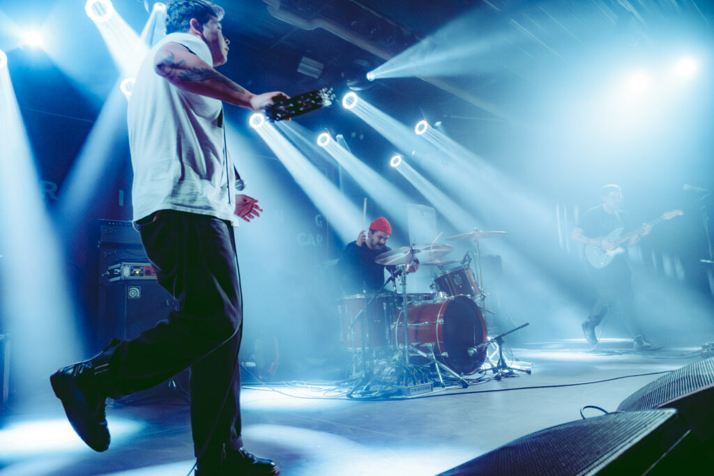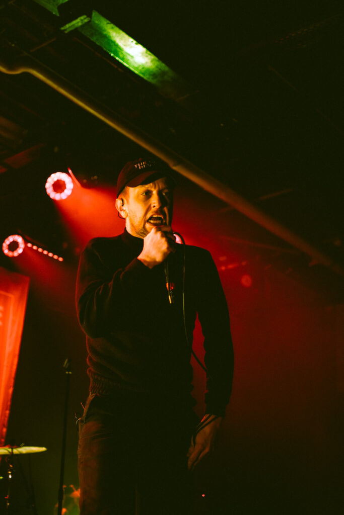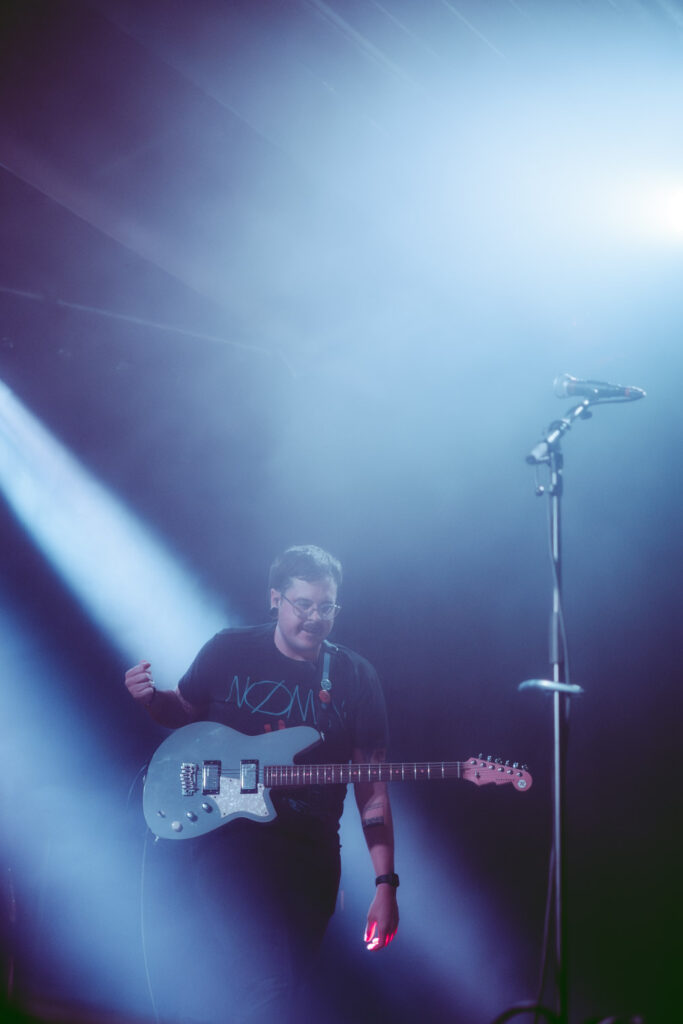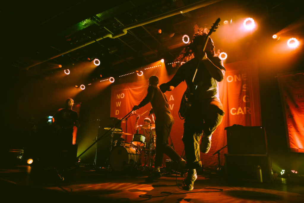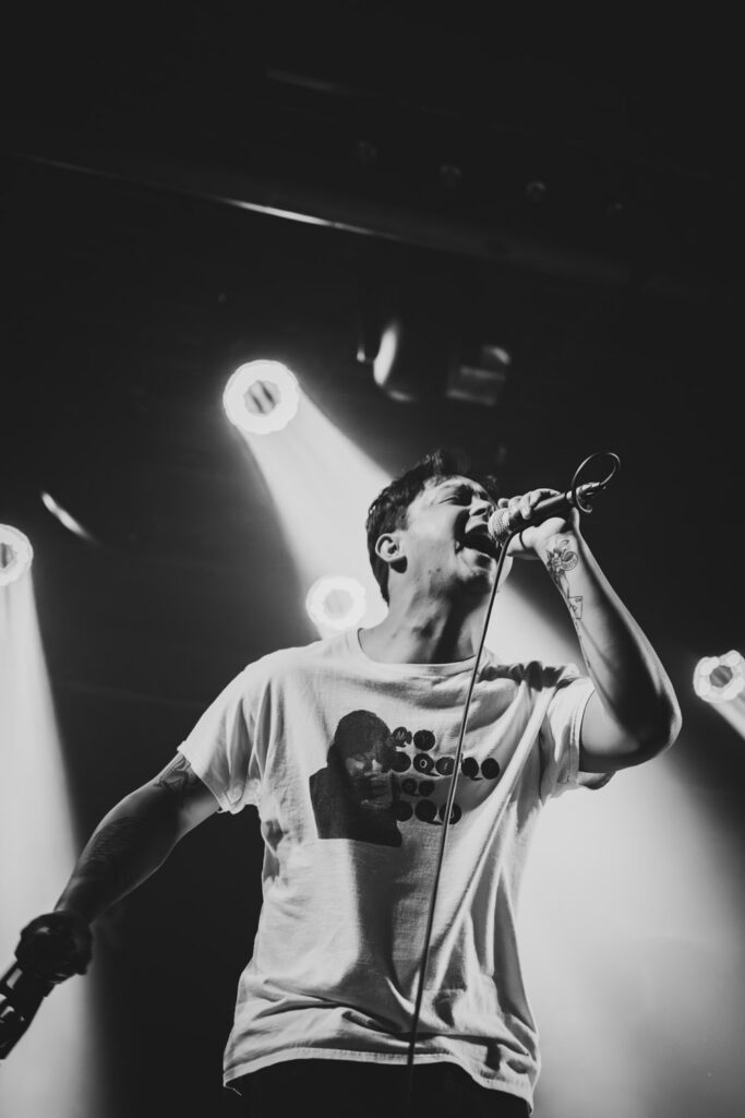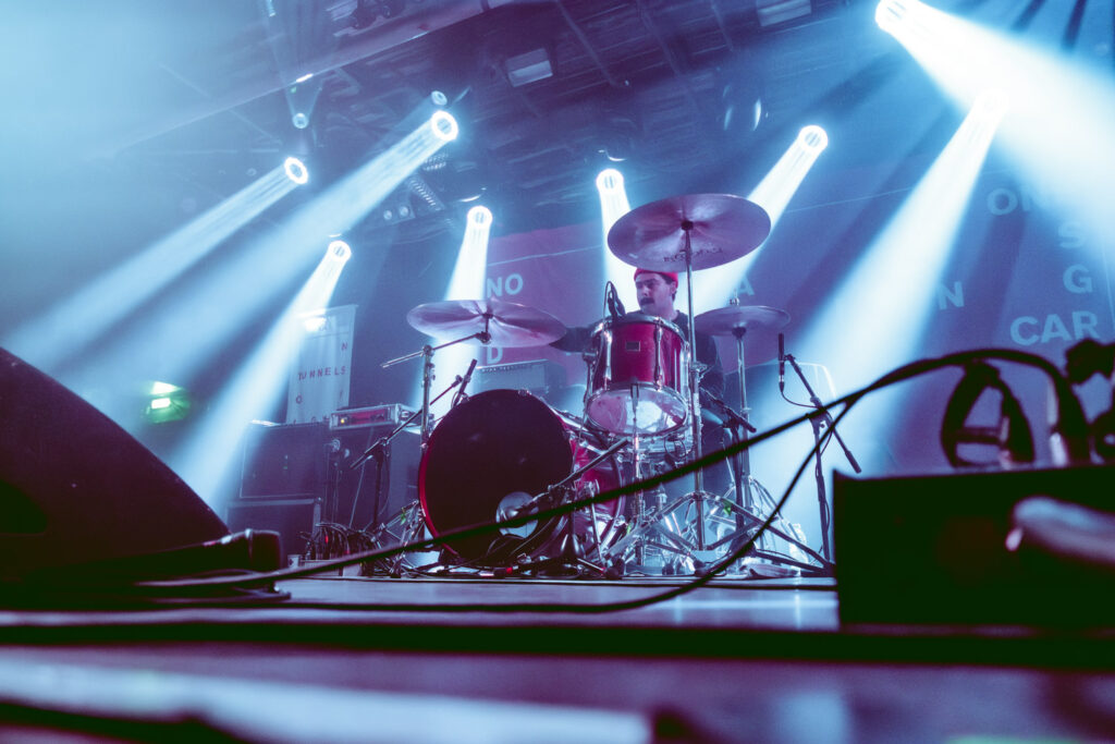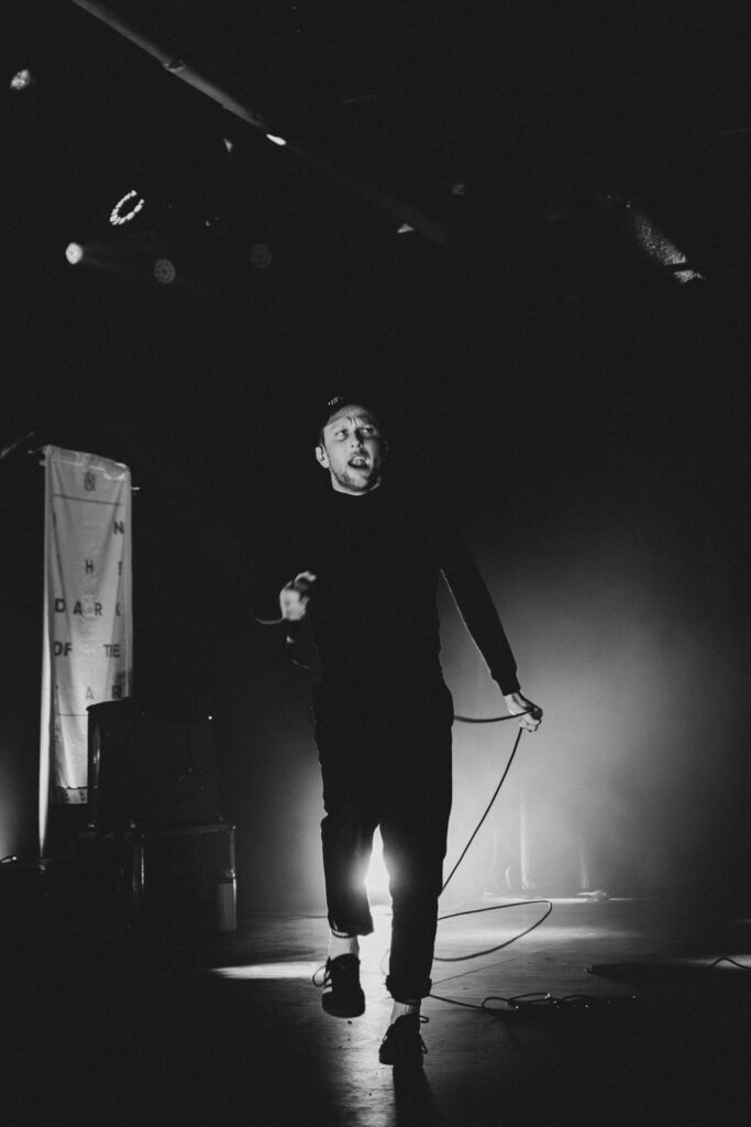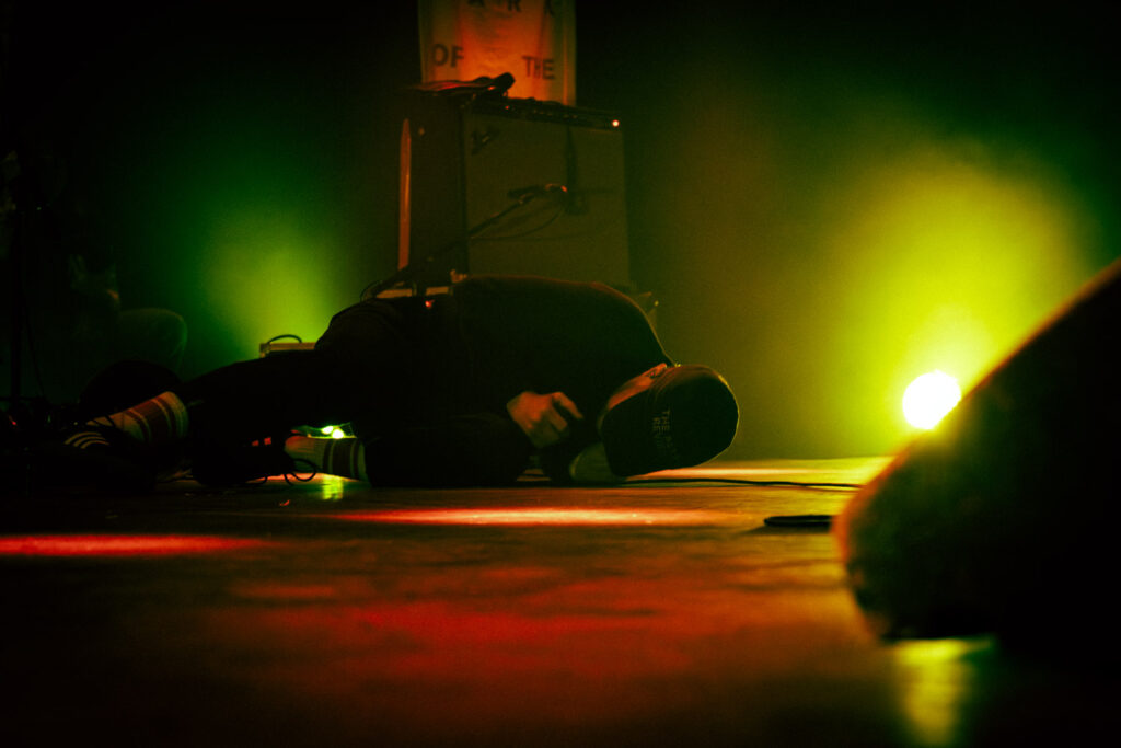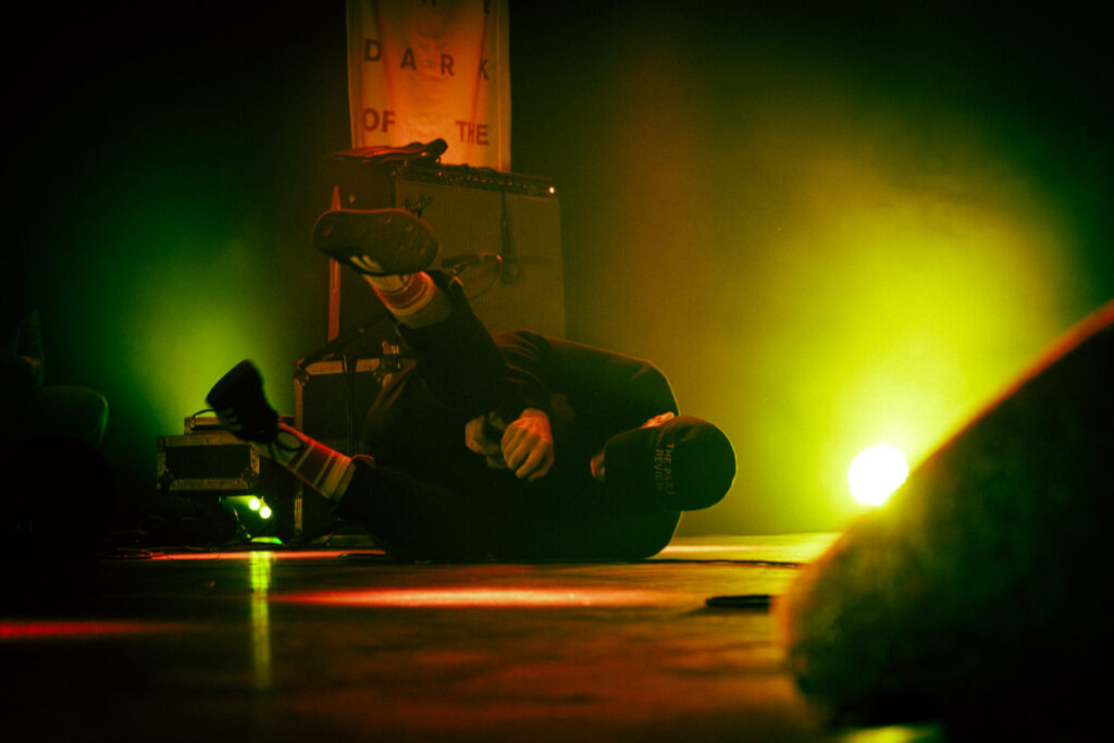 Als dann La Dispute die Bühne betreten, ist das Publikum von Anfang an voll dabei. Nachdem die Bühnenpräsenz der ersten zwei Bands eher als statisch zu beschreiben ist, bin ich erstmal ganz schön überwältigt von der Energie die Sänger Jordan da aufbringt. Leider ist er direkt beim zweiten (oder dritten) Song gestürzt und hat sich wohl das Bein verletzt – er gibt aber zu, nicht zu wissen, wie er eine Show spielen sollte, ohne sich zu bewegen, daher macht er einfach weiter. Autsch, hoffentlich wird er das nicht bereuen! Das Set ist richtig gut aufeinander abgestimmt, das Publikum wechselt zwischen gebanntem Lauschen, gemeinschaftlichem Kopfnicken und totaler Eskalation. Besonders positiv fällt mir an diesem Abend auf, wie sich atmosphärische Elemente und technisch hochpräzise Riffs durch die Songs aller drei Bands durchziehen. Achja, und der Schellenkranz findet sich auch bei La Dispute wieder!