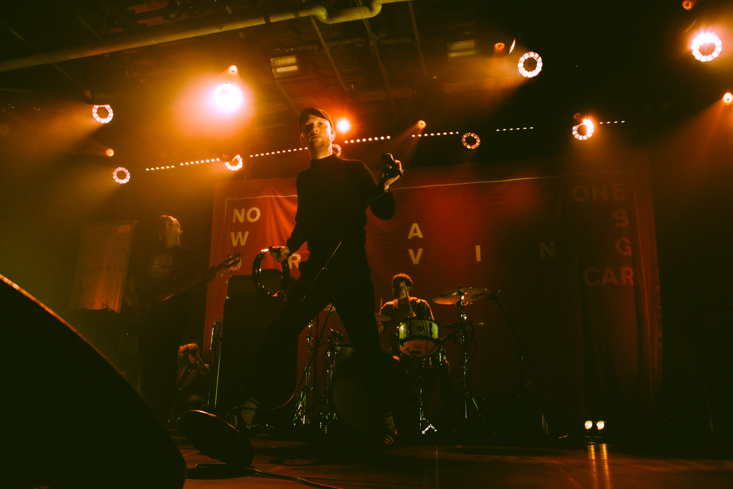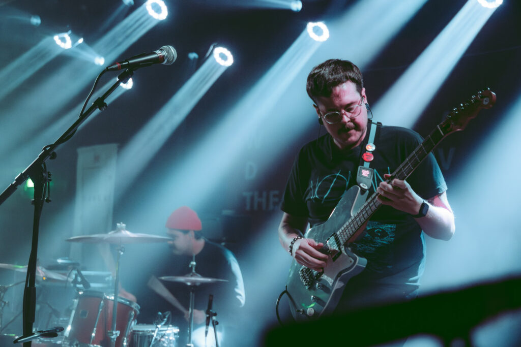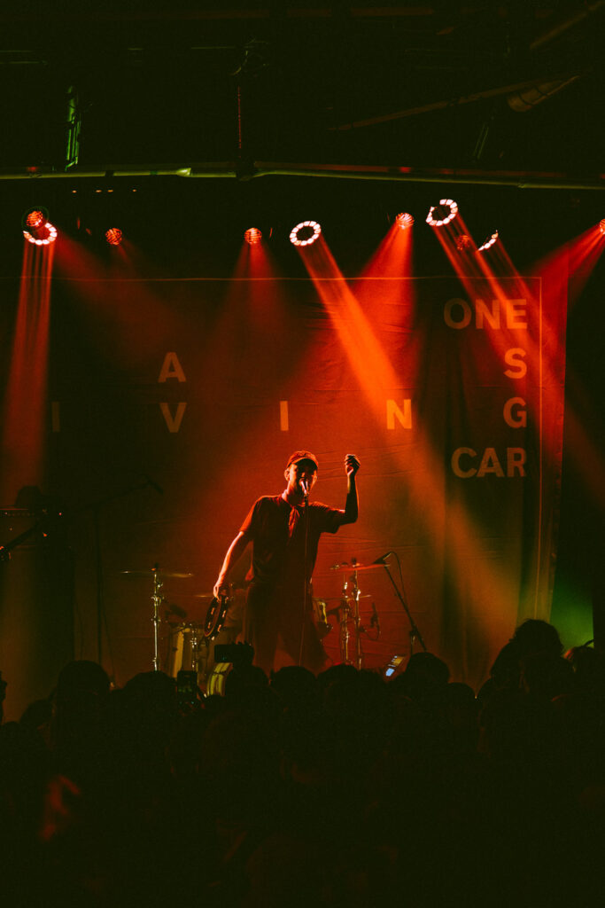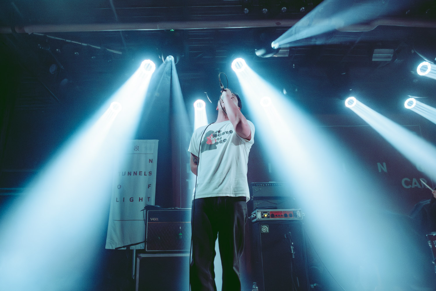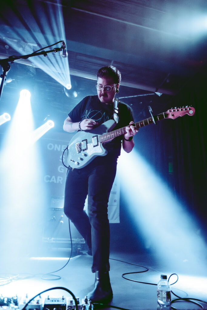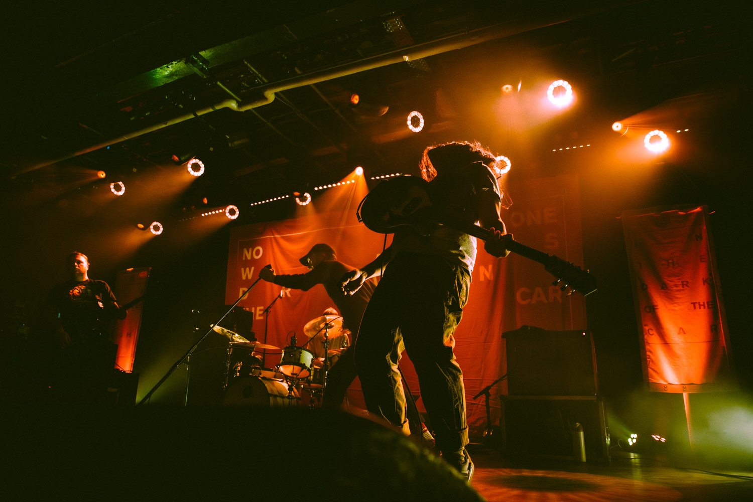 Als dann La Dispute die Bühne betreten, ist das Publikum von Anfang an voll dabei. Nachdem die Bühnenpräsenz der ersten zwei Bands eher als statisch zu beschreiben ist, bin ich erstmal ganz schön überwältigt von der Energie die Sänger Jordan da aufbringt. Leider ist er direkt beim zweiten (oder dritten) Song gestürzt und hat sich wohl das Bein verletzt – er gibt aber zu, nicht zu wissen, wie er eine Show spielen sollte, ohne sich zu bewegen, daher macht er einfach weiter. Autsch, hoffentlich wird er das nicht bereuen! Das Set ist richtig gut aufeinander abgestimmt, das Publikum wechselt zwischen gebanntem Lauschen, gemeinschaftlichem Kopfnicken und totaler Eskalation. Besonders positiv fällt mir an diesem Abend auf, wie sich atmosphärische Elemente und technisch hochpräzise Riffs durch die Songs aller drei Bands durchziehen. Achja, und der Schellenkranz findet sich auch bei La Dispute wieder!