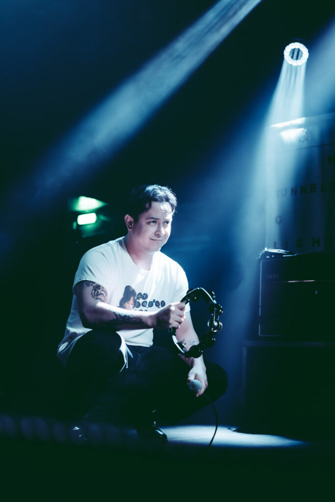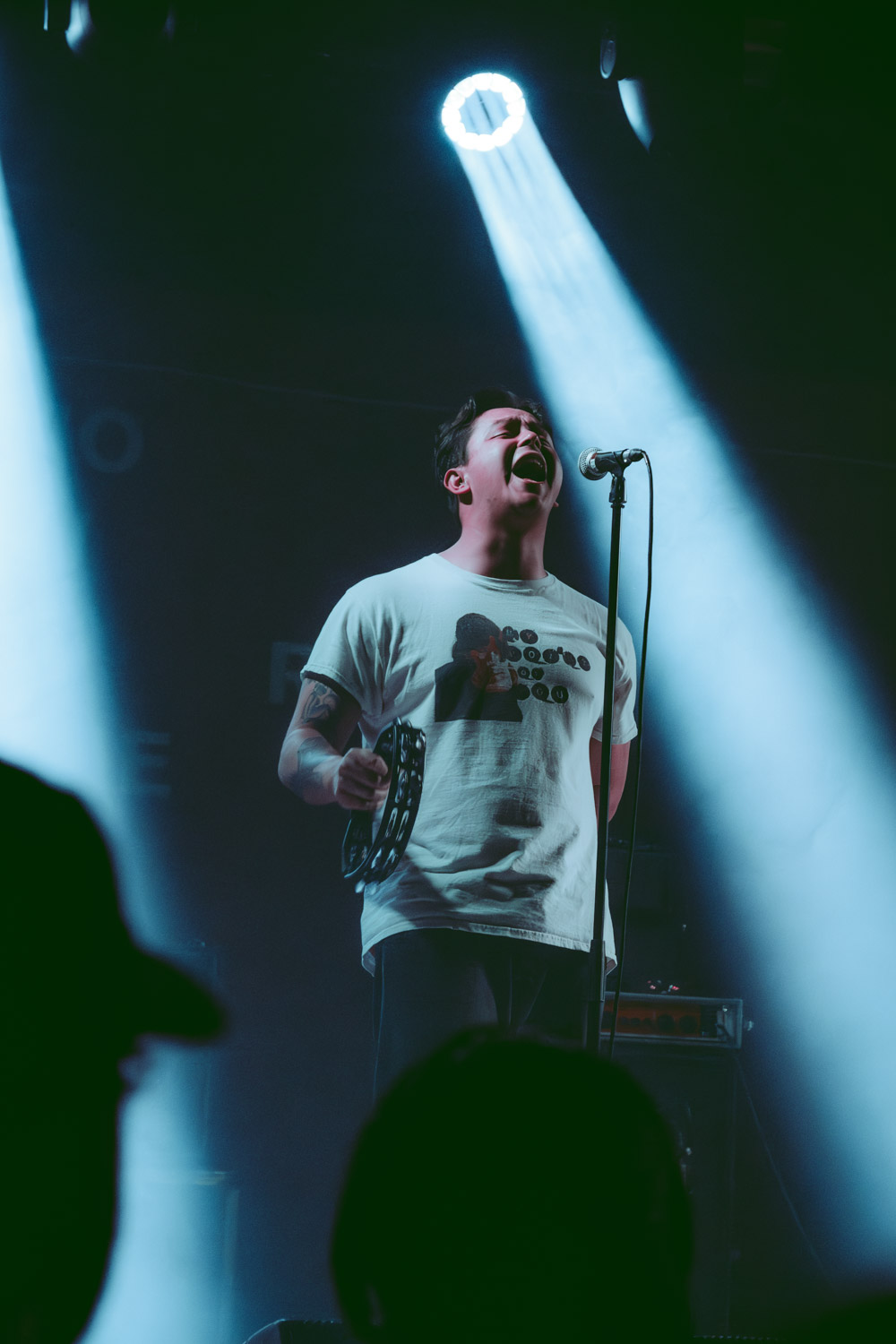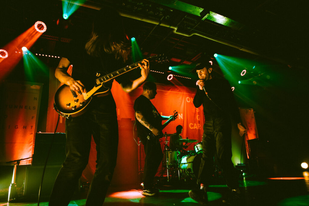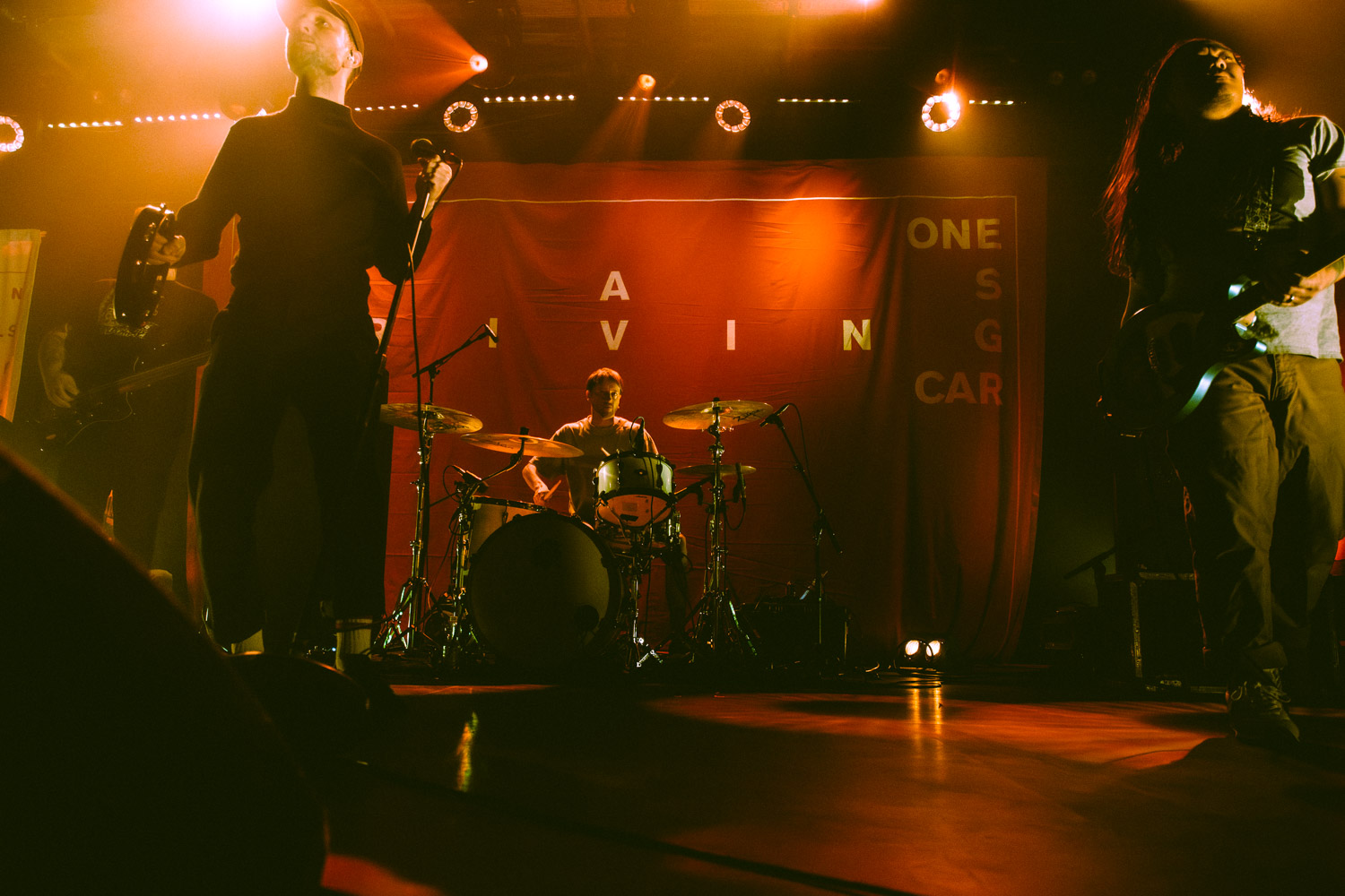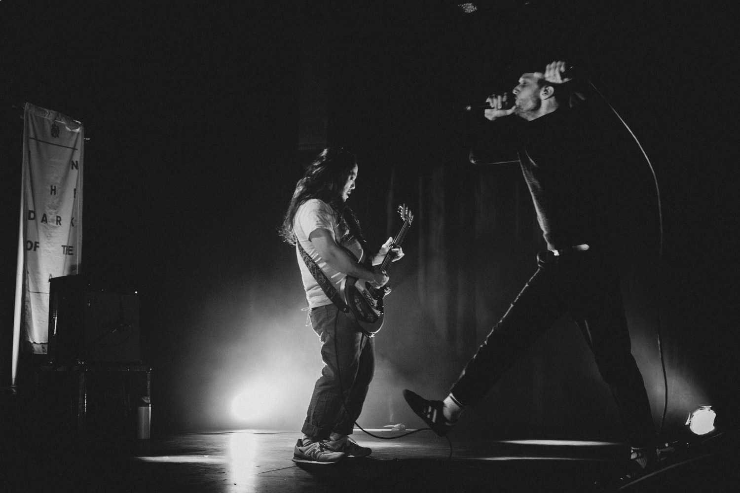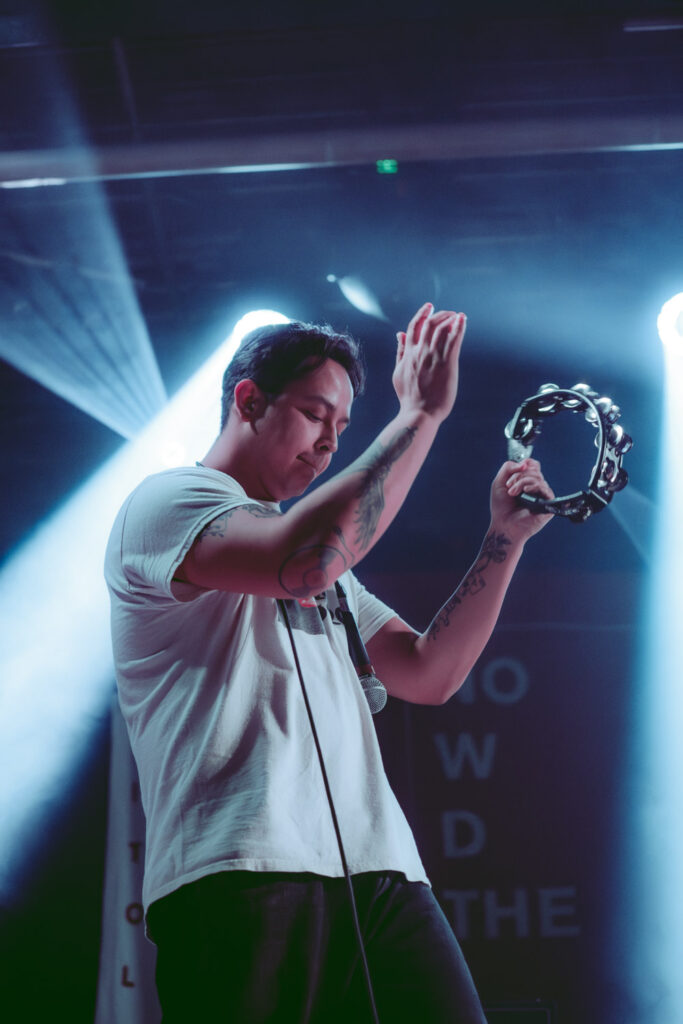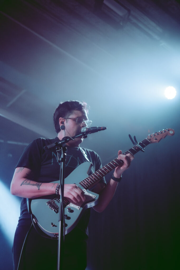 Als dann La Dispute die Bühne betreten, ist das Publikum von Anfang an voll dabei. Nachdem die Bühnenpräsenz der ersten zwei Bands eher als statisch zu beschreiben ist, bin ich erstmal ganz schön überwältigt von der Energie die Sänger Jordan da aufbringt. Leider ist er direkt beim zweiten (oder dritten) Song gestürzt und hat sich wohl das Bein verletzt – er gibt aber zu, nicht zu wissen, wie er eine Show spielen sollte, ohne sich zu bewegen, daher macht er einfach weiter. Autsch, hoffentlich wird er das nicht bereuen! Das Set ist richtig gut aufeinander abgestimmt, das Publikum wechselt zwischen gebanntem Lauschen, gemeinschaftlichem Kopfnicken und totaler Eskalation. Besonders positiv fällt mir an diesem Abend auf, wie sich atmosphärische Elemente und technisch hochpräzise Riffs durch die Songs aller drei Bands durchziehen. Achja, und der Schellenkranz findet sich auch bei La Dispute wieder!