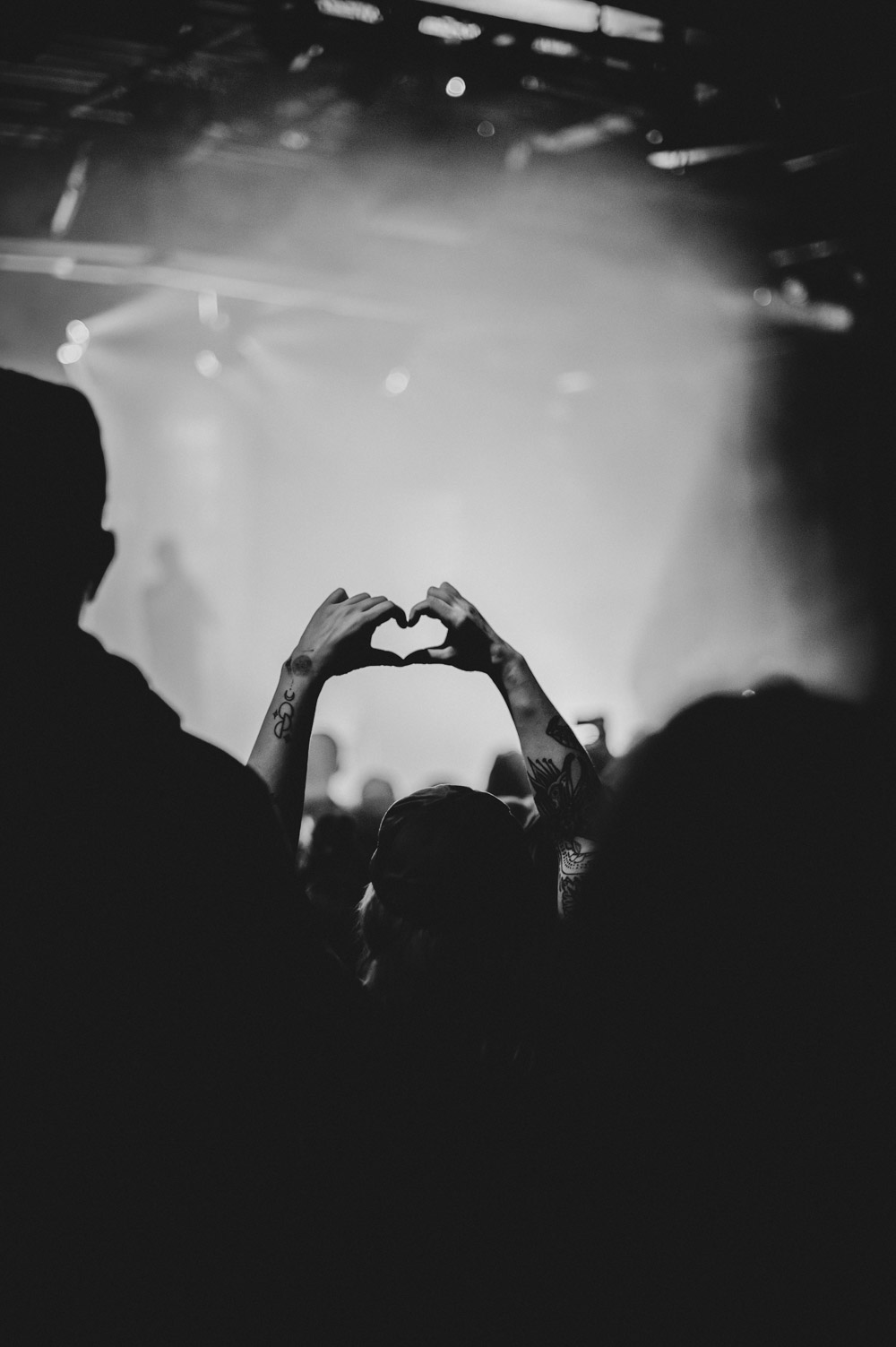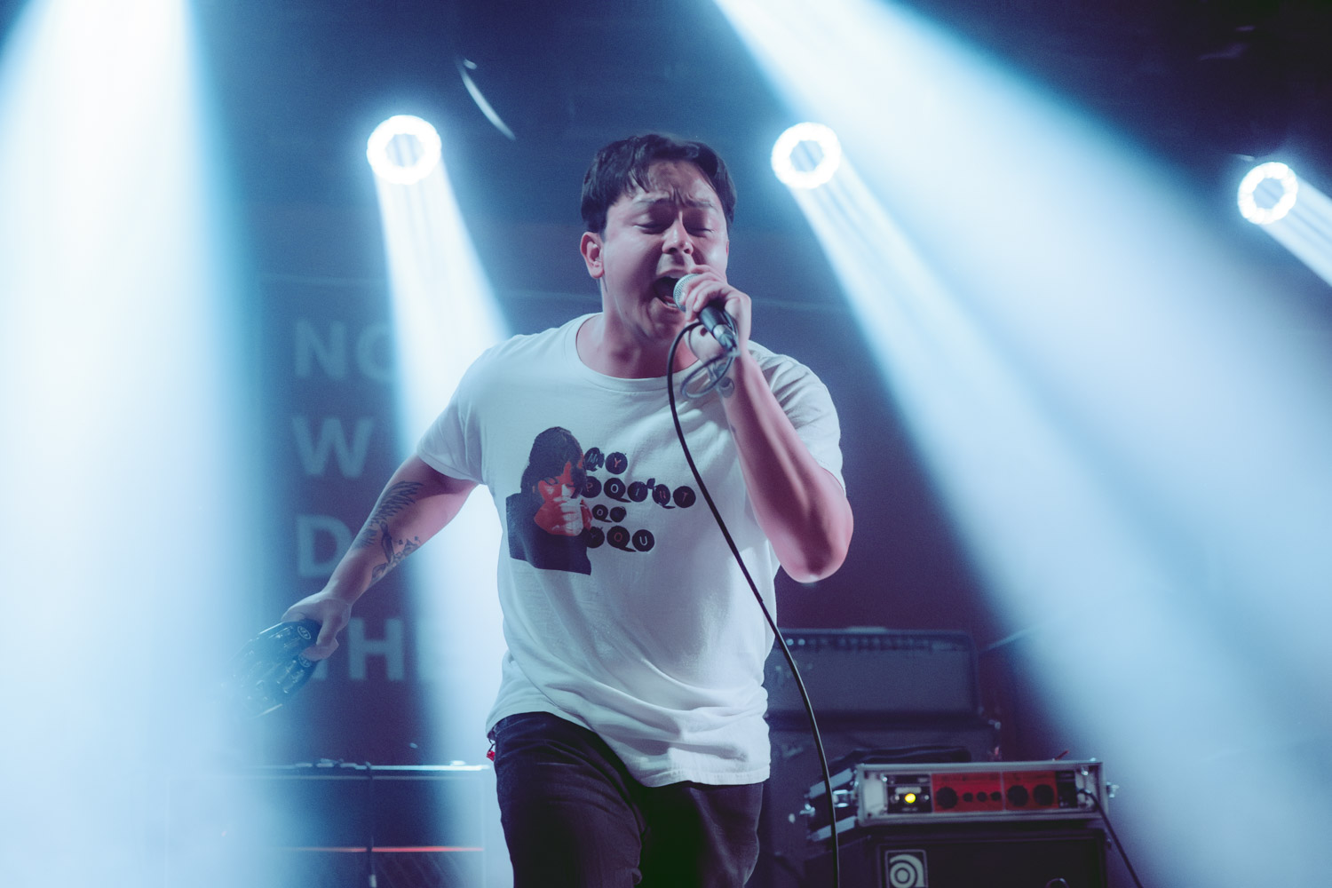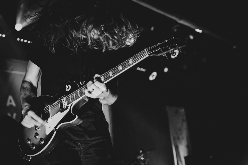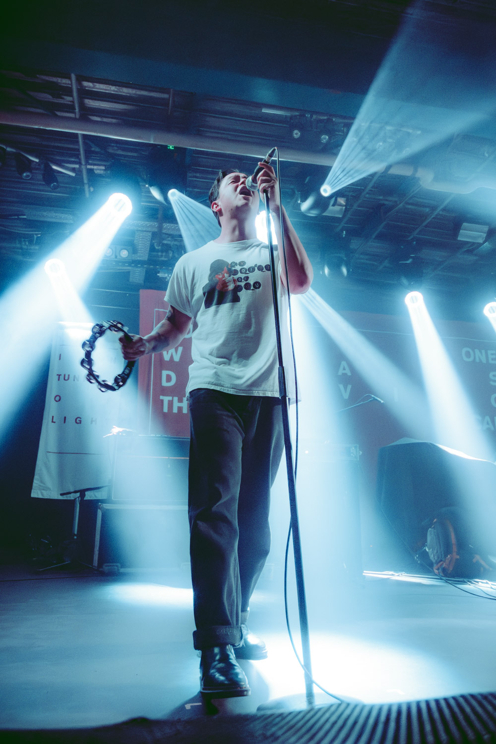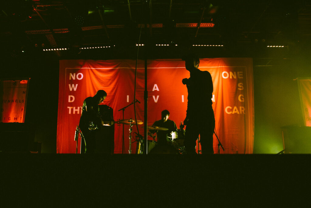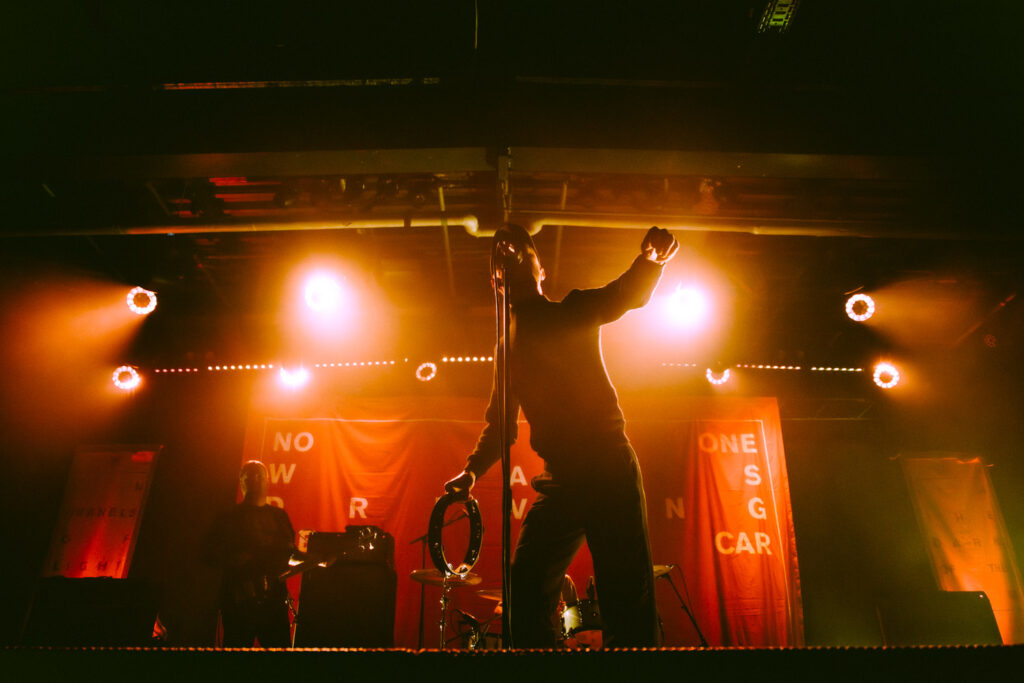 Als dann La Dispute die Bühne betreten, ist das Publikum von Anfang an voll dabei. Nachdem die Bühnenpräsenz der ersten zwei Bands eher als statisch zu beschreiben ist, bin ich erstmal ganz schön überwältigt von der Energie die Sänger Jordan da aufbringt. Leider ist er direkt beim zweiten (oder dritten) Song gestürzt und hat sich wohl das Bein verletzt – er gibt aber zu, nicht zu wissen, wie er eine Show spielen sollte, ohne sich zu bewegen, daher macht er einfach weiter. Autsch, hoffentlich wird er das nicht bereuen! Das Set ist richtig gut aufeinander abgestimmt, das Publikum wechselt zwischen gebanntem Lauschen, gemeinschaftlichem Kopfnicken und totaler Eskalation. Besonders positiv fällt mir an diesem Abend auf, wie sich atmosphärische Elemente und technisch hochpräzise Riffs durch die Songs aller drei Bands durchziehen. Achja, und der Schellenkranz findet sich auch bei La Dispute wieder!