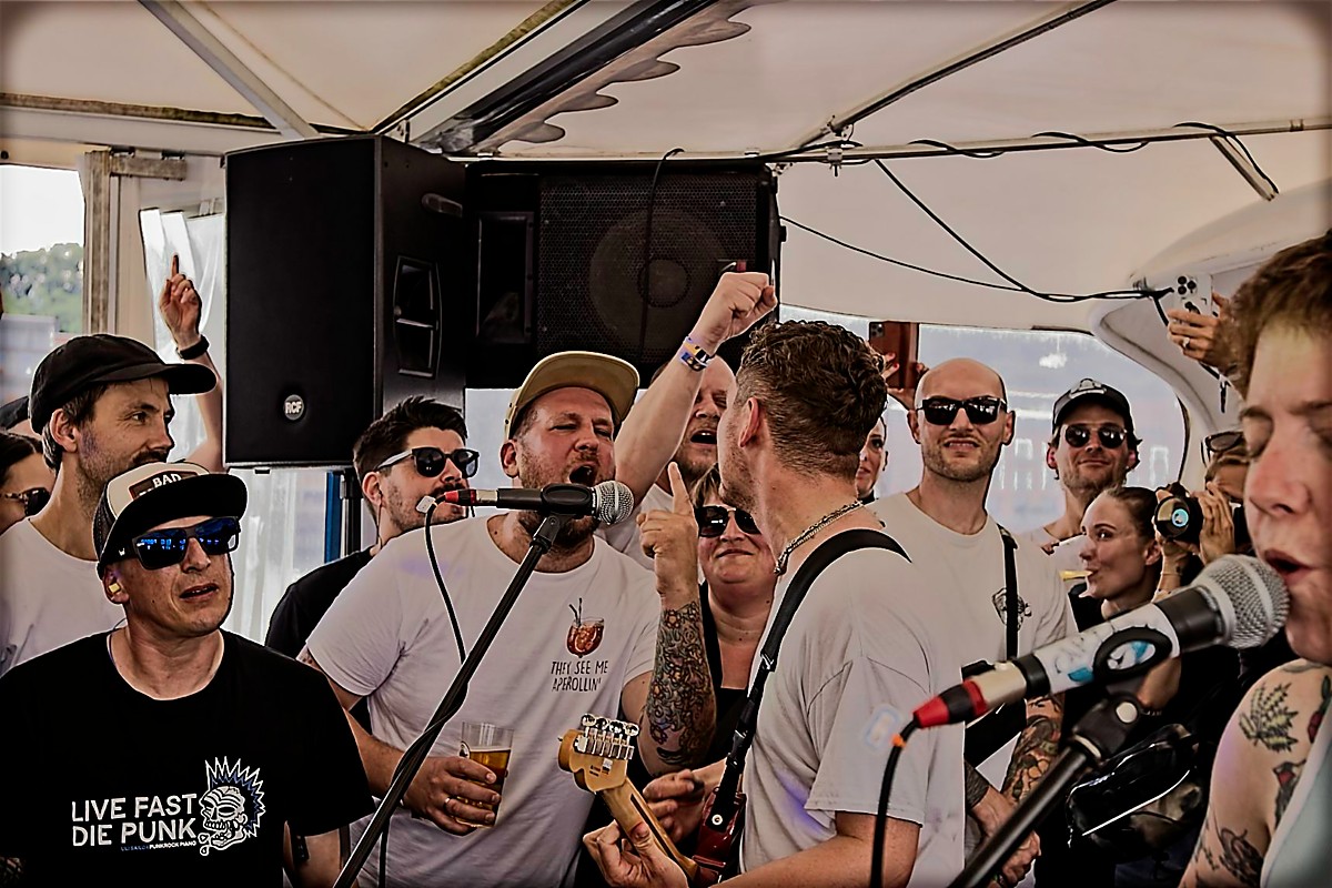 Mit Überyou spielte am frühen Abend so etwas wie der heimliche Headliner des Festivals. Die Band aus der Schweiz hatte bereits häufiger das Booze Cruise gespielt und durfte auch zum Abschluss nicht fehlen. Ein Best-Of-Set ergänzt um diverse Cover-Songs lieferte dann auch den perfekten Soundtrack für völligen Ausnahmezustand.