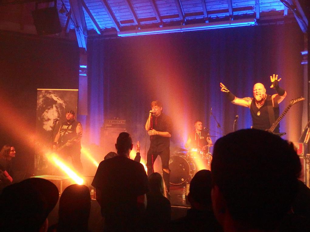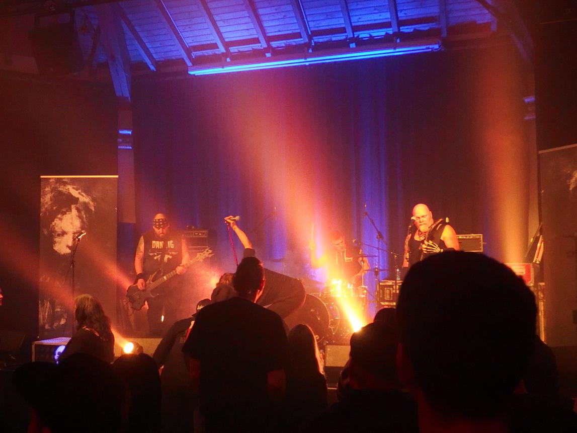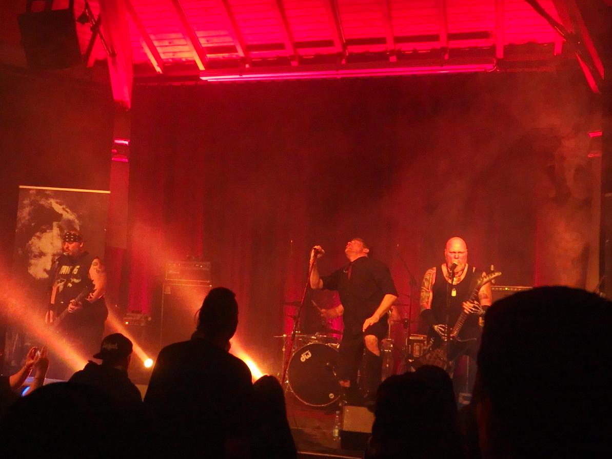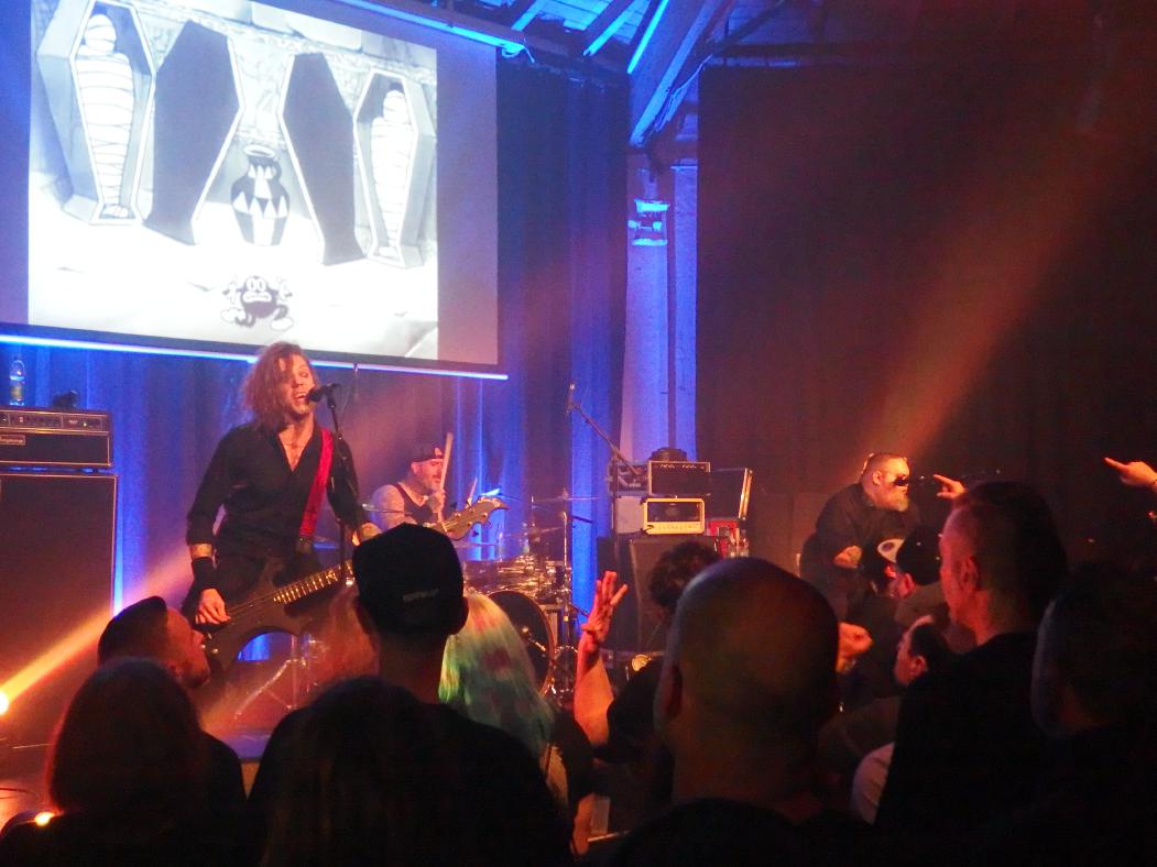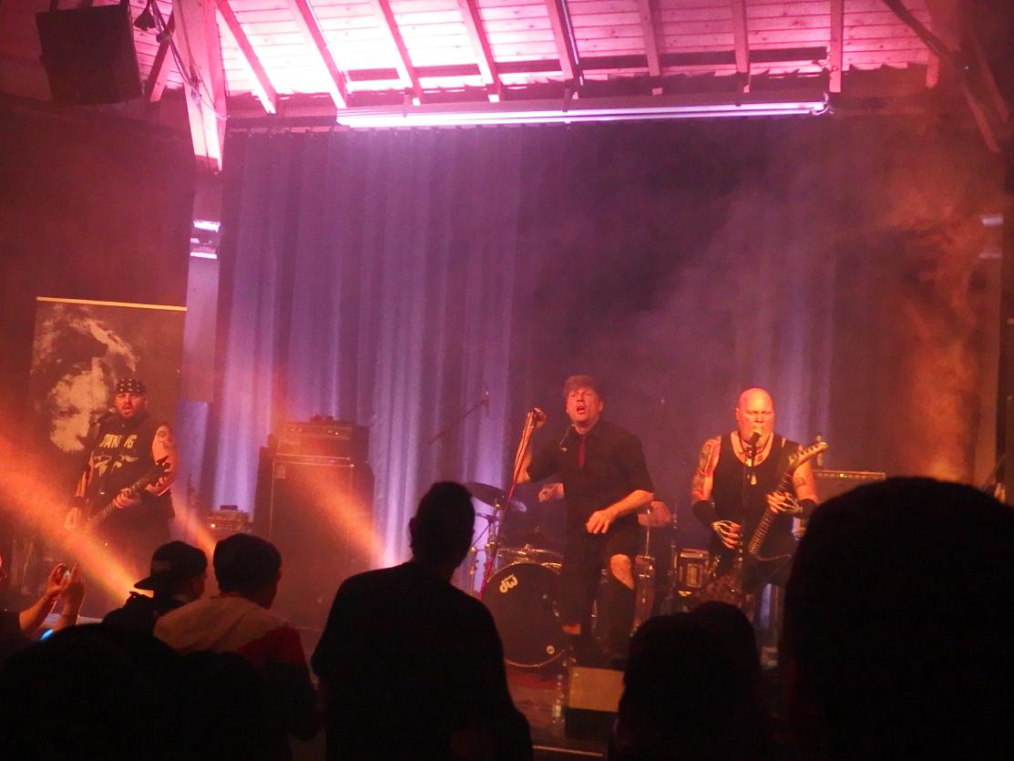 Wenn auch The Crimson Ghosts noch nie von neunkirchen gehört haben, so hatten sie doch mit Blitzkid bereits in Illingen gespielt, was zum Landkreis Neunkirchen gehört. Die Amis jedenfalls erinnerten sich an diese Zeit und in einem emotionalen Statement erzählten sie von den harten, aber doch schönen Nächten in dem Jugendzentrum und erzählten, dass jedes Hotel dort verflucht gewesen sei. Auch ansonsten waren Argyle Goolsby und TB Monstrosity sehr gut drauf. Zwischen 2012 und 2019 aufgelöst und seitdem wieder zusammen, hatten sie sich für eine Tour tatsächlich Ryan Manning ausgeliehen, der seit 2022 für Pentagram trommelt und sich das gesamte Set in vier Stunden draufgeschafft hatte. So jedenfalls die Legende. Er gehört jedenfalls wohl nun fest zur Band. Und was es heißt ein solches Set draufzuschaffen: die Band spielt ja bekanntlich Misfits-beeinflussten Punk und spielte mal locker länger als eine Stunde. Insgesamt 21 Songs.