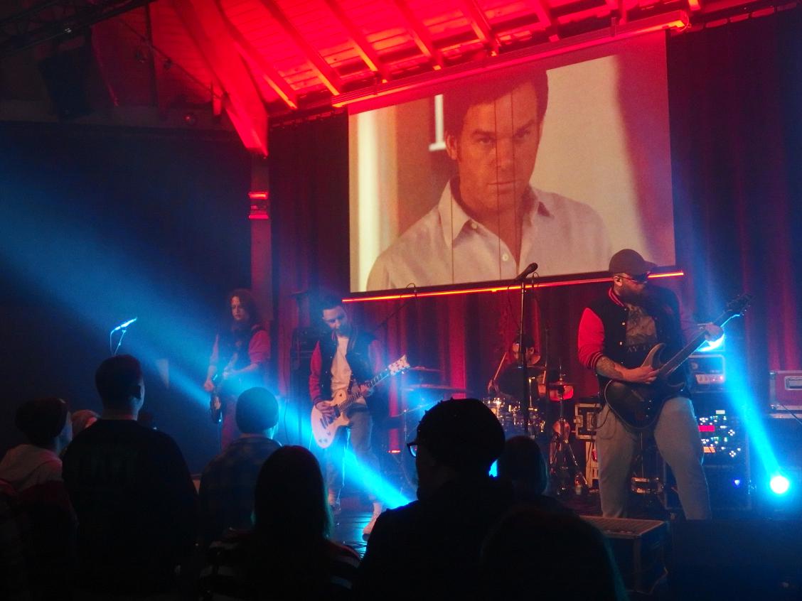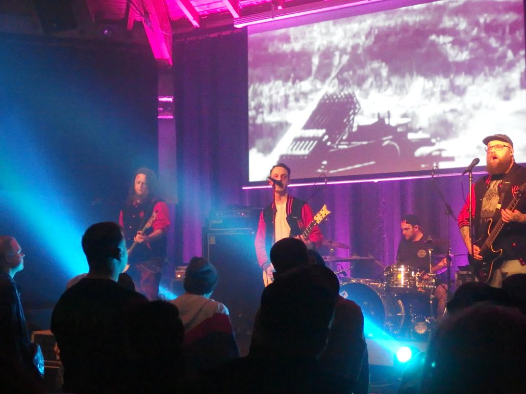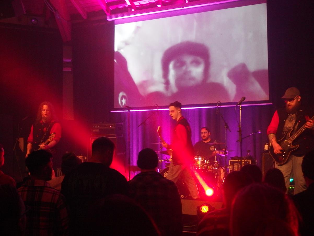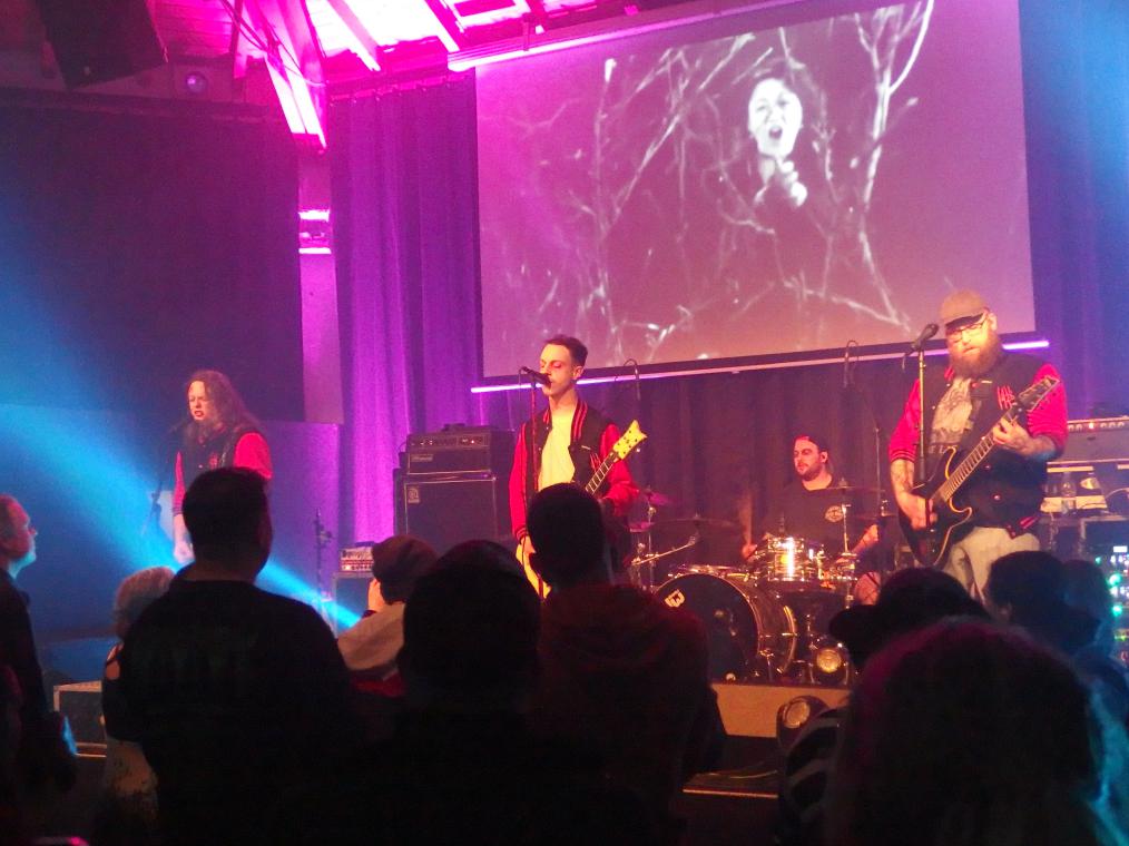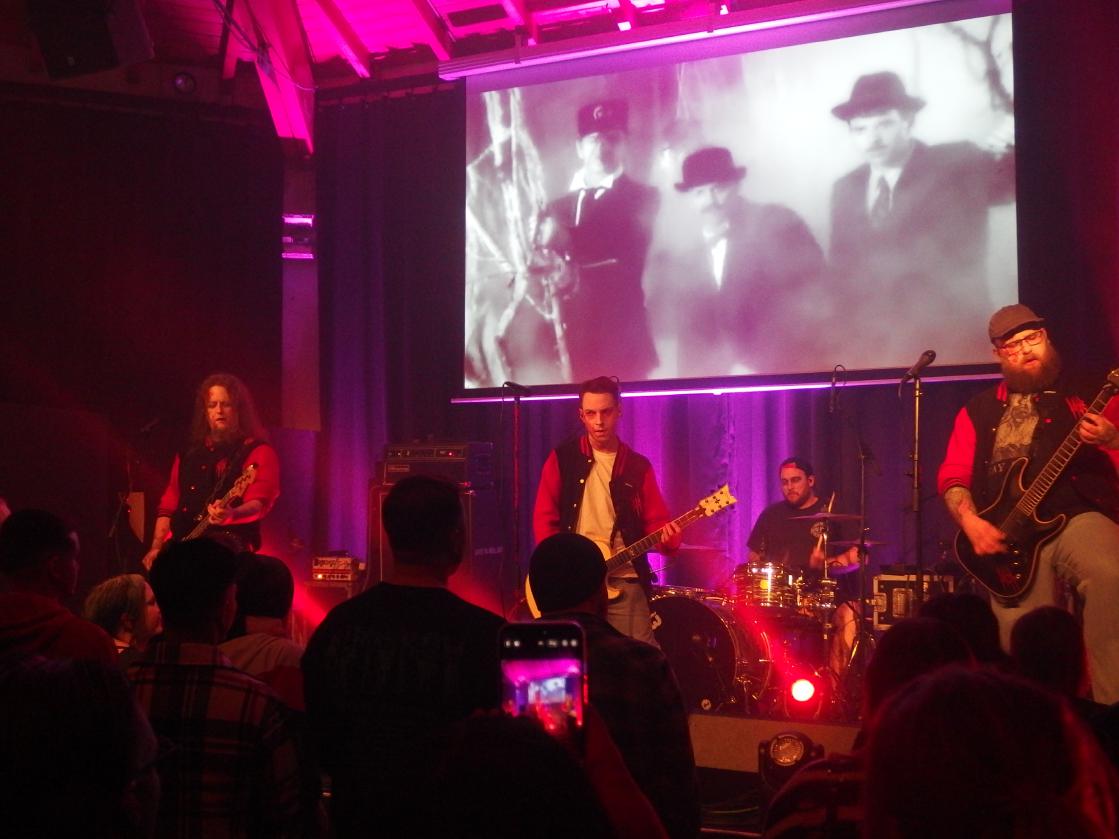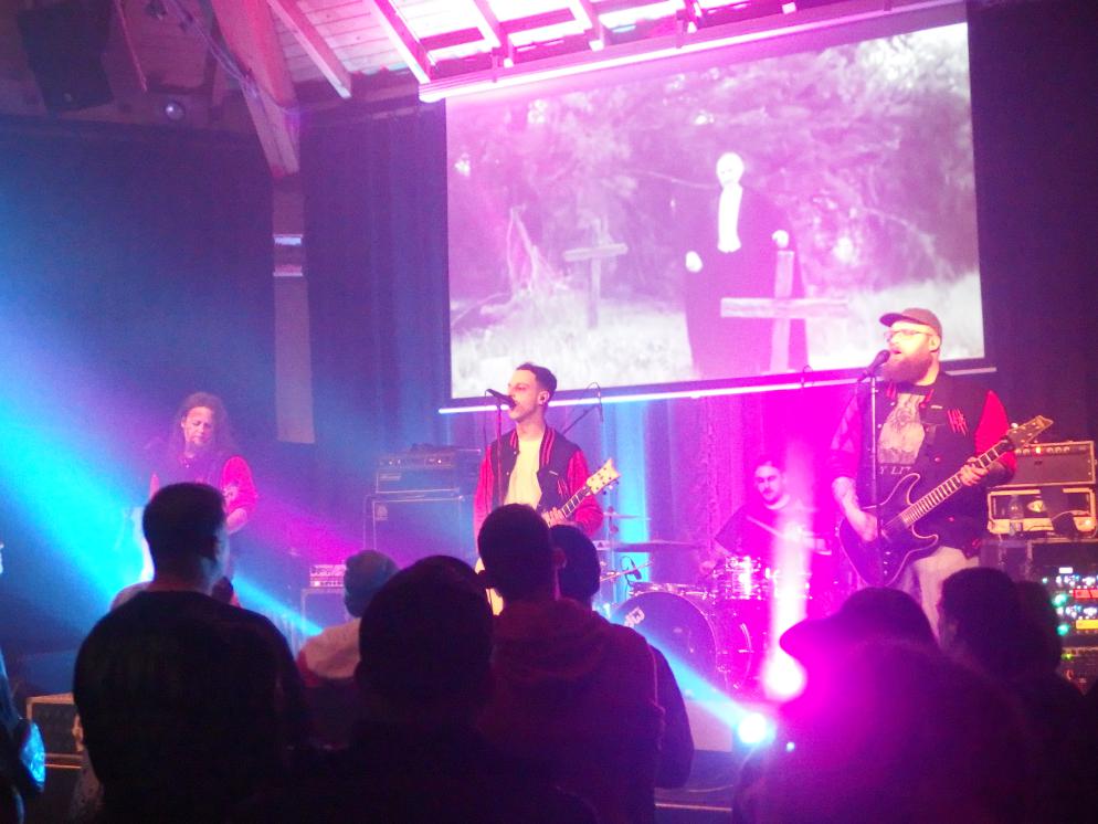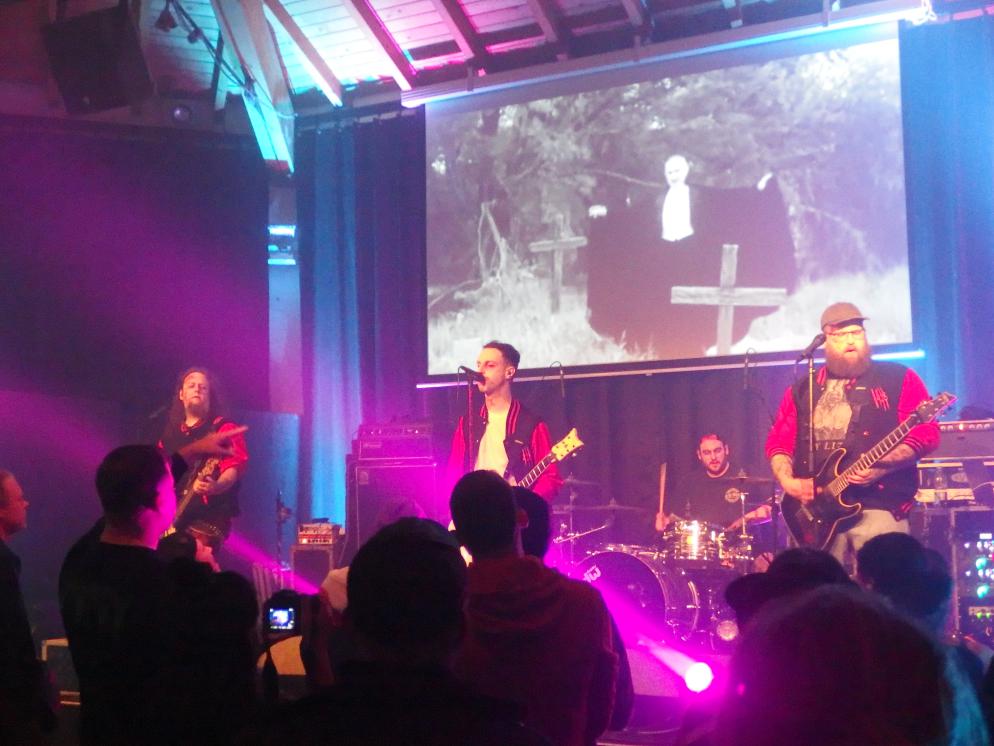 Zunächst war es aber an The 1428 den Abend zu eröffnen. Wer sich wundert: der Bandname ist keine Naziabkürzung wie „14“ und „28“ suggerieren, sondern die Adresse 1428 Elm Street sollte jeder Horrorenthusiast kennen. Wer die band nicht kennt: dies war tatsächlich ihr Debütauftritt. Die Mitglieder der Band kennt man durchaus auch aus anderen Zusammenhängen. Sänger Dave war früher bei Dawnwatcher, Flo Zombiehl war vorher bei Dr. Geek & The Freakshow, die sich im Saarland schon ein Namen gemacht haben, Jens Haarnagel ist als Singer-Songwriter aktiv. und Marlon auch noch bei Sleep Alone. Nun treten sie mit Collegejacken und Horrormakeup quasi für die Springwood High School an. Stilecht gabs ein paar Ausschnitte aus mehr oder weniger gelungenen Horrorstreifen für die Augen und sehr schönen, gefälligen Horrorpunk für die Ohren. Ein bisschen doof, na gut, es gehört zum Konzept, fand ich die englischen Ansagen. Zumal man ja doch ein eher heimisches Publikum ansprach. Sehr gelungen war der Rausschmeißer, eine Coverversion von Die Ärzte, nämlich Dein Vampyr, gesungen von Flo. Auch wenn ich das sonst nicht bei Liveberichten mache, hier ihr Debütvideo: