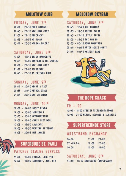 Dann seid ihr mit dem Booze Cruise in der Hafenstadt Hamburg genau richtig! Der Booze Cruise wird alles andere als ein konventionelles Open Air. Es stehen vielmehr kleine Club-Shows in angrenzenden Locations auf dem Programm. Besucher haben so die Möglichkeit, von einem Hotspot zum nächsten zu ziehen und sich zwischendurch mit Blick auf die Hafenkräne mit Kaltgetränken und kulinarischen Köstlichkeiten zu versorgen. So werden die Künstler auch einmal ganz unkonventionell in einer Fischbrötchenbude, einer Bierbrauerei oder auf einer umgebauten Hafenfähre ihr Set zum Besten gegeben. Das gute dabei: Die Venues können allesamt zu Fuß abgegangen werden!
