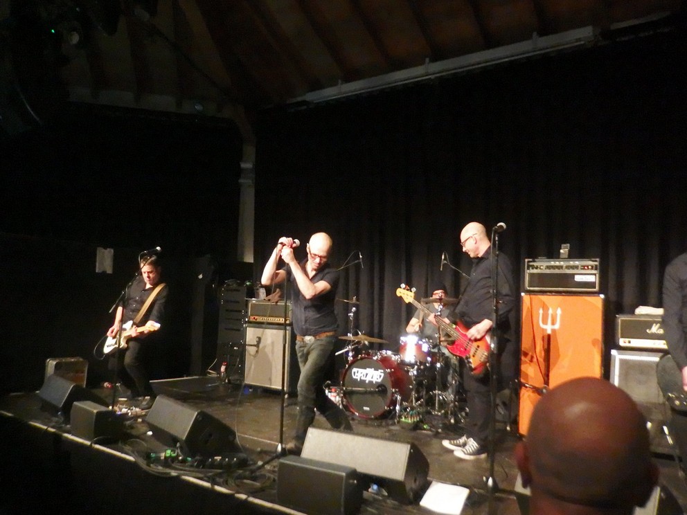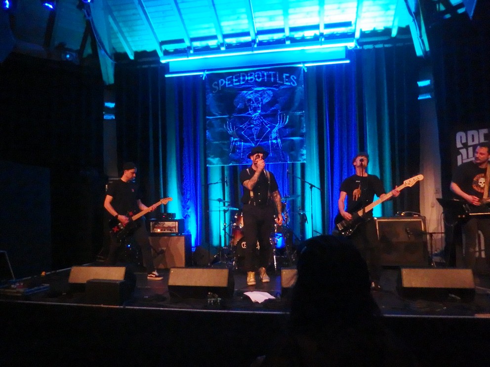 rechtzeitig zu den Speedbottles da zu sein. Aus Idar-Oberstein stammend spielt die Band dreckigen 60er/70er Jahre Rock’n’Roll und damit quasi Protopunk. Gut dazu passte die entweder an einen Harlekin oder an Clockwork Orange angelehnte Schminke des Sängers. Der Saal war entgegen meiner erwartung schon sehr gut gefüllt. Ein Beweis für das diesjährige hochkarätige Line-up. Niemand wollte was verpassen. Jedenfalls begeisterten die Speedbottles mich sehr. Meine Versuche, eine Platte von ihnen zu kaufen, scheiterten jedoch immer wieder das niemand am Merchstand war.