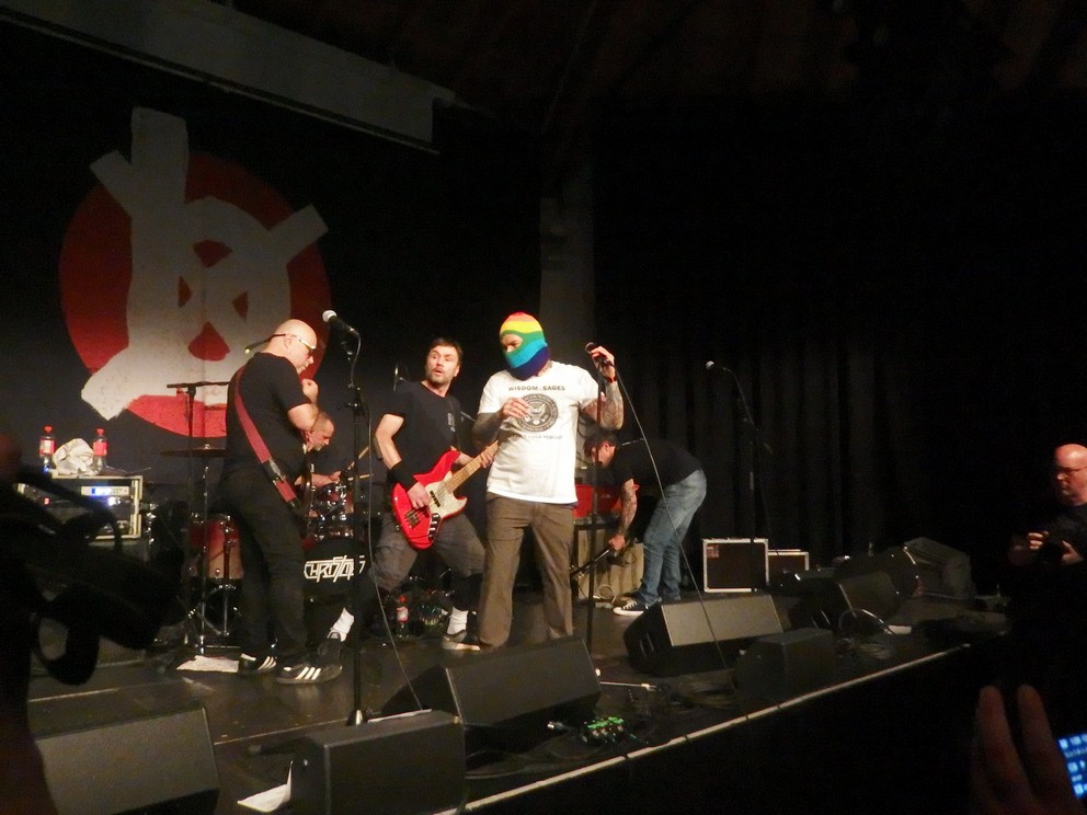 Über Bubonix hab ich bisher auch nur gutes gehört und das bestätigte sich auch an diesem Abend. Aus Limburg an der Lahn stammend besteht die Band mit Unterbrechungen seit 1994, fünf Alben bislang, das letzte auf Kidnap Music. Hardcore Punk/Post-Hardcore, ziemlich hektisch mit großer Fangemeinde. Sänger Thorsten Polomski trat zunächst in Regenbogen-Sturmmaske auf, der er sich beim zweiten Song entledigte. Was danach folgte war ein intensives Set, das zum Teil ins Publikum getragen wurde. Irgendwann waren alle Instrumente in der mittlerweile fast brechend vollen Reithalle verteilt. Man hatte schon Angst, dass sie gleich noch das Schlagzeug runter von der Bühne holen. Es ging sehr gut ab und auch das Publikum war sehr textsicher. Mit Sicherheit die Show des Abends. Und die besten Merchartikel gab es auch. Ich war kurz versucht, mir eine Bubonix-Zahnbüstee zu kaufen. Aber das schien mir dann doch zu… seltsam. Auch ein Schweizer Taschenmesser gabs…
