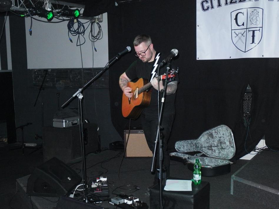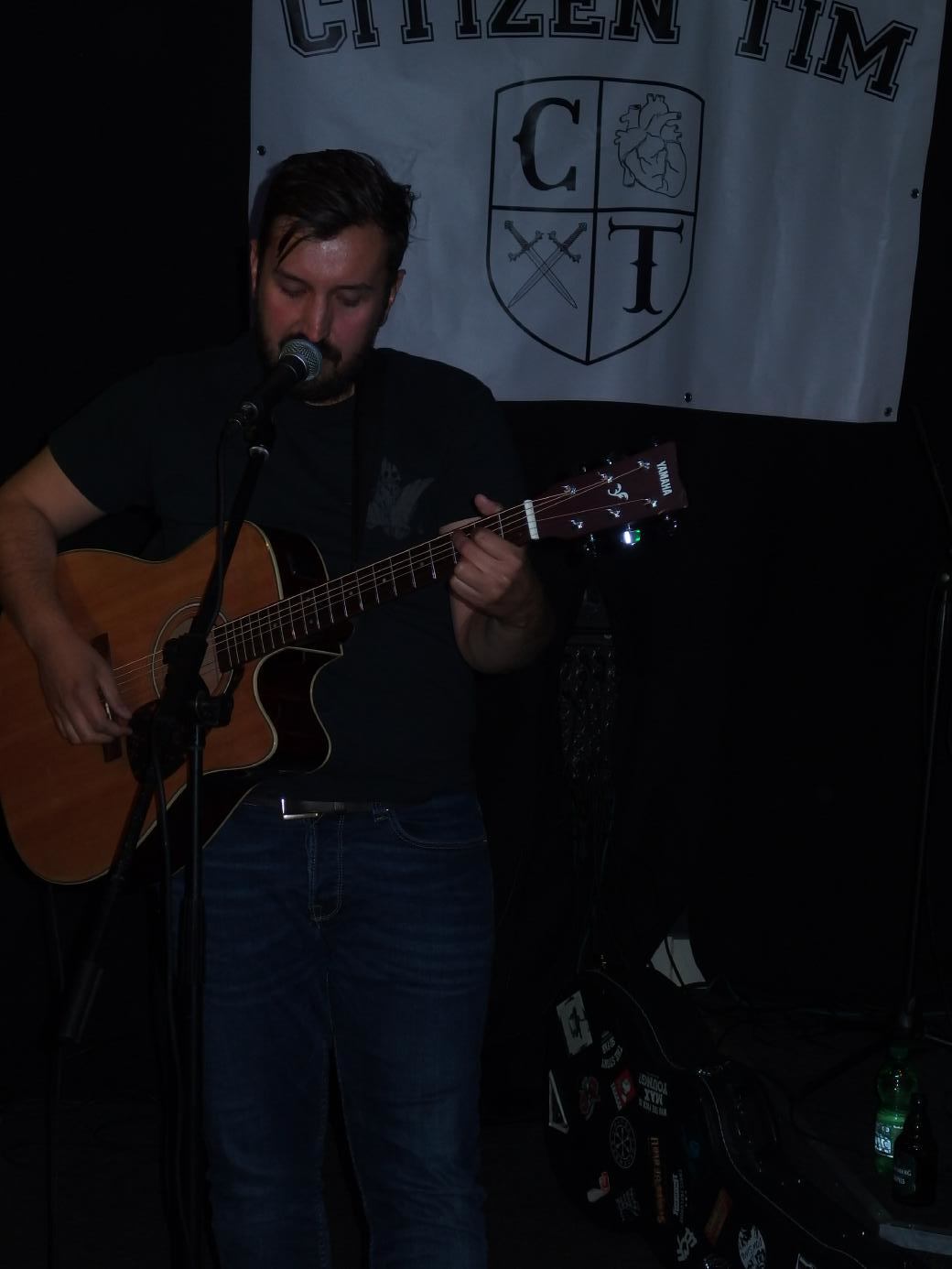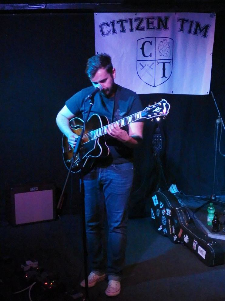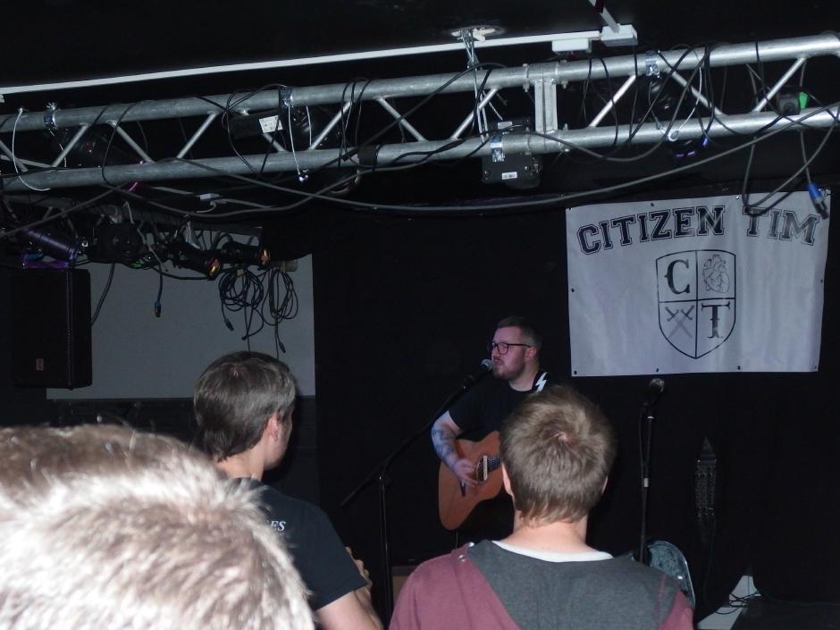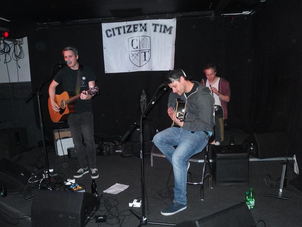 Citizen Tim ist mächtig stolz auf sein Album und das kann er auch sein (Review hier). Und so gestaltete sich die Releaseshow als das in der Hardcore-Szene oft kolportierte Network of Friends. Alle waren sie da, befreundete Liedermacher und Bands, die Presse (in diesem Falle wohl ich, weiß nicht wer sonst noch da war), Labelboss Tim von Midsummer Records, der auch schön von allen anwesenden Künstlern gegrüßt wurde. Also alle die, außer denen, die sich für das JUZ Illingen und Christmas entschieden haben. Ja, zwei Termine an einem Abend… Uff, war schwer dort eine Entscheidung zu fällen. Verpasst habe ich im Übrigen Olli Okay, der für den verletzen, aber anwesenden Peter von Trees eingesprungen ist.