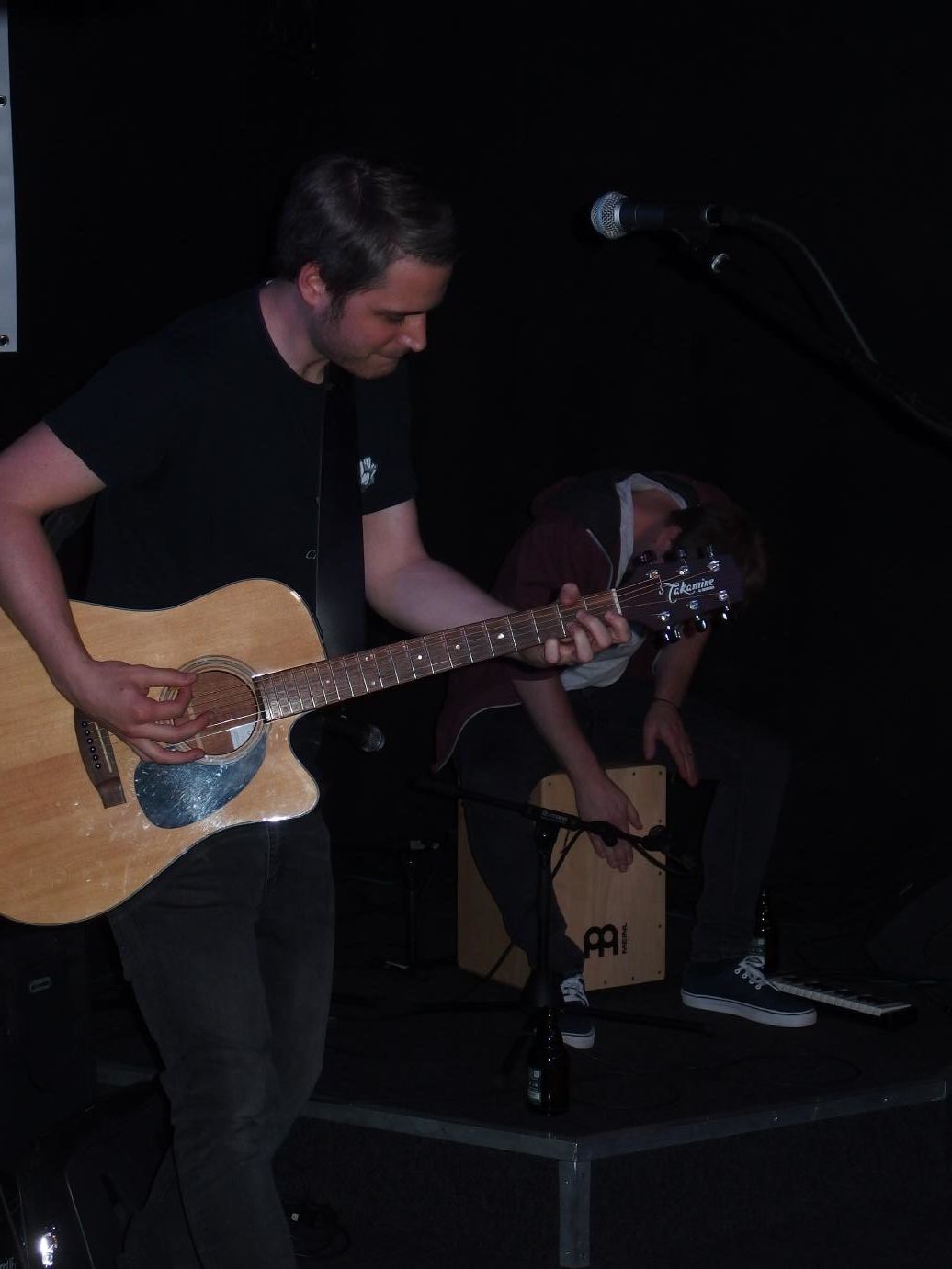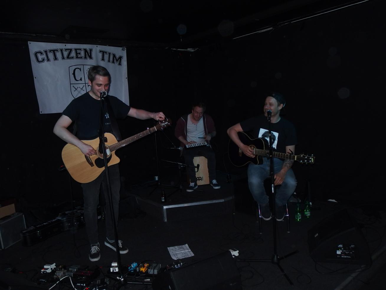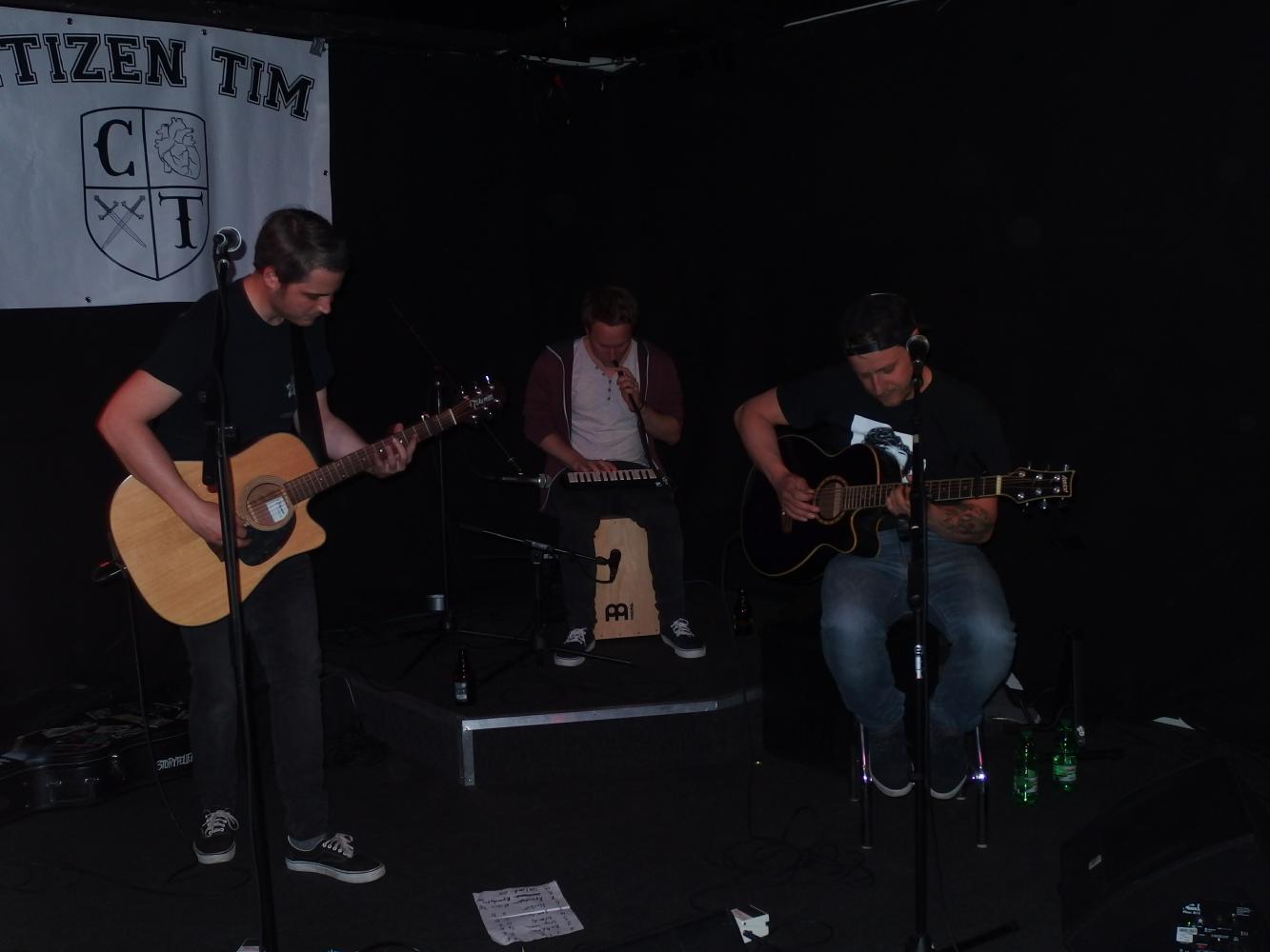 Für Tides war es eine Premiere, denn natürlich sagten sie spontan zu, als Citizen Tim sie um ihre Teilnahme bat. Doch dann stellten sie fest, dass sie akustisch spielen sollen. So richtig wohl war ihnen dabei nicht obwohl ihr Sänger ja auch früher als Friends and Liars aktiv war. Dieser betrat auch als erster die Bühne und gab ein paar Tides-Songs solo zum Besten. Danach füllte sich die Bühne, zunächst mit einer zweiten Gitarre dann mit Cajon und Melodica in Personalunion. Das führte unter anderem zu lustigen Sprüchen, wie zum Beispiel: „Sätze, die man selten von einer Punkband gehört hat: Wurde das Cajon schon abgenommen?“. Gesungen wurde im Übrigen auch Apocalypse vom guten Cowboy Poetry, einer meiner Lieblingstracks von ihm im Übrigen. Wie bei einem klassischen Tides-Gig gabs dann am Ende OKland mit acapella-Ende. Also mir hats ganz gut gefallen, schade, dass es vermutlich nur eine Einzelshow bleibt.
