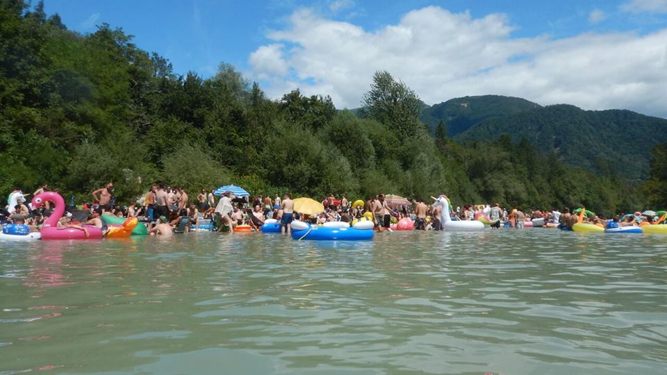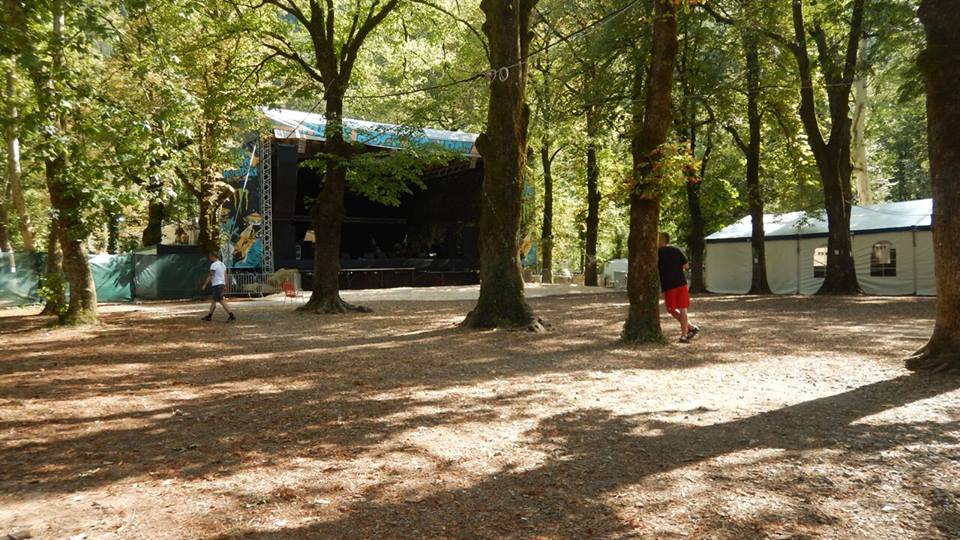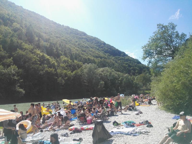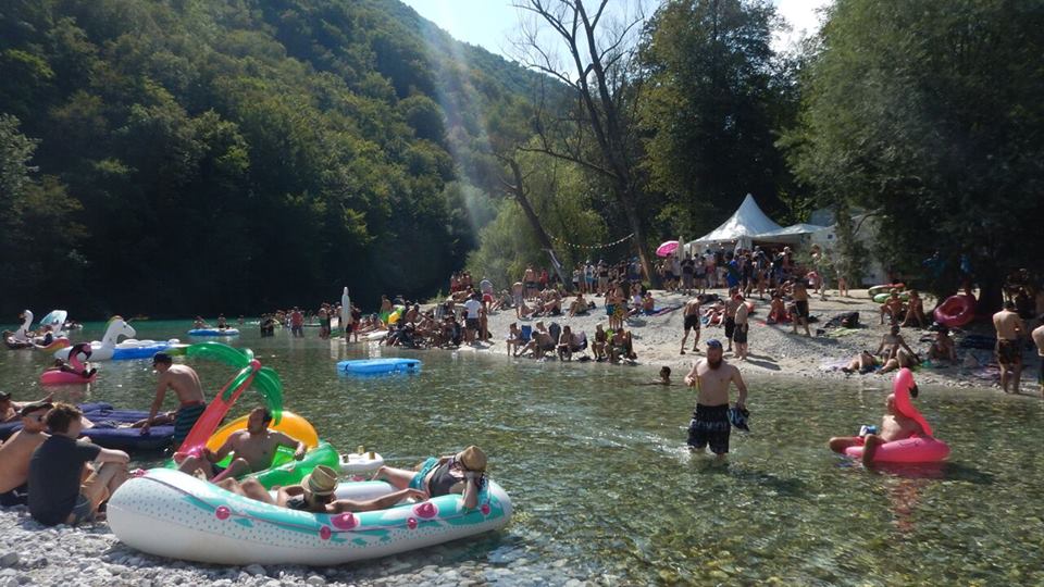 Zurück zur Location: gestärkt nach der langen Anreise, habe ich mich erstmal auf Entdeckungstour gemacht: Camping im Wald, jede Menge Dixi-Klos und eine Reihe weiterer Food- und Merchandisestände zieren den Platz bis zur Main Stage. Der erste Eindruck wirkt schattig und gemütlich und das finde ich direkt gut. Um 15 Uhr ist an der Main Stage noch nichts los, also ab zur Beach Stage – unten angekommen eröffnet sich den Festivalbesuchern ein Paradies am Strand des Flusses Soča. Eine große Bar, Foodstände und diverse Sitzmöglichkeiten teilen sich mit der kleinen Bühne den Platz am Strand. Hier sammeln sich also die Feierwütigen bei den ersten kühlen Getränken.