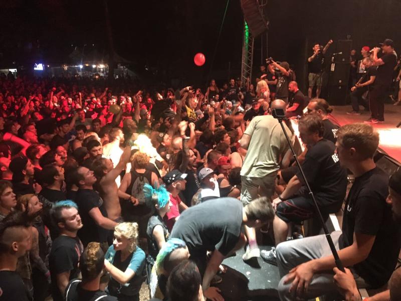 Simon: Bro Hym von Pennywise – der Überhit schlechthin auf jedem Festival; sei es aus den schepperten Boxen auf dem Zeltplatz oder eben live on stage. Wobei live doch noch einiges fetter ist! Viele sagen, dass sie den Song mittlerweile nicht mehr hören können, was ich, zumindest bisher, nicht nachvollziehen kann. Und auf dem Punk Rock Holiday hat die Bro Hym aber mal so richtig geknallt! Nicht von ungefähr sagte Pennywise Gitarrist Fletcher Dragge, dass er auf dem Punk Rock Holiday 1.7 die beste Bro Hym gewesen ist, die er jemals gespielt habe. Jeder der zuvor schon einmal auf eine Pennywise Show war, kann sich also vorstellen was am Dienstag in Tolmin abgegangen ist! Doch Pennywise ist weit mehr als nur ein Song: Das gesamte Set und die Stimmung war unglaublich. Beweismaterial gefällig?