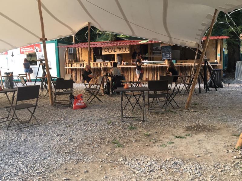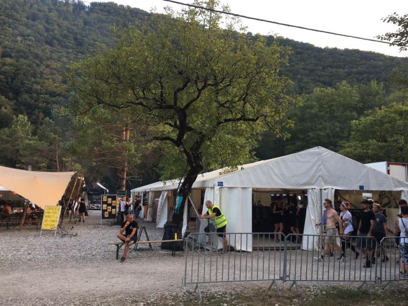 Jule: Für mich ging es am Montag um 8h los Richtung Slowenien. Bereits die Gegend hat mich total beeindruckt, gute zwei Stunden führt die Straße zwischen Bergen und am Fluss entlang bis in das kleine Städtchen Tolmin. Am Festivalgelände angekommen, war ich dann auch direkt überzeugt vom Punk Rock Holiday. Vom Parkplatz waren es gerade mal 10 Minuten Fußweg bis ich das sogenannte Slovenian Village erreicht hab – den Bereich, wo man erstmal stressfrei Nahrung und kalte Getränke zu sich nehmen kann. Die Ganze Woche über konnte man sich dort gemütlich an schattigen Bierbänken den Bauch voll schlagen ohne ewig anstehen oder wegen Überfüllung auf dem Boden sitzen zu müssen. Neben Burgern, Buritos und Bier gibt es auch verschiedene Caféspezialitäten, Smoothies und vegane Gerichte – verhungern muss also niemand. Die Preise waren hinsichtlich der großen Auswahl und der Option, sich auch beim nahegelegenen Supermarkt einzudecken, angemessen.