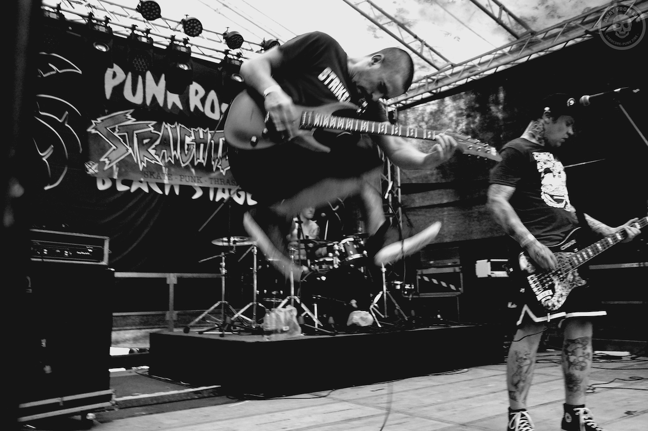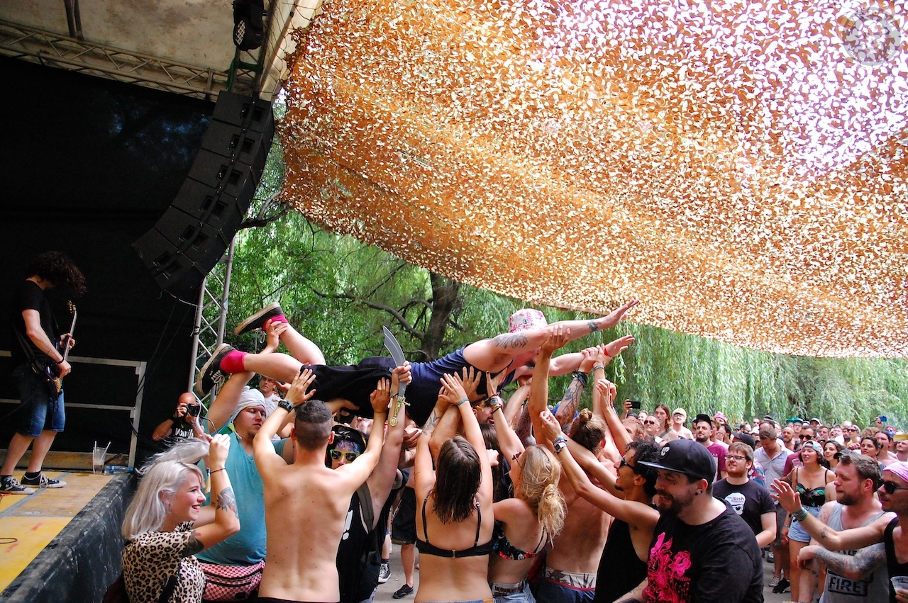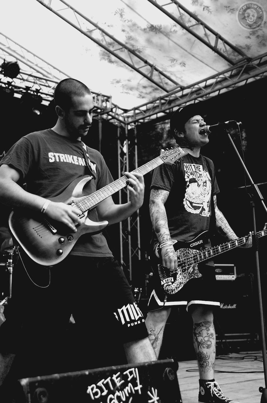 Ausgeschlafen und fit bin ich gegen Mittag zum Festivalgelände um meine Freunde völlig zerstört vorzufinden. Diese American Socks Party hatte es wohl echt insich. Zur Beachstage aufgebrochen sind wir tatsächlich erst nach 15:00 Uhr, gerade dann als alle anderen aufgrund des immer dunkler werdenden Himmels die Flucht Richtung Campingplatz ergriffen haben. Pah, das bisschen Regen dachten wir uns noch, bis es dann wie aus Eimern zu schütten begonnen hat. Ich hab mir einen Platz im Barzelt ergattert und konnte so recht entspannt die Show von CF 98 verfolgen. Die Band um Frontfrau Karolina hat echt gut abgeliefert, vor der Bühne hat sich kaum jemand vom Wolkenbruch abschrecken lassen – die Party ging weiter und kurz darauf kam auch die Sonne wieder. Schön! Für mich ging es dann mit Straightline weiter. Die Münchner durften bereits vor zwei Jahren auf der Beachstage ihr Können zum Besten geben und haben wohl einen bleibenden Eindruck hinterlassen. Mit ihrem doch recht metal-geprägten, derben SkatePunk-Sound heizten sie der Menge an der Soča ordentlich ein!