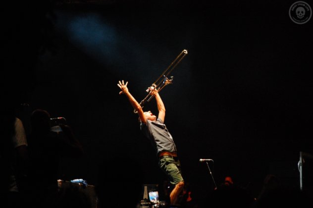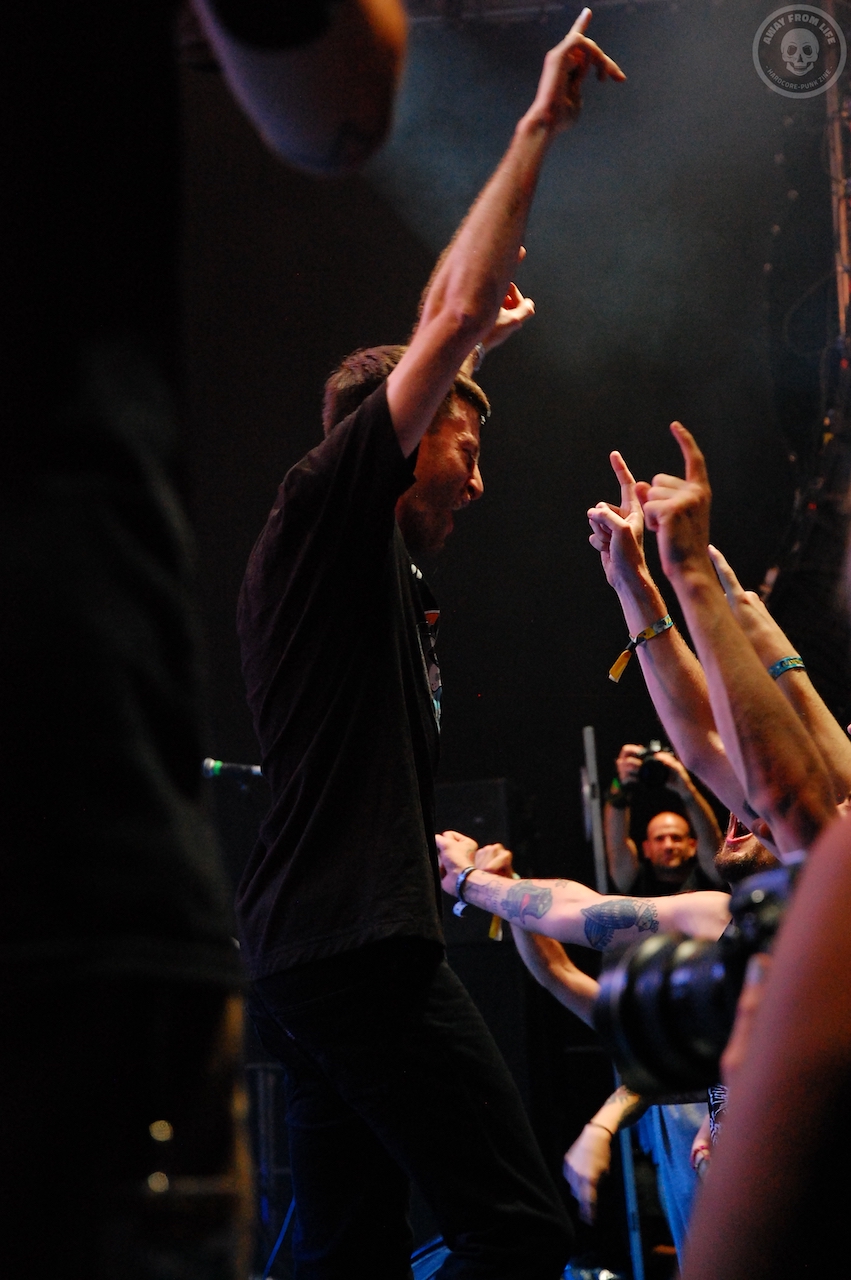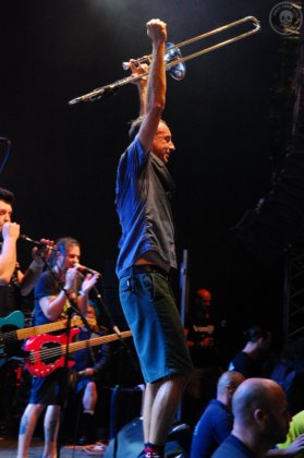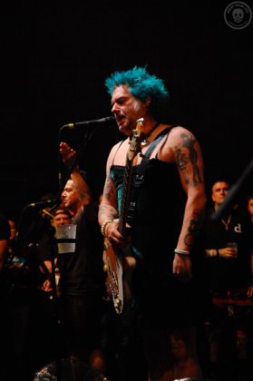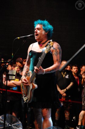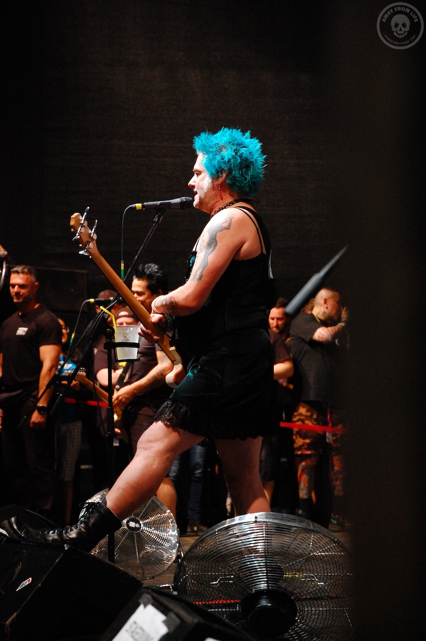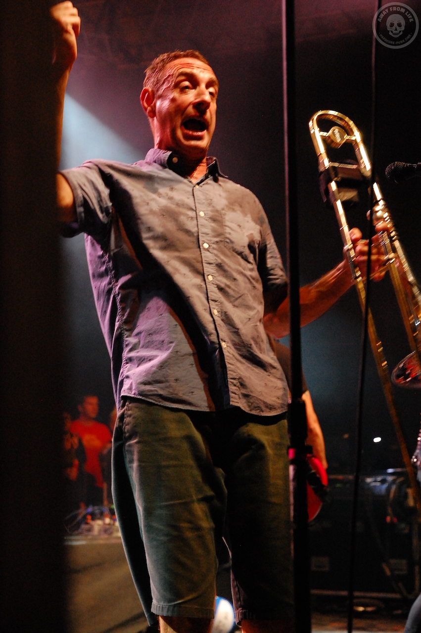 Fat Mike und El Hefe betreten die Bühne und tanzen erstmal ganz lässig zu Time Warp. Als dann alle ihre Instrumente zur Hand haben wird erstmal mit dem Publikum geplaudert. In super entspannter Atmosphäre nuckelt Fat Mike noch an seinem Longdrink, der einen festen Platz an seinem Mikroständer hat und regelmäßig durch ein frisches Getränk ausgetauscht wird. Selten habe ich so gelassene Musiker gesehen – grandios! Ohne Vorwarnung wird dann auch der erste Song performed. Ehrlich gesagt, labert der liebe Mike schon echt ganz schön viel aber das Publikum hat auch damit jede Menge Spaß. Irgendwann gibt’s dann einen Circle Pit um einen Circle Pit herum und irgendwo wird wieder ein Bengalfeuer gezündet. Ganz plötzlich war die Show dann auch wieder vorbei. Nicht, dass das Set vorzeitig abgebrochen worden wäre, das nicht – aber irgendwie habe ich das Ende garnicht kommen sehen, so schnell ging die Zeit rum. Im Anschluss kam Fat Mike um ein Problem zwischen Fan und Security zu lösen. Keine Ahnung was da vorgefallen ist, aber Streitschlichter Mike konnte das Problem mit Daumenwrestling aus der Welt schaffen – schön! So konnten alle zufrieden und glücklich ins Bettchen gehen.