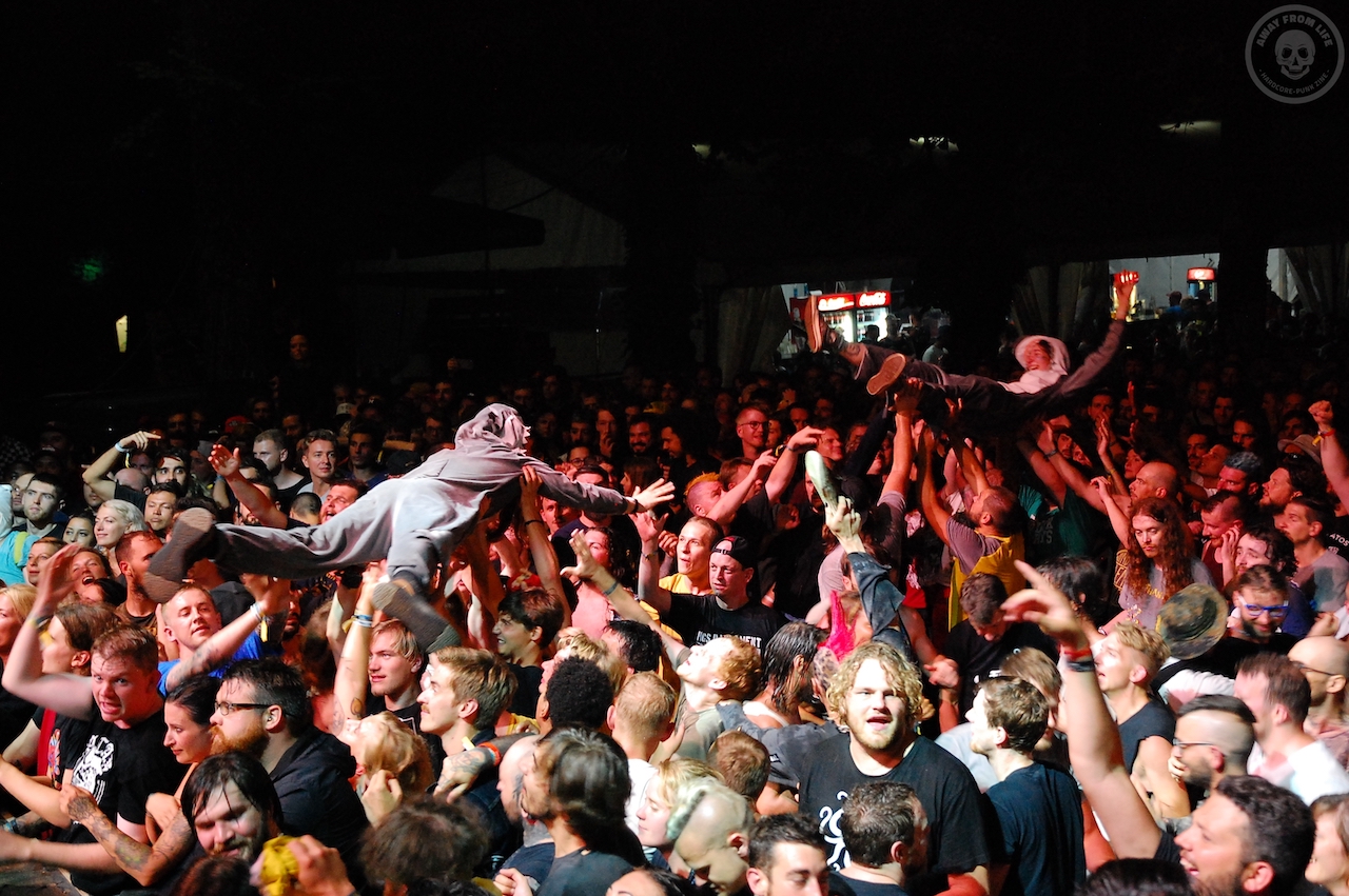 Danach folgten Sick Of It All – die Stimmung die Pennywise hinterlassen hatten verlor kaum an Antrieb. Da ich SOIA privat eher weniger verfolge, kann ich kaum was zur Songauswahl sagen aber die Menge hatte definitiv mächtig Spaß. Da folgte ein Circle Pit nach dem anderen, wofür Sänger Lou auch mal selbst in die Mitte sprang. Auch hier wurde gegen Ende noch die Bühne gestürmt, natürlich in wesentlich geringerem Ausmaß als bei Pennywise. Ich hab mich in der Zwischenzeit endlich ausgiebig mit meinem neuen Equipment auseinandergesetzt und mich samt Kamera auf die Bühne getraut um von SOIA und anschließend Less Than Jake Fotos zu knipsen… Und tatsächlich muss ich an dieser Stelle erwähnen, wie unglaublich fantastisch die Leute vor, auf und hinter der Bühne auf dem PRH sind. Mit Kamera in der Hand wird man direkt in Schutz genommen, vor Stagedivern geschützt und der beste Platz zum Fotos schießen wird von dem ein oder anderen Kollegen auch mal freigemacht. Da macht das „Arbeiten“ auch direkt Spaß!