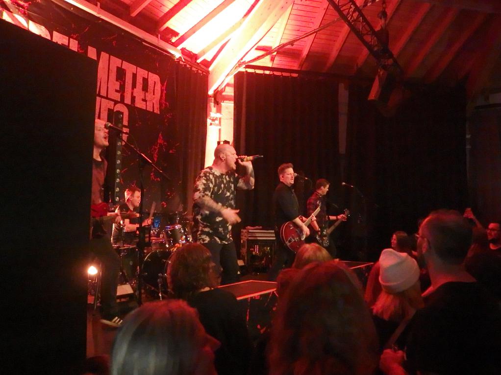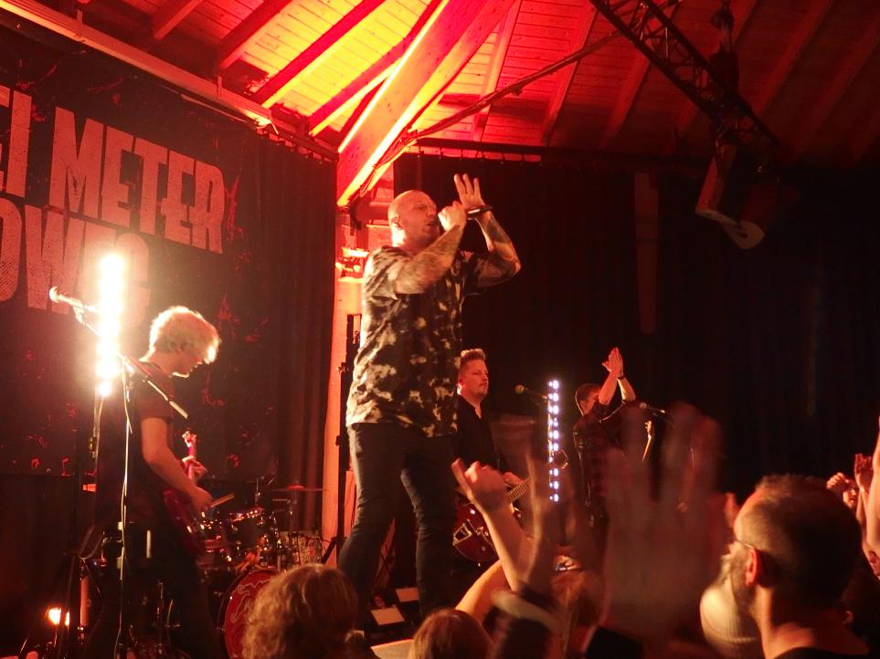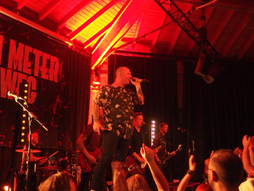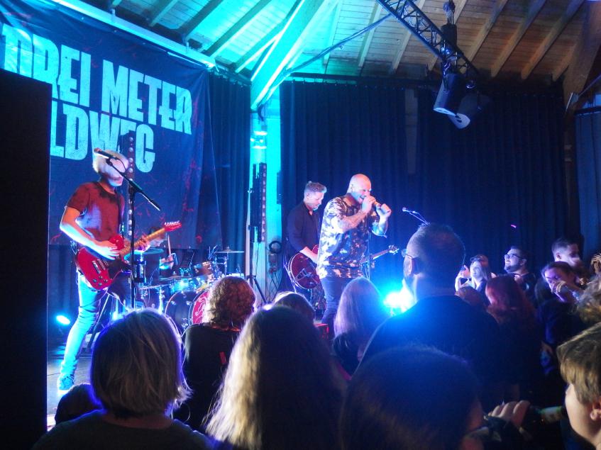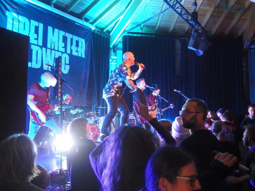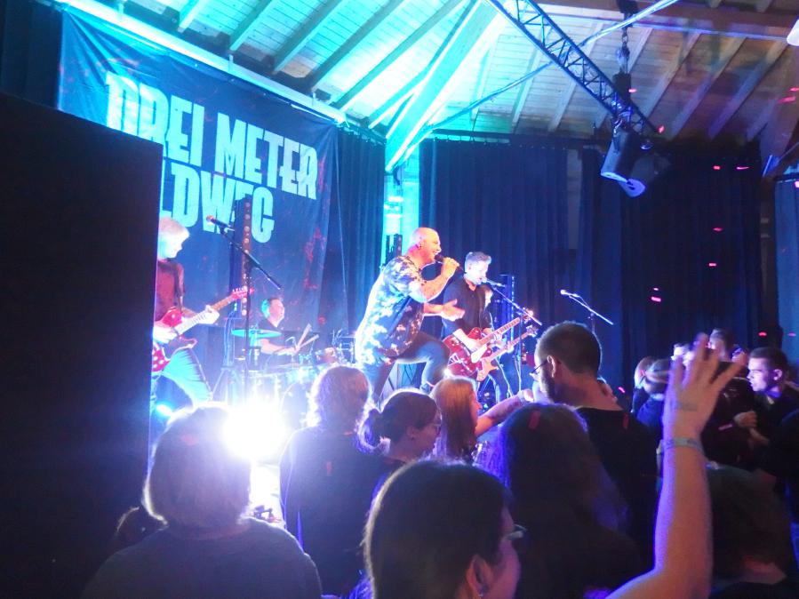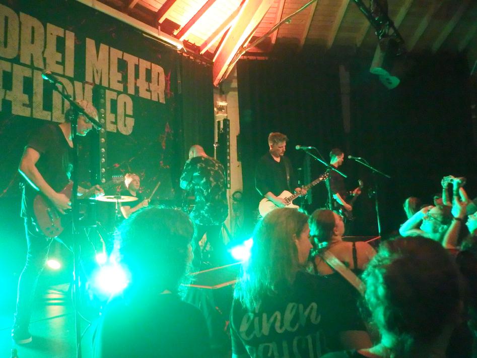 Man kann wohl sagen, der Club brannte an diesem tag lichterloh und auch Drei Meter Feldweg ließen sich nicht lumpen. So kam auch eine Konfetti-Kanone zum Einsatz. Die Meute war sehr textsicher und machte auch bei den Mitmachspielchen (die ich ja immer etwas albern finde) gut mit. Auch etwas Pogo gabs. Da kamen die Hits auch recht gut an. Dazu auch ein paar Ansagen gegen rechts und natürlich ihre Anti-Nazi-Hymne Eine Lovestory. Guter tanzbarer Punk mit Anleihen an FSF und DÄ. Ich glaub an die 20 Songs und 90 min. Besonders bei den Drurak-Hits Und sie tanzt, Gib niemals auf und Briefe an dich sowie dem Saufhit Sommer, Sonne, Bier gleichzeitig der Rausschmeißer des Abends war die Stimmung enthusiastisch und durchaus wohl auch alkoholgetränkt, wie Stichproben ergaben. Kurz nach 23 Uhr war dann Schluss und trotz des sommerlichen Partysongs am Ende sah man sich dann mit einer regnerischen und kalten Nacht konfrontiert.