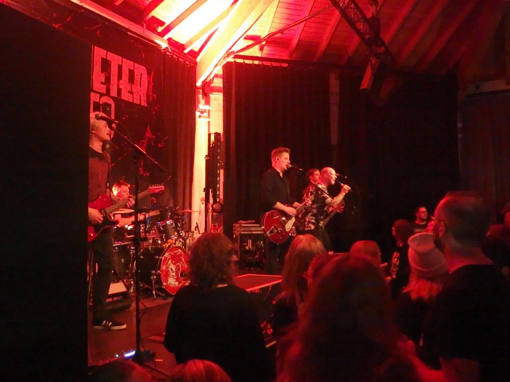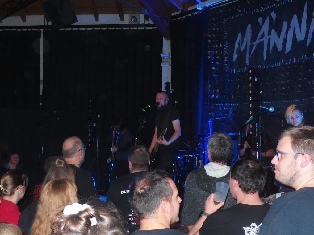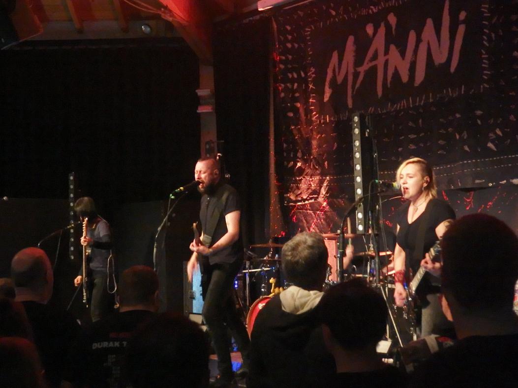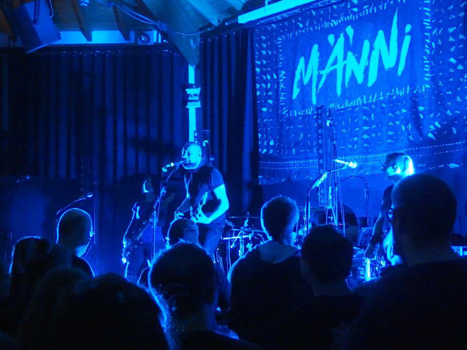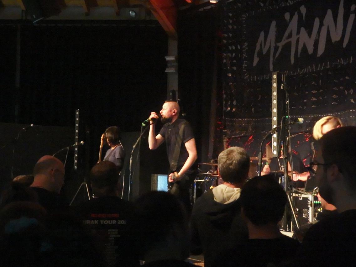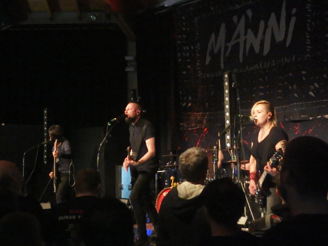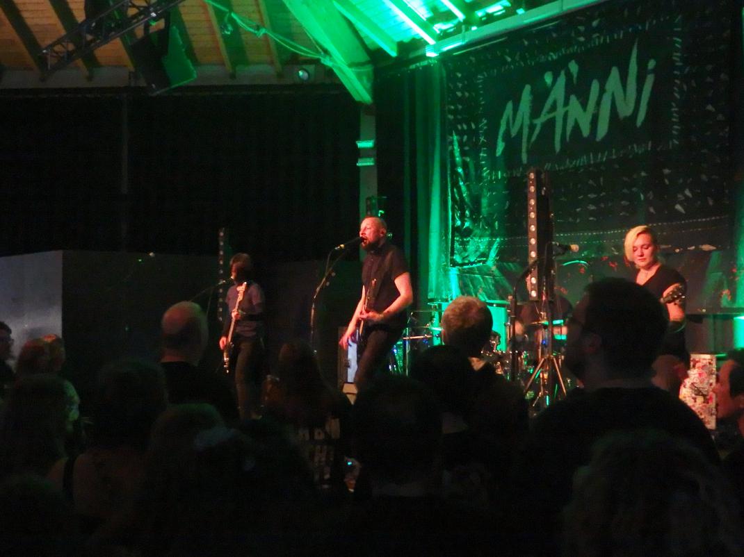 Erstmal war es an Männi den Abend zu eröffnen. Bei Männi ist man ja nie ganz sicher, obs ne Band ist oder nicht. Ich schreib der Einfachheit halber Männi, wenn ich die Band meine und Samuel wenn ich den Sänger meine. Männi ist jedenfalls, seit ich sie das letzte Mal gesehen habe, neu aufgestellt mit zwei Frauen an Gitarre und Bass. Ich konnte leider die Namen nicht rausfinden und ob das nun ein beständiges Line-Up wird. Jedenfalls war Samuel ganz schön gut drauf und sichtlich angetan, dass der Laden ausverkauft war. Dass Männi für das Publikum keine unbekannte Band war, erkannte man daran, dass durchaus mitgesungen wurde. Der einzige etwas ernstere Anti-Nazi-Song Jetzt erst recht kam am Anfang, danach ging es eher bierernst zu. Und das gar nicht mal schlecht. Die Band trat sehr energisch und selbstbewusst auf und konnte so auch durchaus einige neue Fans gewinnen. Eine großartige Eröffnung!