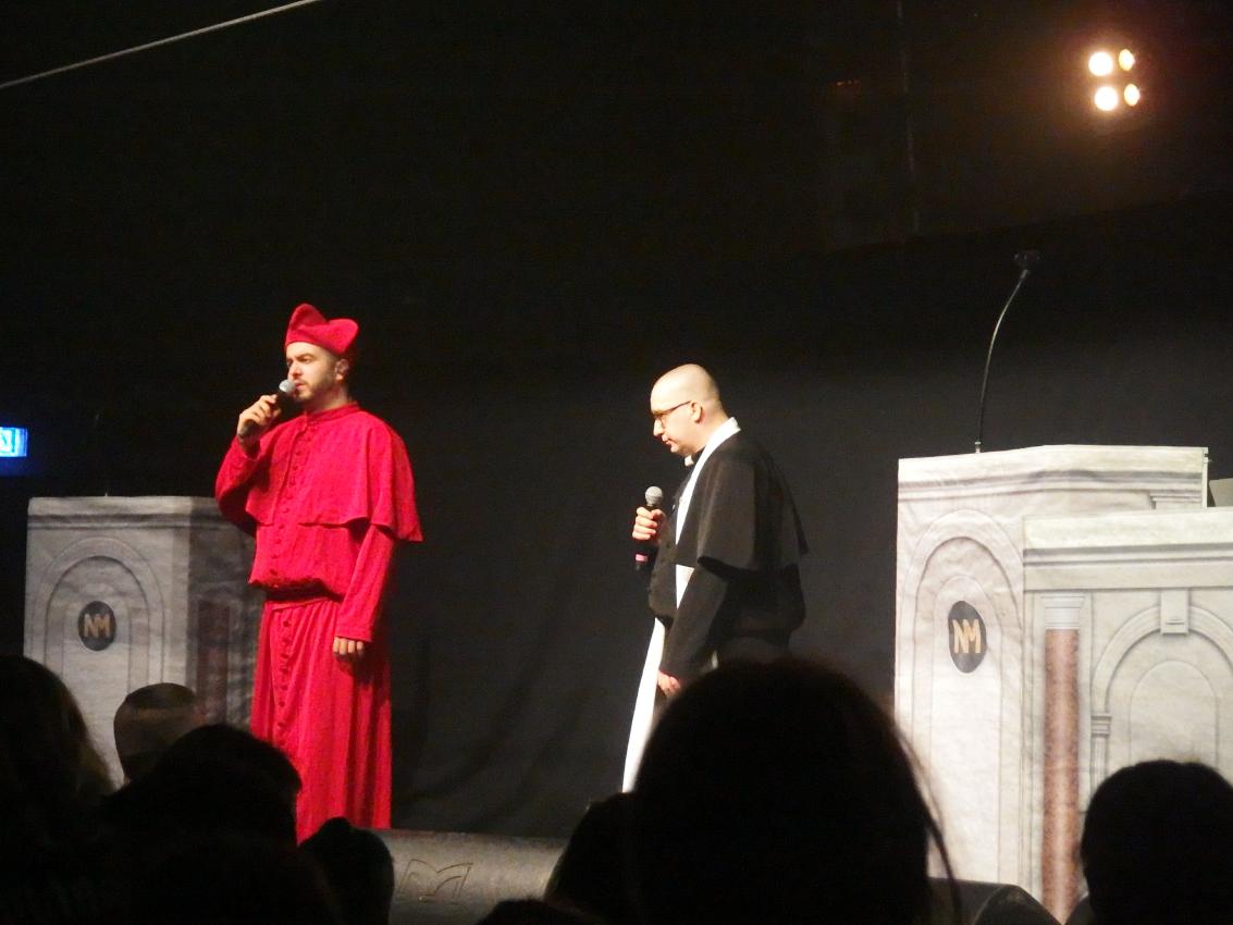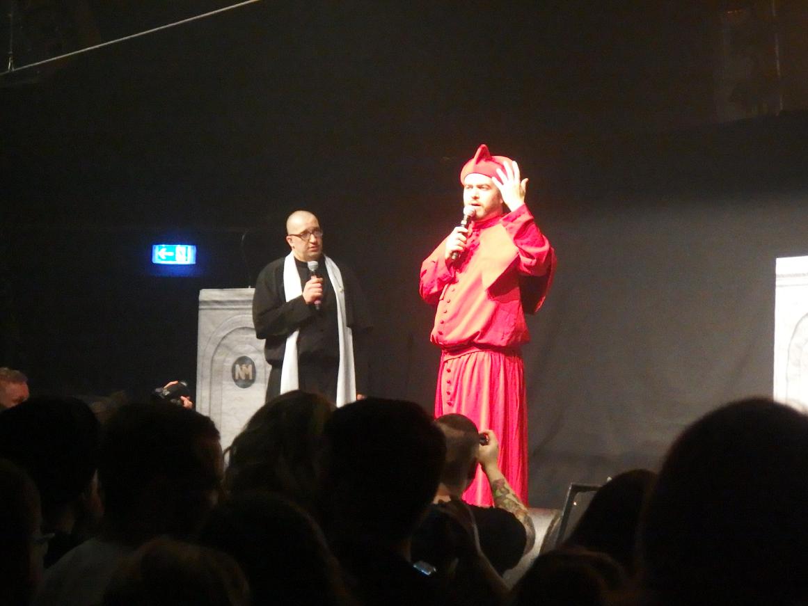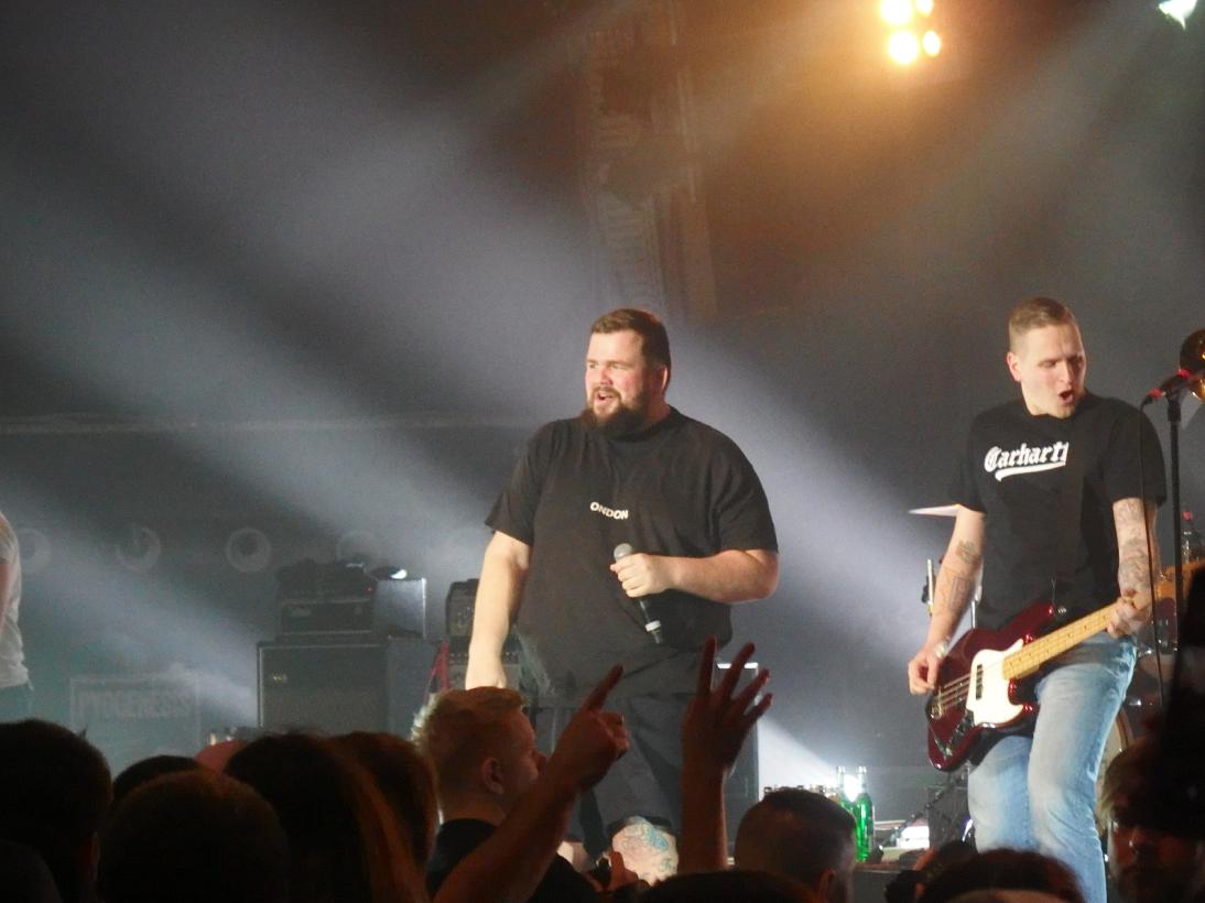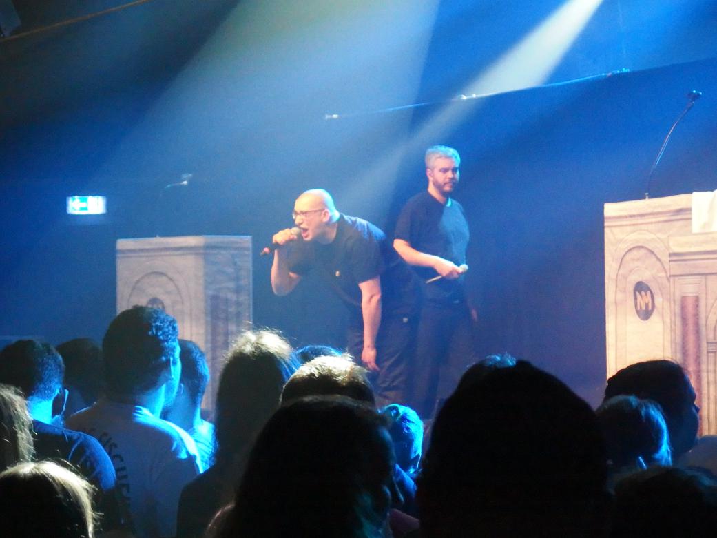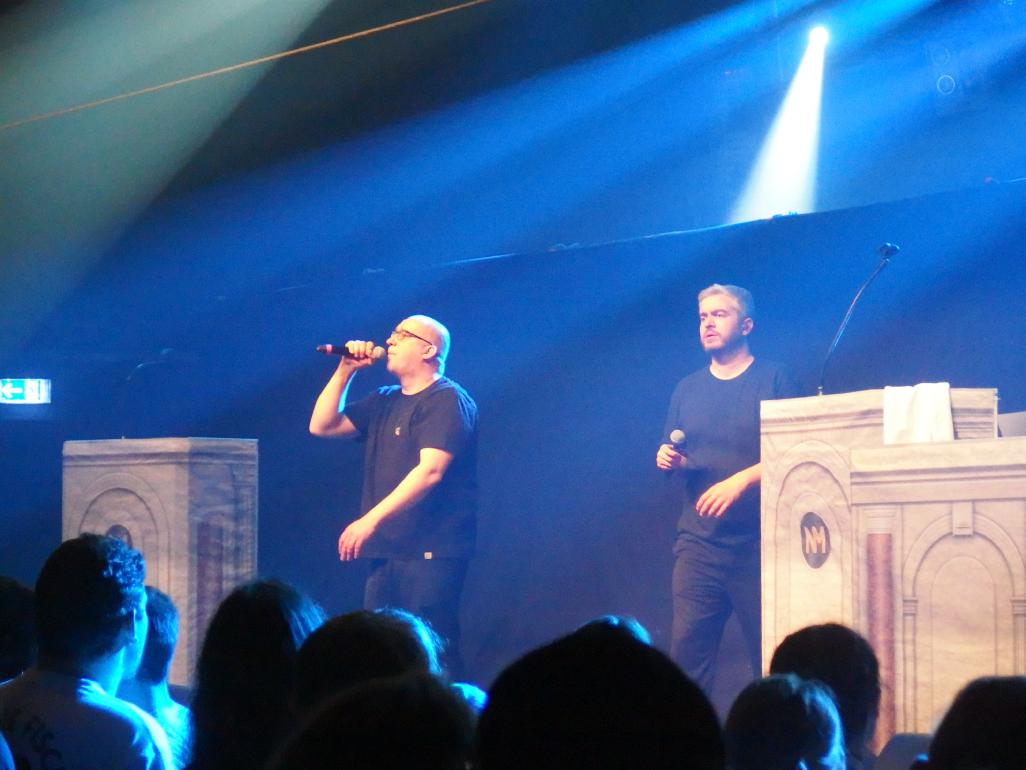 Wo wir gerade bei Blasphemie sind: dennoch kam ich pünktlich zum ersten Song von Audio88 & Yassin, die gemäß ihrer neuesten EP Halleluja auch in Priester-Montur auftraten. Die Vorturner machten sie auch ausgzeichnet, so animierten sie die Meute zum Pogo, zum Hüpfen und lieferten auch die erste Dusche. Der Fokus lag ganz klar auf ihren politischen Stücken neueren Datums. Leider kein Leg ein Feuer und die Antwort Lösch ein Feuer. Auch Was würde Manny Marc tun wurde gespielt, das eigentlich von K.I.Z. stammt. Am meisten Applaus gabs sicherlich für Würd’s Gerechtigkeit geben, wär‘ die Petry nicht am Leben aus Direkter Vergleich, ein Track von Audio88s Soloalbum Sternzeichen Hass. Den Abschluss bildete standesgemäß Schellen („Aber ich bin doch kein Nazi, nur weil ich sage, dass…“ Doch genau das bist du und außerdem ein Spast! Die Begründung dafür liegt schon alleine in dem Satz Den man grundsätzlich nur beginnt, wenn man was Dummes sagt“). Ich hätte den beiden stundenlang zuhören können, doch leider war das Set viel zu kurz…