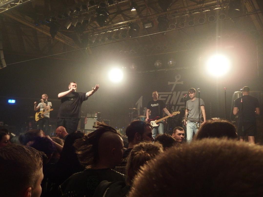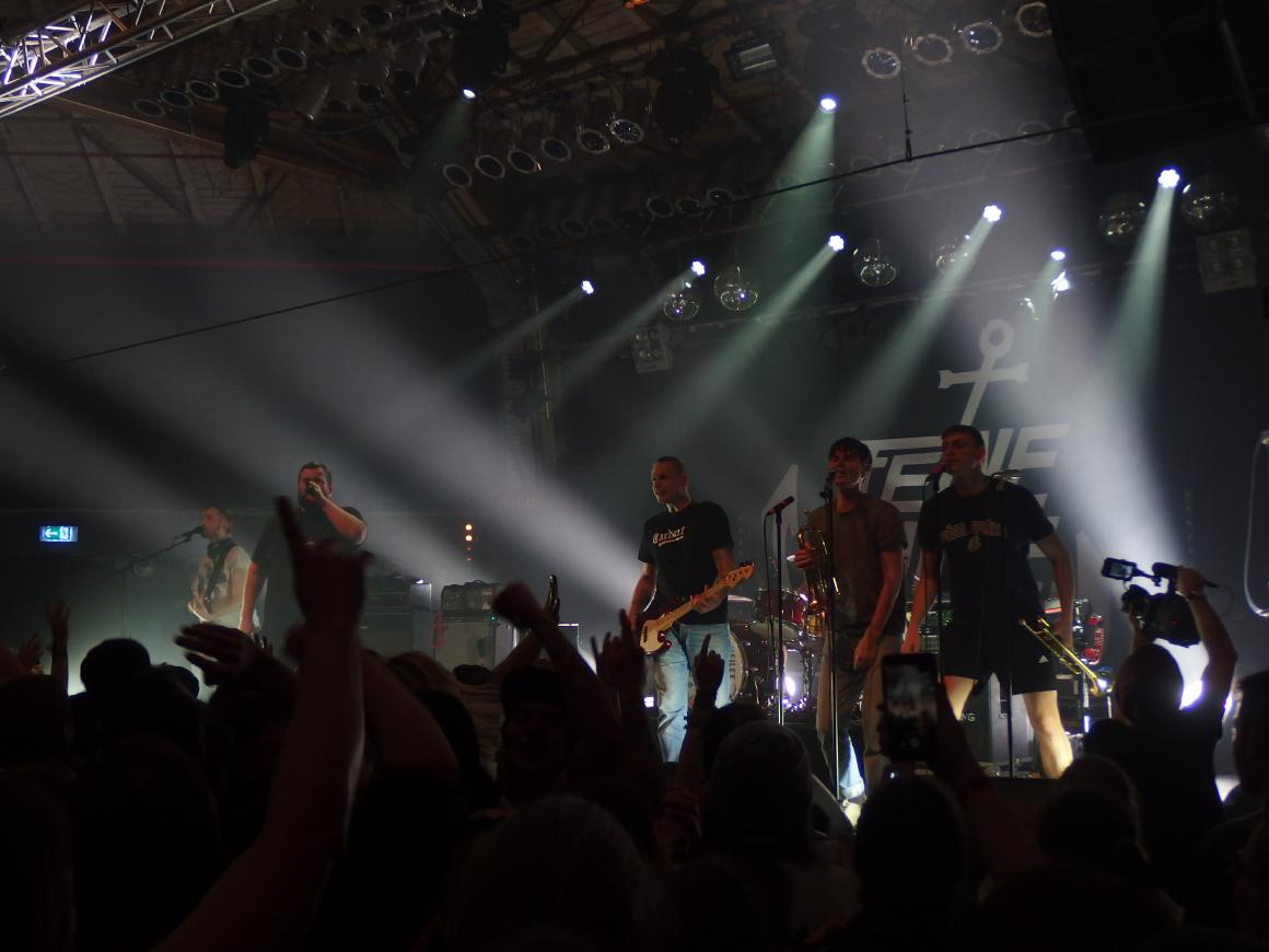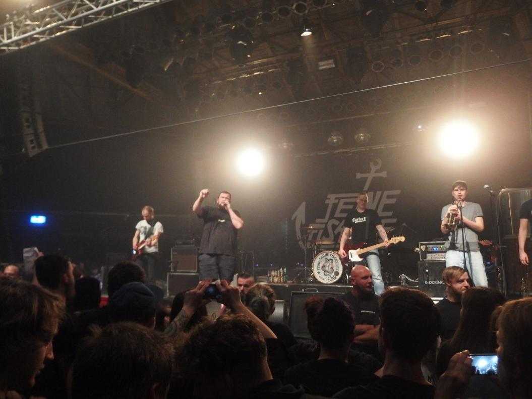 Danach folgte eine viel zu lange Umbaupause, die wenigstens durch Songs von Dead Kennedys bis Knochenfabrik musikalisch recht gut ausgenutzt wurde. Was danach folgte kann man mit Fug und Recht nur als den totalen Abriss bezeichnen. Gleich ging es los mit den beiden Single-Hits Alles auf Rausch und Zurück in unserer Stadt. Danach folgte Hit an Hit und Singalong an Singalong. Das Publikum ging auch gut ab. Pogo, Circle Pit und auch meine erste Wall of Death waren dran. Nur dieses vor die Band in die Knie gehen, das sollen die Deppen bei den Onkelz machen… das ist nicht Punkrock. Jaja, das Publikum, bei einer bedächtigen Ansage von Monchi, als er von einer Hilfsaktion berichtete, brachte er die Alerta Antifascista-Rufer zur Ruhe („Ich glaube, das ist keine Ansage zum Reinrufen“). Und das machte mir die Band super sympathisch. Die wollen was erzählen und sie bestehen auch darauf, dies tun zu dürfen. Auch schön: ein Junge, der Geburtstag hatte wurde auf die Bühne gebeten und es war völlig ok, dass er darauf verzichtete. Aber das Publikum war schon in Ordnung. bei einem Hallenfassungsvermögen von 1000 Personen sind natürlich auch Idioten drunter, machen wir uns nix vor. Aber die bemerkte man nicht. Auch vom Alter her war alles dabei. Man fühlt sich schon bei so jungen Bands wie ein alter Sack, aber hier wars angenehm gemischt…