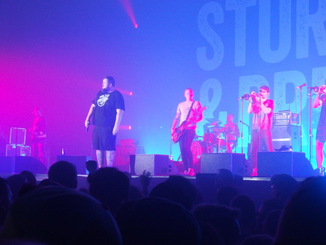 Vorband des Abends waren die Stage Bottles aus Frankfurt. Ob die gut oder schlecht waren, kann ich leider nicht sagen. Denn als sie anfingen zu spielen war ich mitten in einer gefühlten halben Kilometer langen Schlange zum Eingangsbereich, wo jeder noch einmal gründlich durchgecheckt wurde. Die Pfandsammlerin hat sicherlich ein halbes Vermögen gemacht. Als ich reinkam machte die Band auch schon „Wir spielen jetzt noch ein allerletztes Lied“ und schon gings los mit Solidarity von Angelic Upstarts, quasi der Klassiker des Arbeitsklasse-Streetpunks, textlich etwas bearbeitet, um auf die Refugee-Situation hinzuweisen. Danach wurde noch der Geburtstag eines Bandmitglieds verkündet. Etwas schade, dass die Band kaum Licht bekam. Aber man muss es Feine Sahne Fischfilet schon anrechnen, eine Band, die seit fast 30 Jahren mehr oder weniger unbekannt in der Punkszene herumschwirrt, 3.500 Leuten vorzustellen. Monchi beäugte den Gig auch aus nächster Nähe. Tolle Sache das!