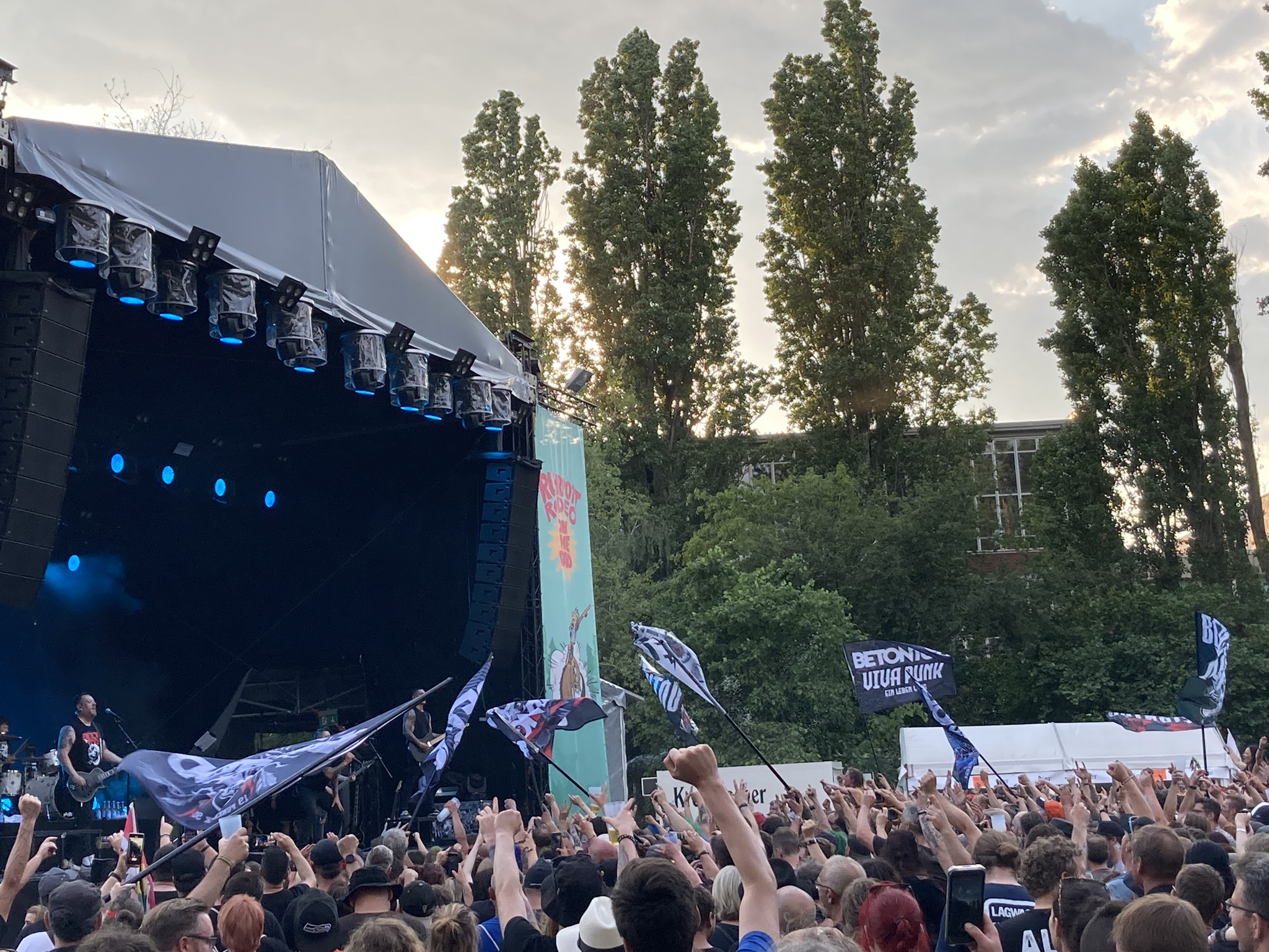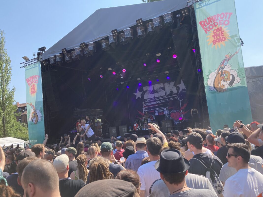 Der Wermutstropfen wurden mit dem Auftritt von ZSK allerdings weiter verwässert, denn der Klang wurde besser und meine anfänglichen Sorgen waren vergessen. ZSK fegten dann auch in der für sie typischen Art und Weise los. Energiegeladen wie Duracell-Hasen legten sie los und untermalten dieses mit einem feinen Potpourri ihres Repertoires. Von Herz für die Sache über Keine Angst und Die Kids sind okay bis hin zu HassLiebe war eigentlich aus jeder Zeit ihres Schaffens etwas dabei. Für mich persönlich hätten es noch mehr Lieder aus ihrer Anfangszeit sein können. So hätte ich mich tierisch über Riot Radio gefreut, aber eine Vielzahl der Besucherinnen und Besucher feierten die Setlist ab und so schaute ich links und rechts von mir in viele zufriedene Gesichter. Neben dem musikalischen muss ich auch nochmal die Animationskünste von Joshi hervorheben. Mit diversen Einlagen wie z.B. dem Twister-Circle-Pit und verschiedenen publikumsnahen Aktionen könnte er wohl auch den verrenteten Freundeskreis der Steuerberater zum abgehen animieren.