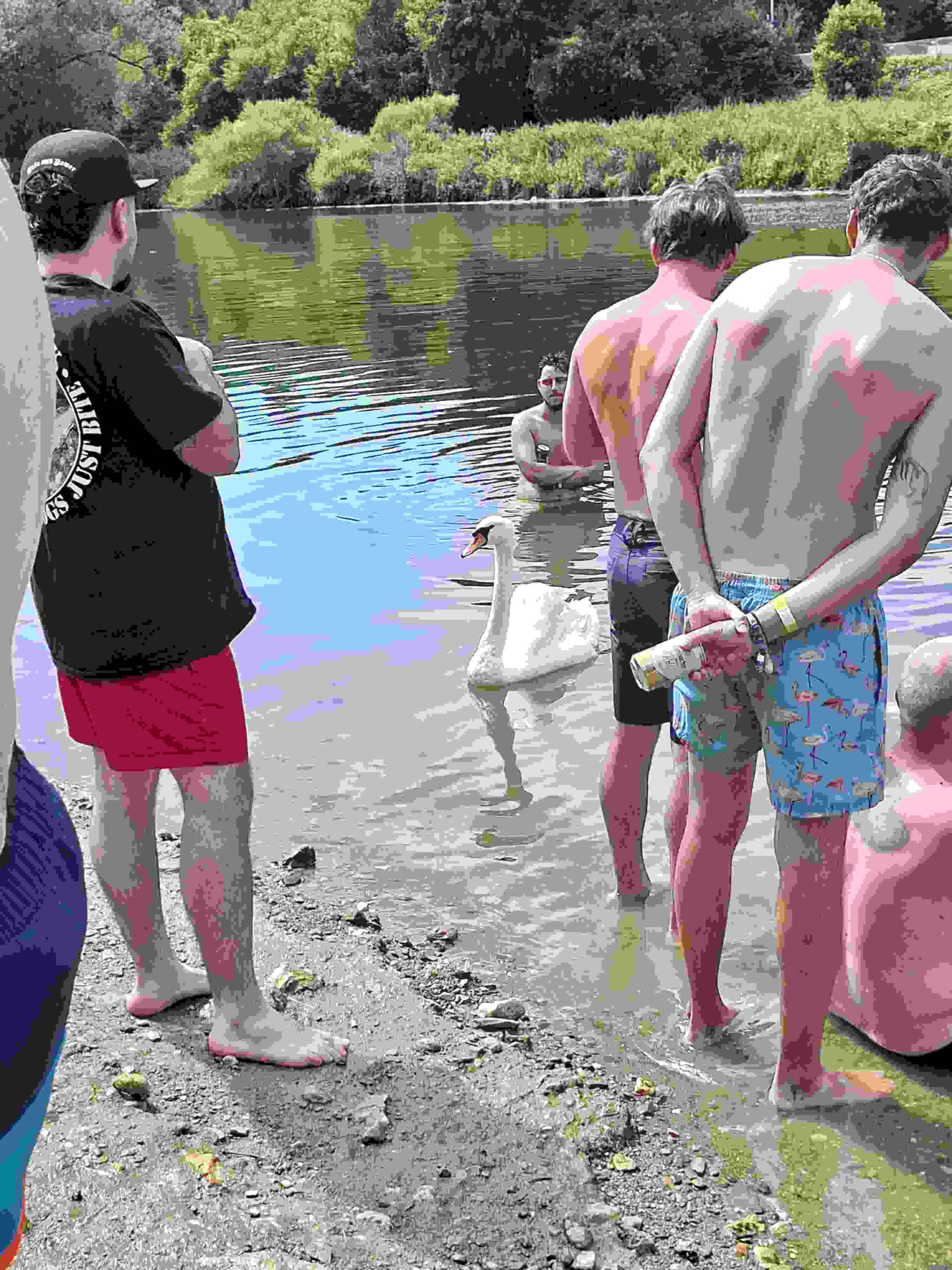 Als Maik und seine Crew zurückkamen, tranken wir noch ein paar Bier und mussten dann leider eine Festivalbesucherin vertreiben, die sich zu uns in den Pavillon gesetzt hatte. Über diese Band wird unter unserem Pavillon nicht geredet und sie wird schon gar nicht abgefeiert, meinte Maik, bevor sich unzählige Stimmen einschalteten. Bevor es komplett eskalierte, entschied die Frau sich, sich vom Acker zu machen, und wir entschieden uns dazu, an die Lahn zu gehen.