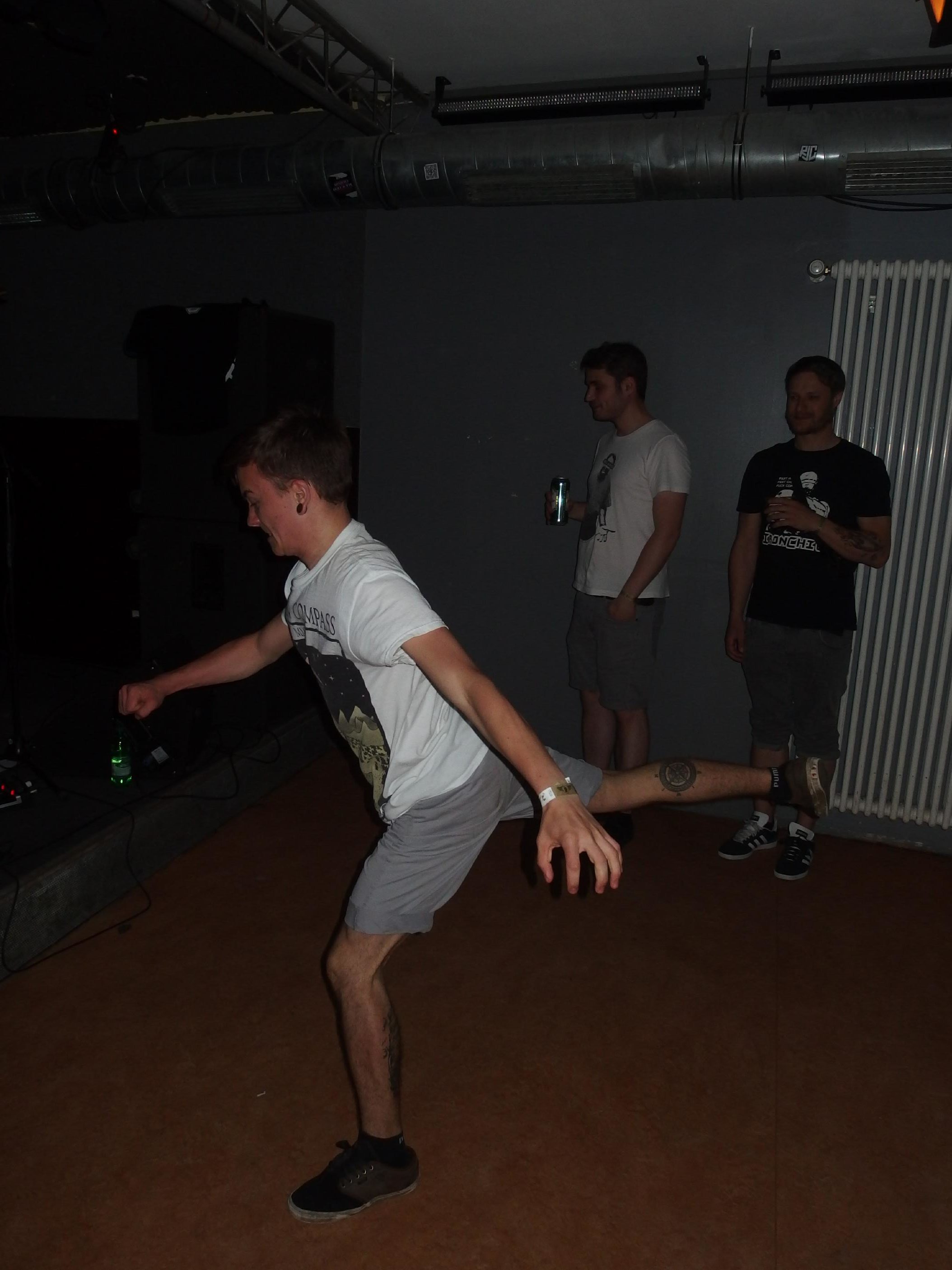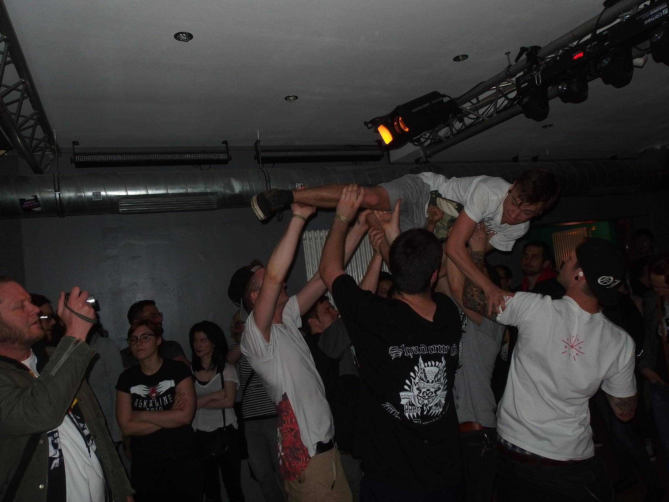 Save Your Last Breath aus der Schweiz schlugen in dieselbe Kerbe und man fragte sich schon, wie der Veranstalter auf die Idee kam, eine Blackened-Metalcore-Band (wtf?) würde in dieses Line-up passen. Nach zwei Songs mit gefühlten 201 Breaks pro Song unterhielt ich mich lieber mit Freunden vor der Tür. Dort waren auch deutlich mehr Leute als drinnen. Ich meine, die Band kann ja nix dafür, aber hier wollte eben keiner gegen Wände hauen und seine neuesten Kicks vorführen. Das war einfach nicht die richtige Musik für diesen Abend. Das fand keiner geil, also keiner außer den Jungs der vorherigen Band, was mir ehrlich gesagt im Laufe des Abends mehrfach sauer aufstieß. Nein, das hat mir sogar ein bisschen die Freude am Konzert genommen. Ich erwarte ja auch nicht, das jeder stramm stillsteht, aber diese Kicks und dieser absurd-dämliche Tanzstil. Das war einfach doof, auch später bei Tides und der Hauptband. Wenn man dazu noch den ganzen Abend mit einer Bierbong herumläuft, frage ich mich schon, ob das Hardcore-Niveau mittlerweile so tief ist. Aber was hilfts… Ich zitiere dazu einfach mal die superben Good Clean Fun und versuche das Thema dann aus dem Review zu verbannen.