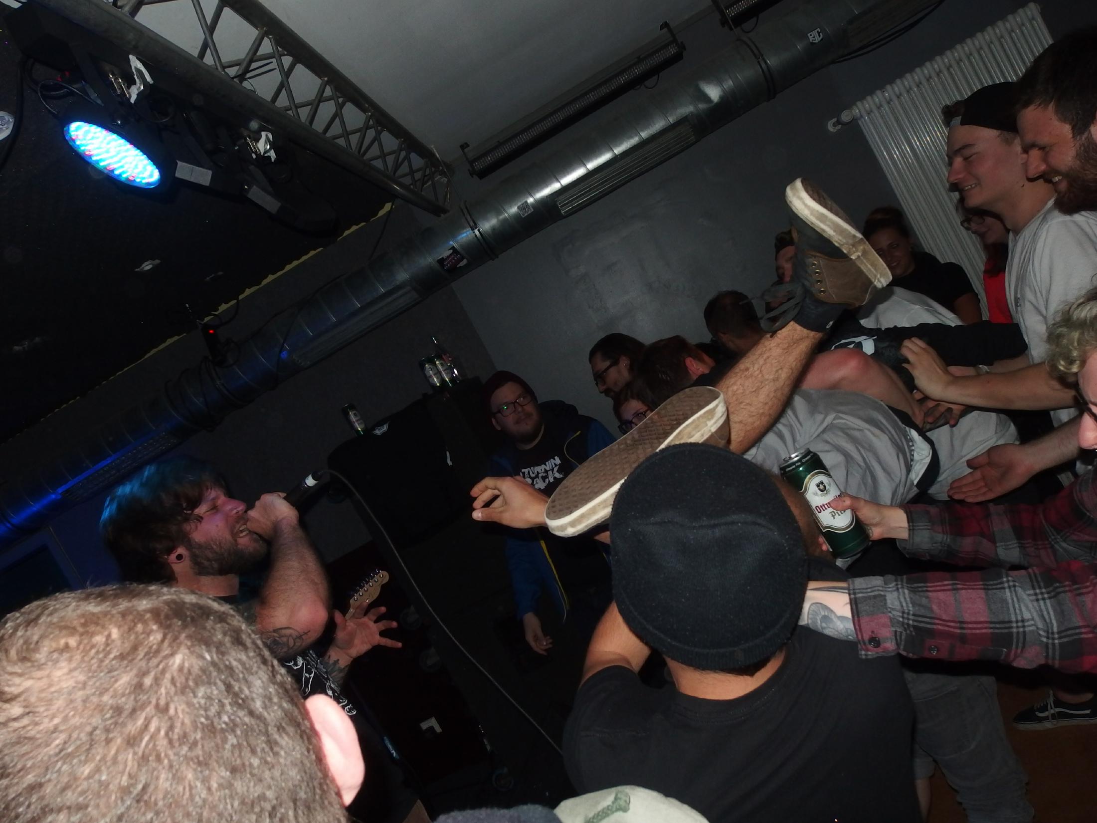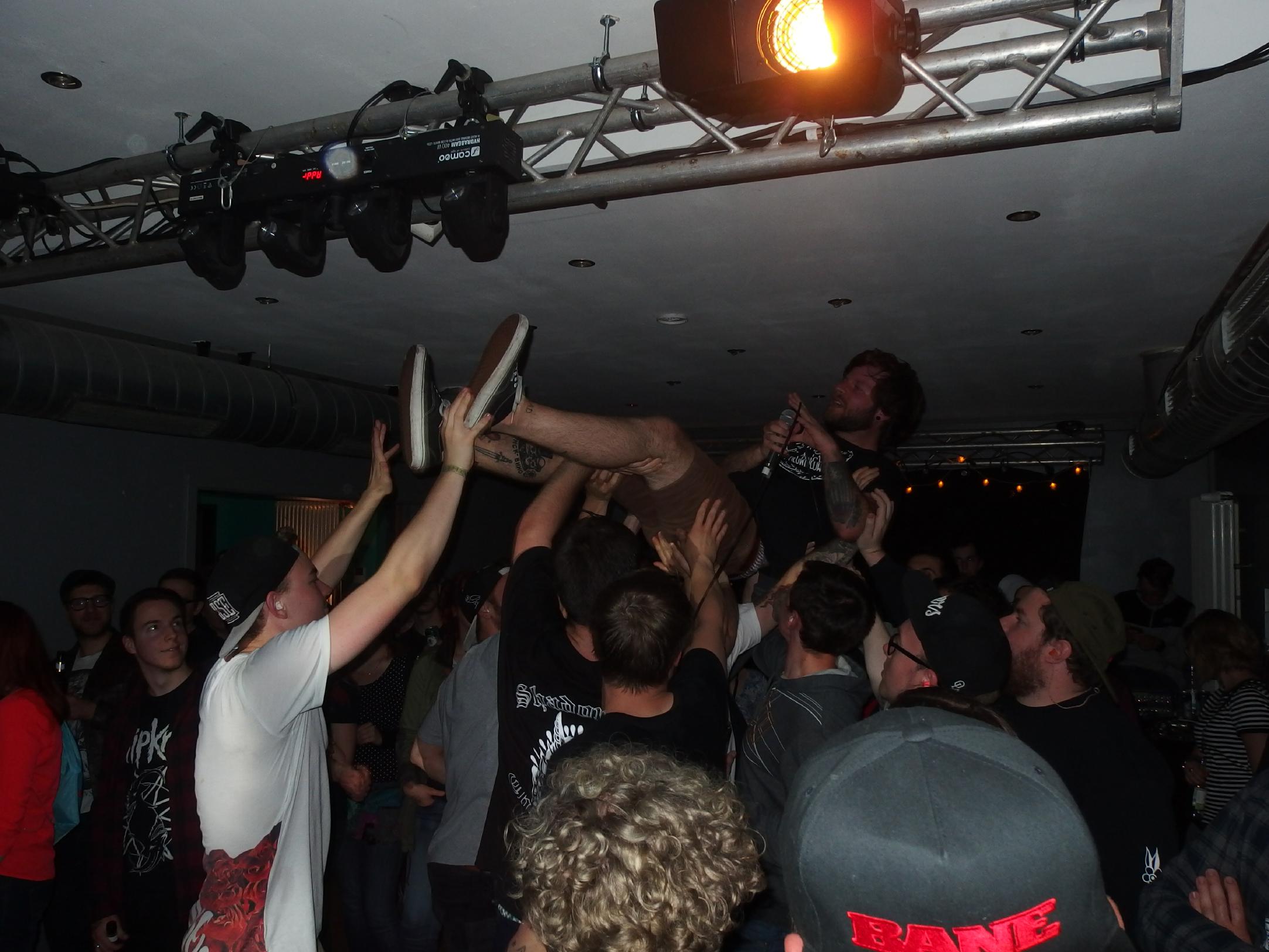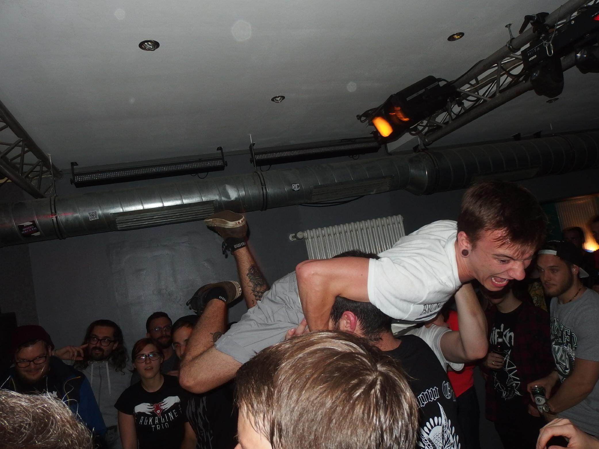 Tides profitierten unerklärlicherweise von den Violent-Dance-Typen, obwohl der Punkrock der sympathischen Saarbrücker Band eigentlich gar nicht zum sonstigen (vermuteten) Musikgeschmack passt. Leider ging diese rege Betriebsamkeit vorne auf Kosten der anderen Fans. Dennoch: sichtlich angestachelt lieferten Tides ihren mit Sicherheit bisher besten Gig ab. Präsentiert wurden sowohl die Tracks des auf Bandcamp erschienenen ersten EP (Download hier) als auch ein komplett neuer, noch namenloser Track. Positiv auch die lustigen Ansagen, die auch thematisierten, dass die Band an diesem Abend mit zwei Schlagzeugern spielen muss, da Neuzugang Lukas im Gegensatz zum wegen Nichtmitragen der neuen kommerziellen Ausrichtung (hust) hinausgeworfenen Vorgängers Lukas noch nicht alle Lieder drauf hatte. Tides sind für größeres bestimmt und haben die richtigen Ideen. Auch dieser Gig endete wieder mit einem Acapella-Outro zu Okland. Danach freute sich der sichtlich mitgenommene Sänger Thomas genauso wie auch ich auf den Headliner.