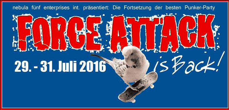 Das Force Attack soll nun 2016 sein Comeback feiern und wie früher üblich im letzten Juli Wochenende stattfinden. So ist das Festival vom 29. bis 31. Juli 2016 geplant. Wo das Festival stattfinden soll und welche Bands spielen sollen, ist bisher noch nicht bekannt.