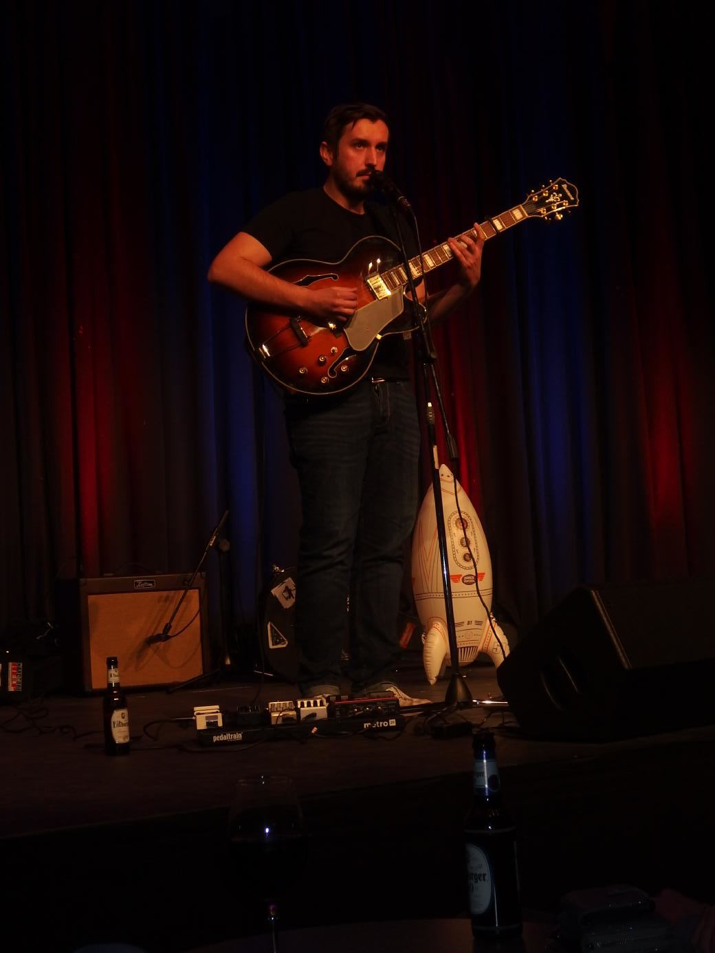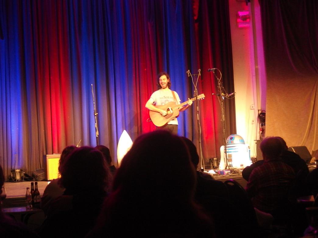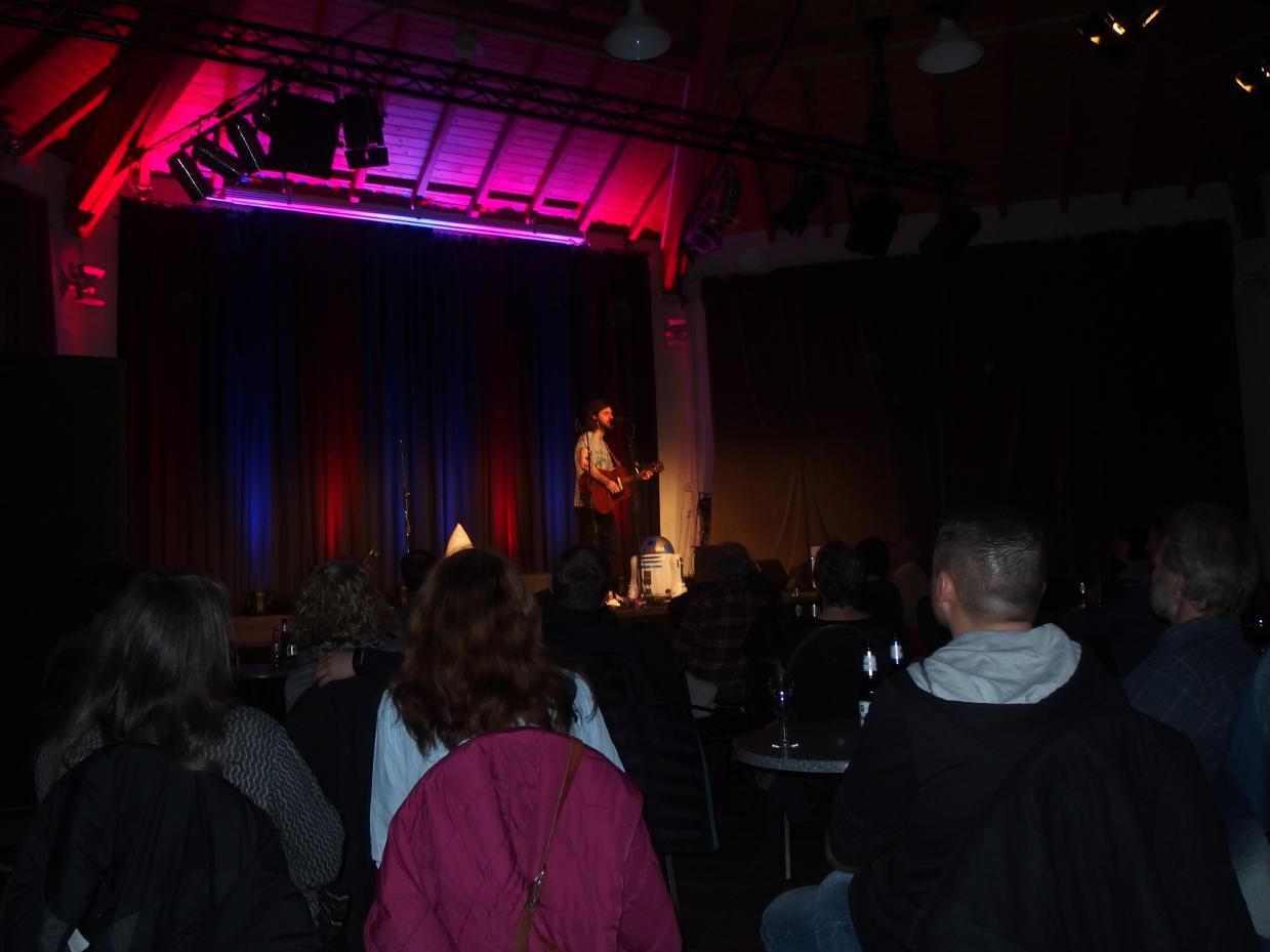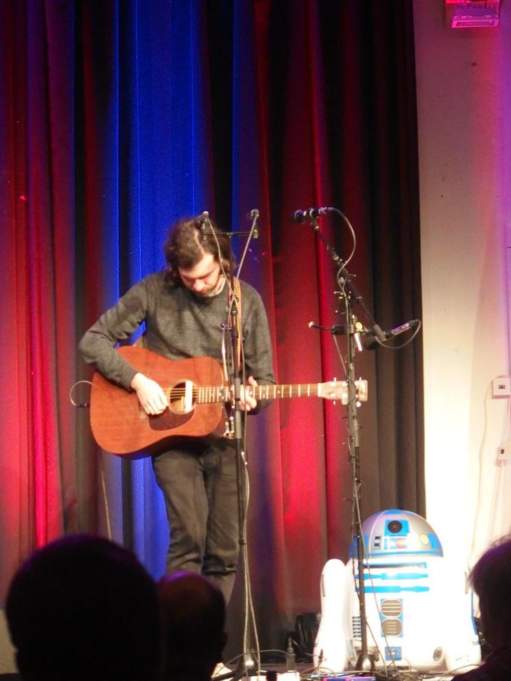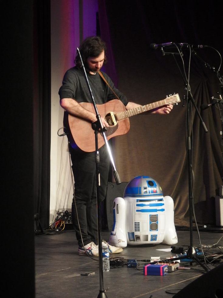 Gregor McEwan hat damit sicherlich nicht so viele Probleme. Immerhin redet er auf der Bühne auch mit Fabelwesen, wie R2D2, den er mit auf Tour nimmt, damit er sich nicht so einsam fühlt. Die aufblasbare Variante passt auch bequem in den Rucksack. Am Anfang hatte ich noch meine Bedenken, denn das erste Lied, da sang er mit so einer hohen Stimme, und ich dachte ich werde mal wieder Opfer davon, mir nie die Künstler anzuhören, die ich besuche. Aber noch mal Glück gehabt, das war der einzige Ausfall (aus meiner Sicht). Aber was dies zeigte: Gregor McEwan hat ein unglaubliches Stimmvolumen. Seine Stimme kann wechseln, nicht nur effektgesteuert, sondern auch im Song. Das Effekltgerät ist trotzdem wichtig, denn so werden Intros angesteuert und die Unterhaltungen mit R2D2 geführt. Ab und an durchbricht auch mal ein E-Gitarrenakkord die Stille. Denn das Publikum, wie Tim auch schon anmerkte, ist an diesem Abend sehr leise, ohne allerdings gelangweilt zu sein. Dafür macht sich McEwan doch etwas über sie lustig, als er beispielsweise Instagram erklärt (ohne zu Wissen, dass der Rezensent gerade dort gepostet hat). Ansonsten lässt er uns aber auch teilhaben an seinem Leben und ruft dazu auf, heute vor allem Schallplatten zu kaufen, denn Midsummer-Records-Boss ist da und der hat die ja schließlich auch released.